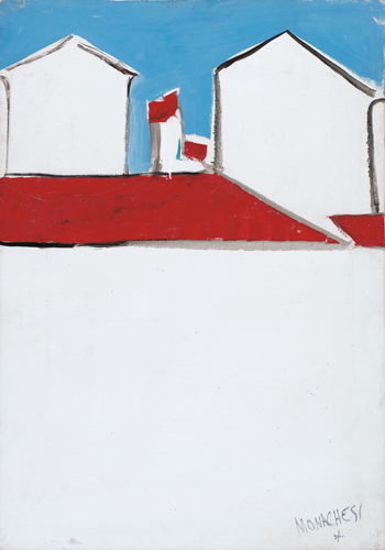 SANTE MONACHESI Macerata 1910 - Roma 1991 Baia Domizia, 1980 acrilico su tela cm. 100x70, firma in basso a destra, opera registrata presso l'Archivio Sante Monachesi come da dichiarazione a cura di Luce Monachesi su foto, pubblicato sul catalogo "Sante Monachesi 1910-1991, l'insolenza", Giacomo Corbelli Editore, 1996, pagina 162.