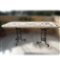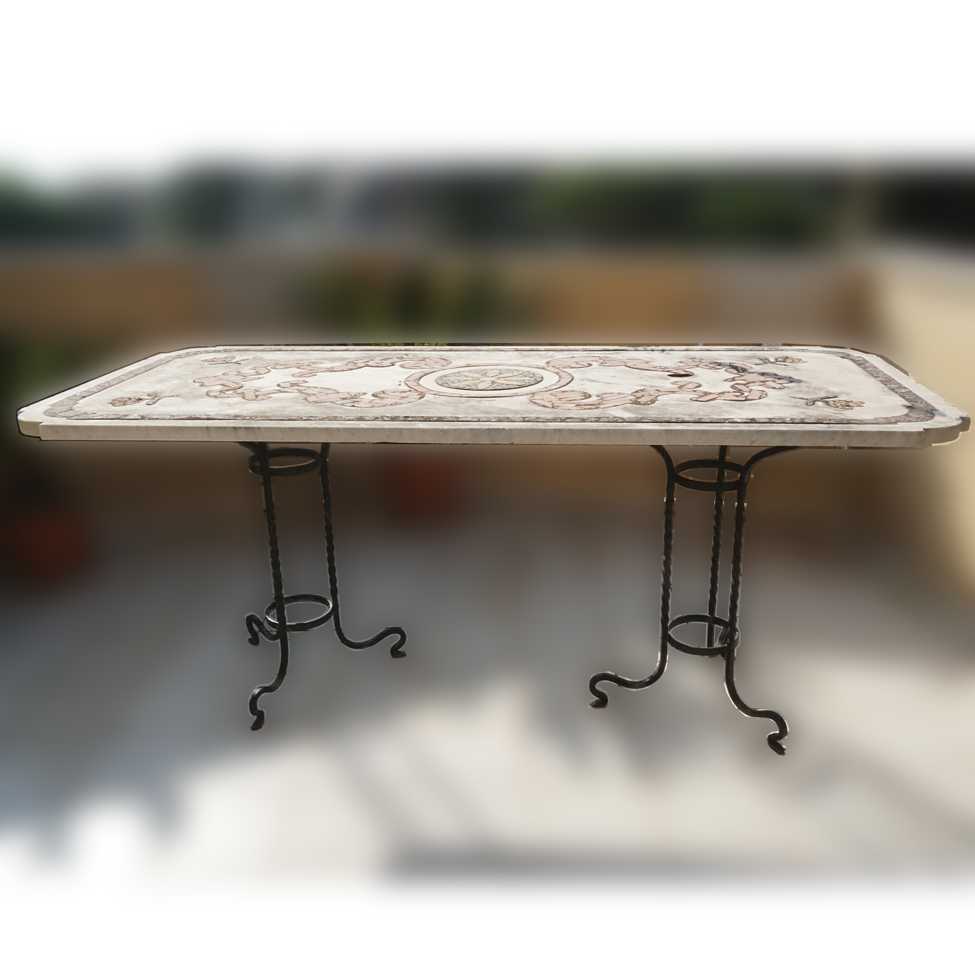 Tavolo con piano rettangolare intarsiato in marmi policromi; sostegni in ferro battuto, cm. 79x185x86.