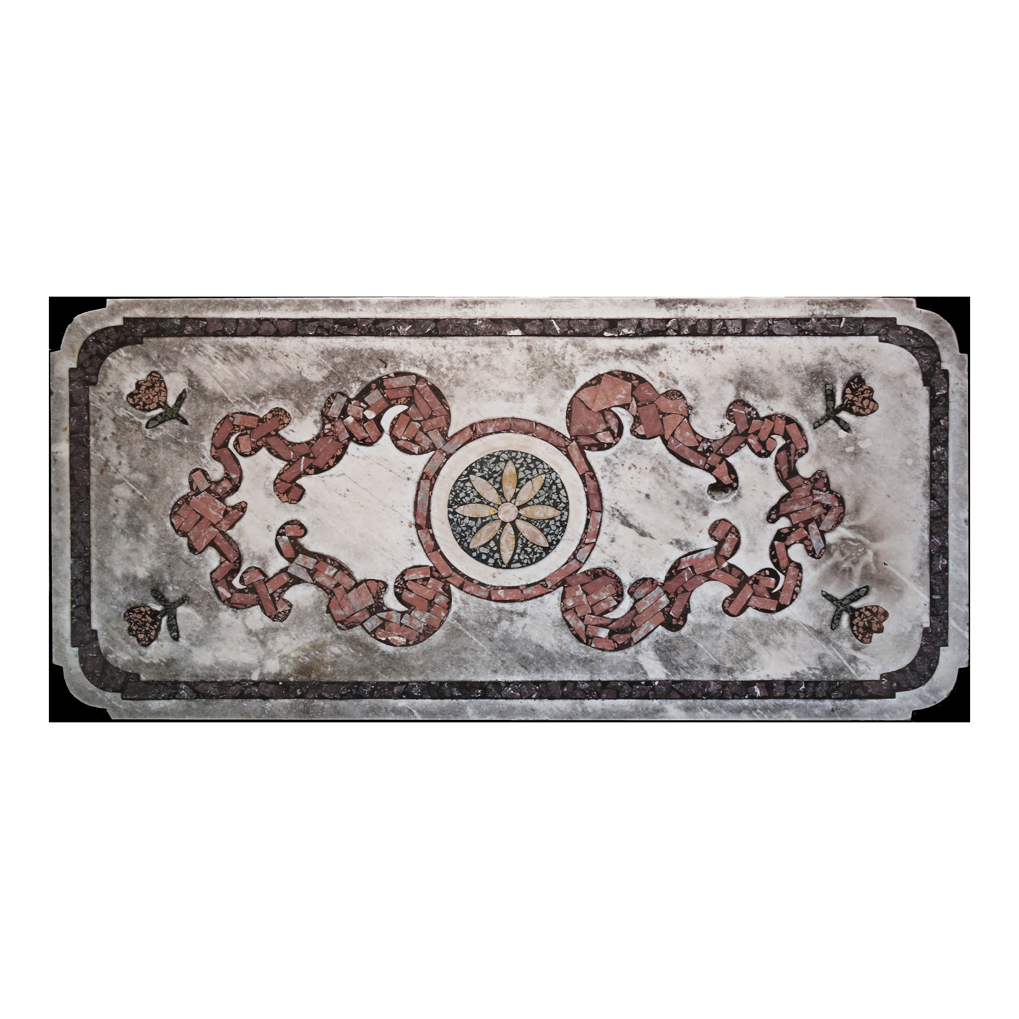 Tavolo con piano rettangolare intarsiato in marmi policromi; sostegni in...