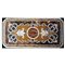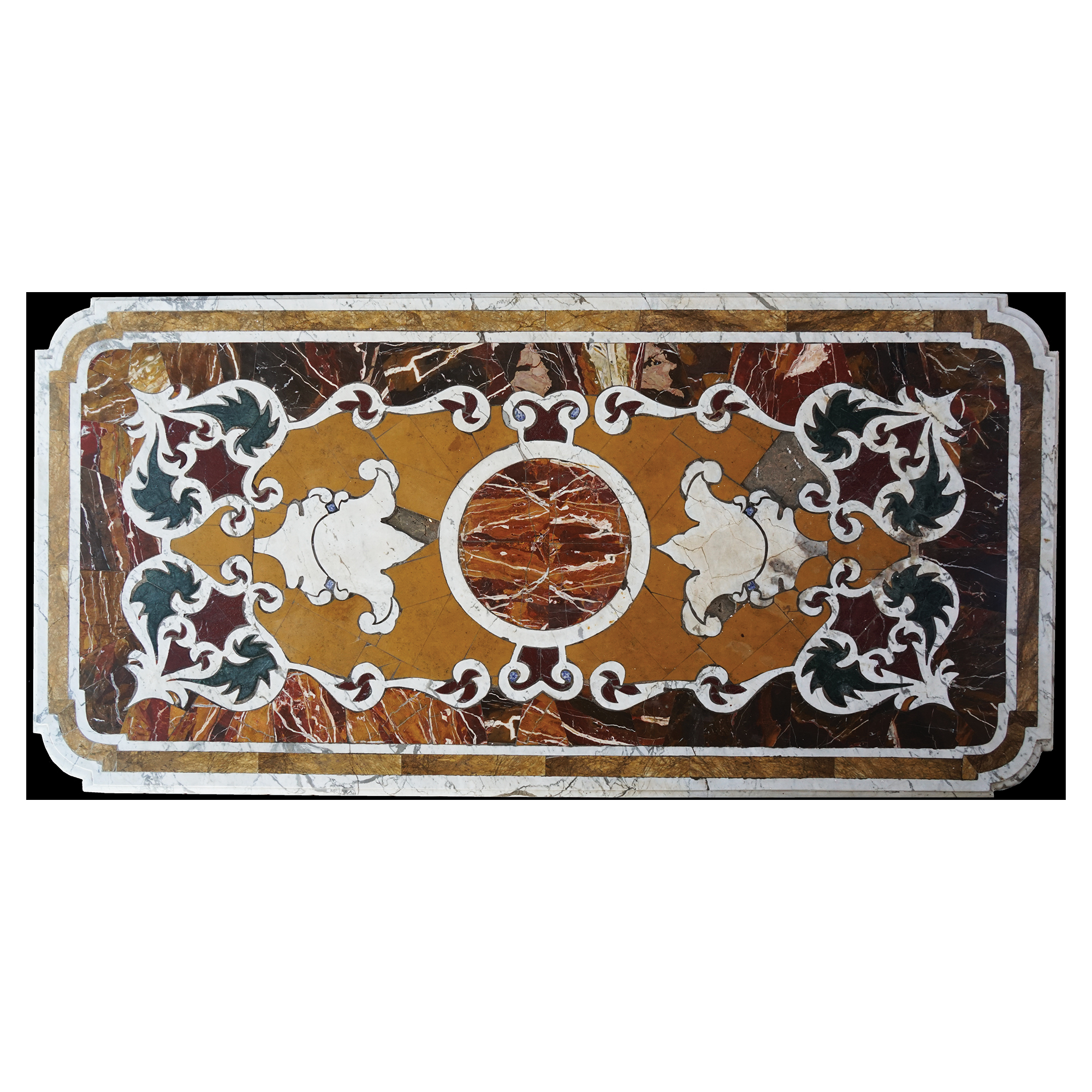 Tavolo con piano rettangolare ad angoli stondati intarsiato in marmi...