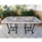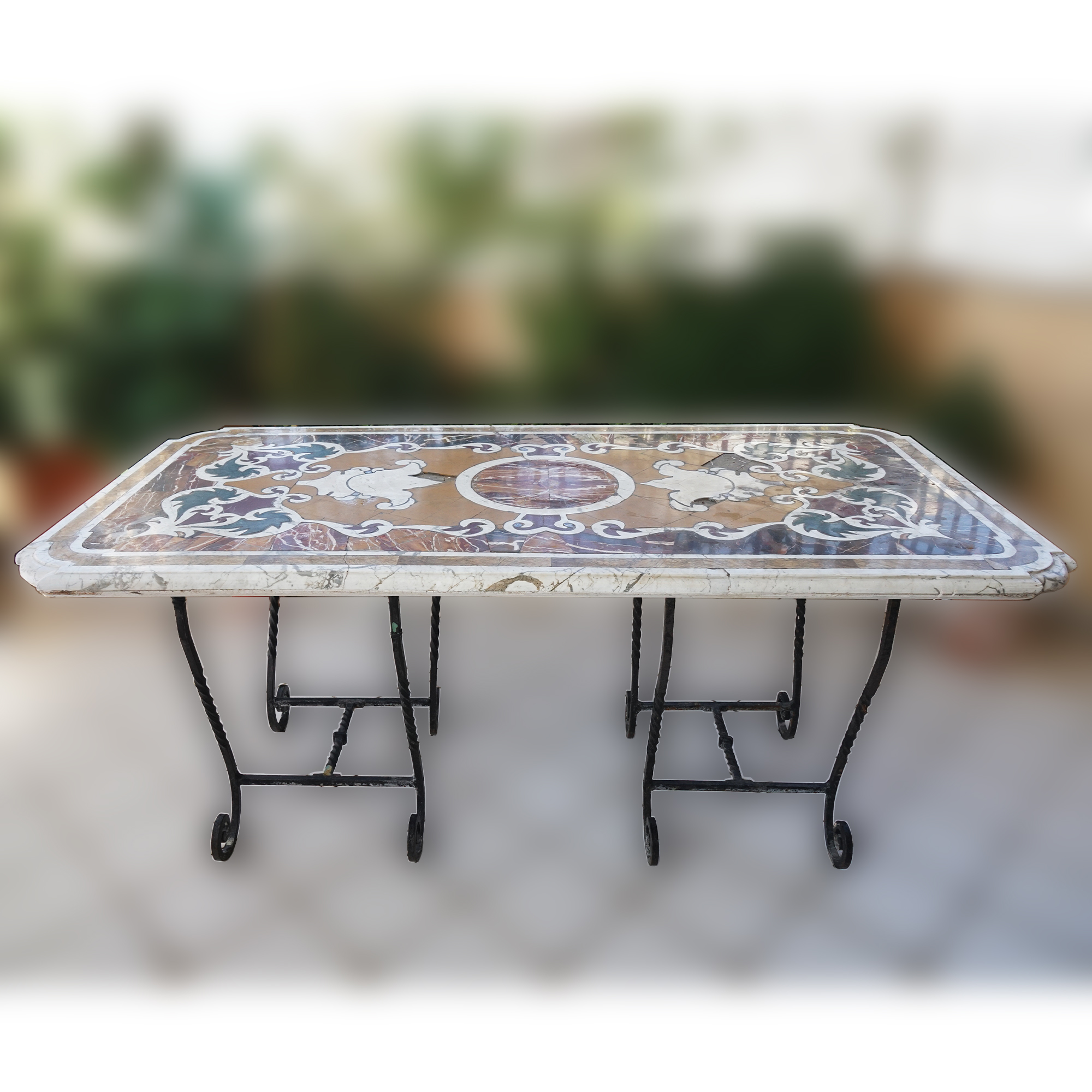Tavolo con piano rettangolare ad angoli stondati intarsiato in marmi policromi; sostegni in ferro battuto, cm. 80x180x89 (mancanze all'intarsio).