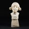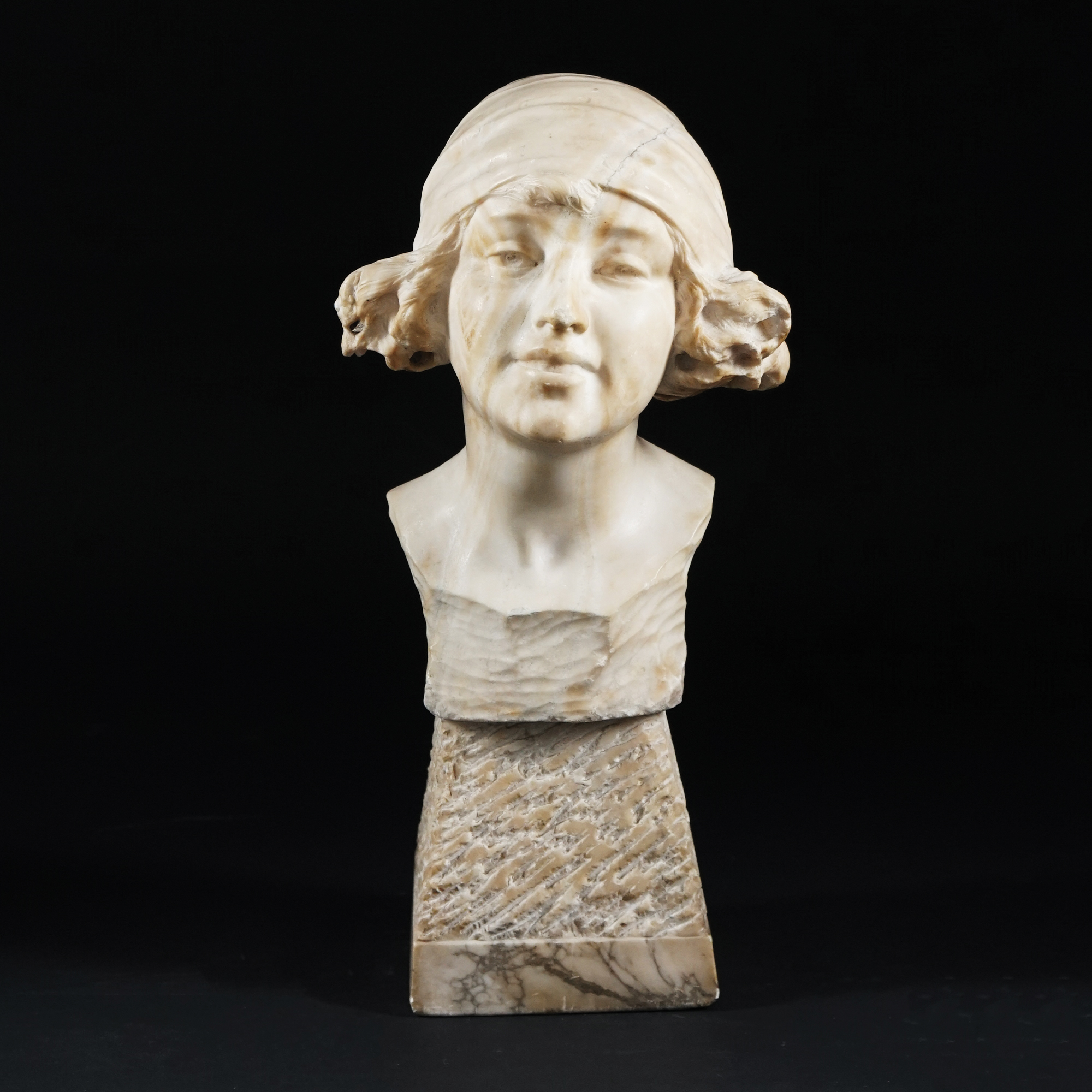 Scultura in alabastro raffigurante un busto di bimba sorridente con cuffia;...