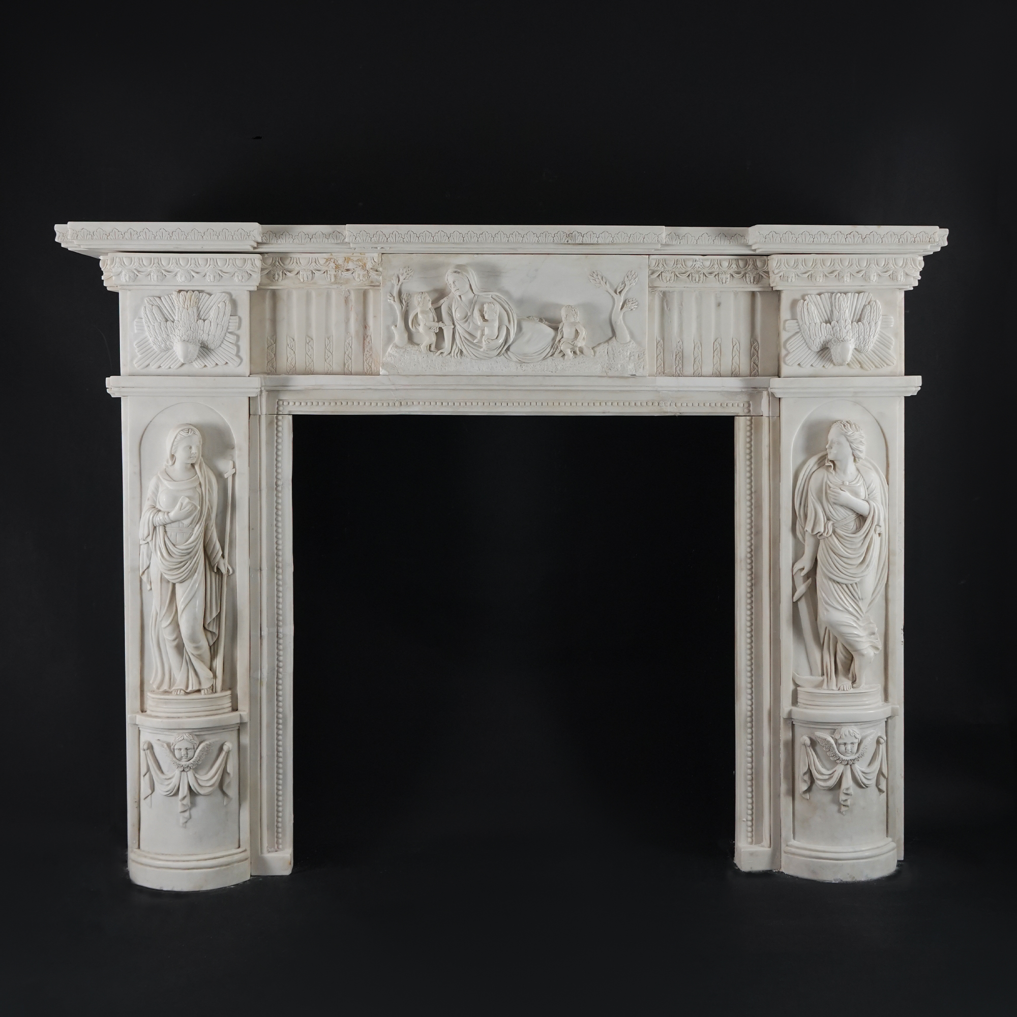 Camino in marmo bianco con montanti scolpiti a figure femminili panneggiate...