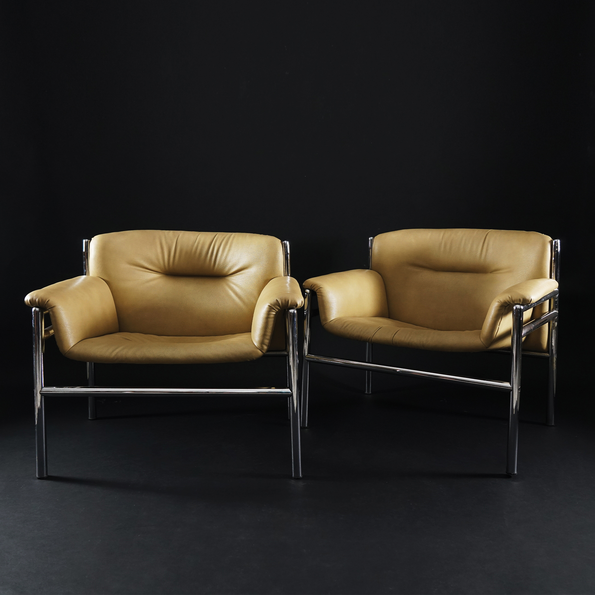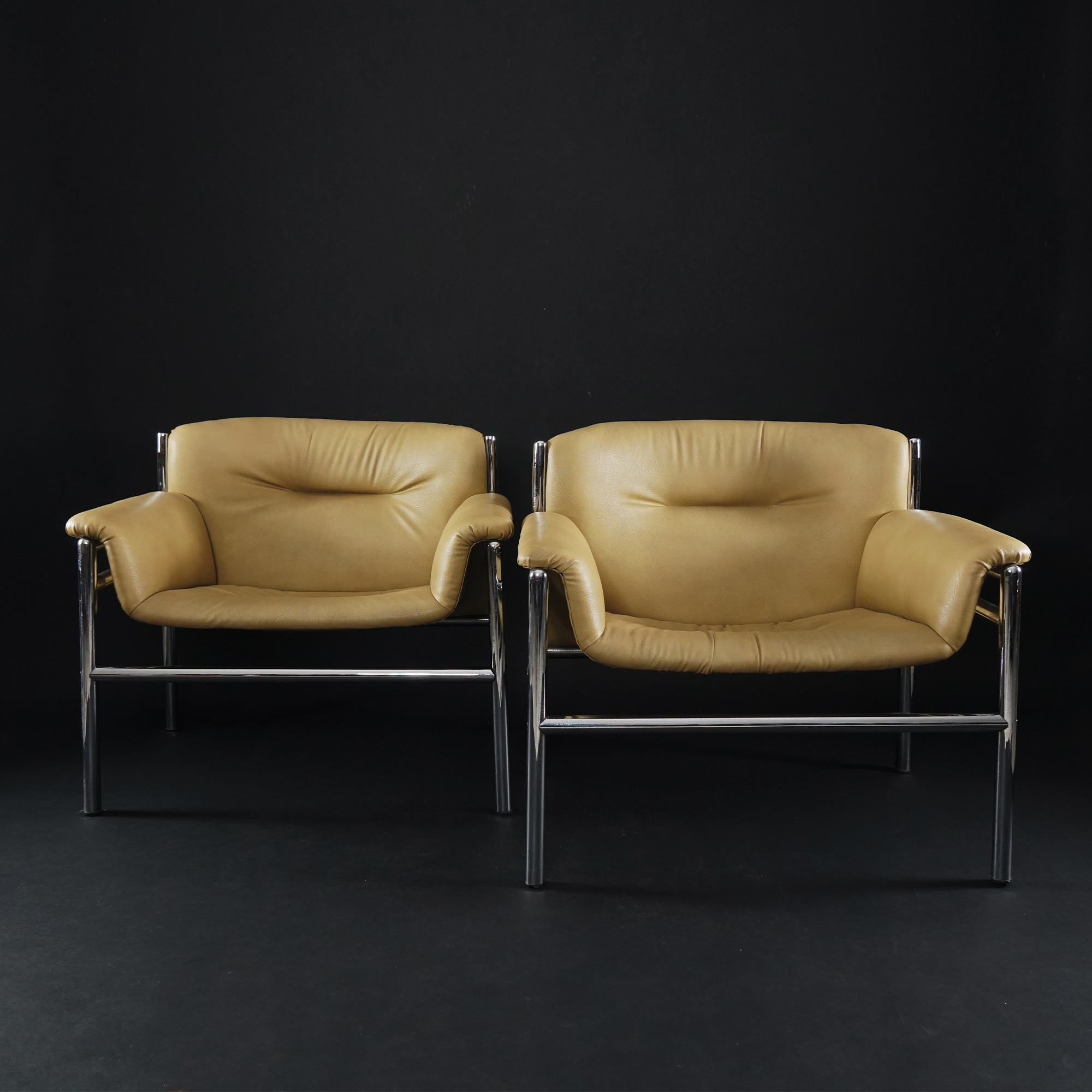 Quattro poltrone con struttura in acciaio cromato imbottite e rivestite di similpelle beige.