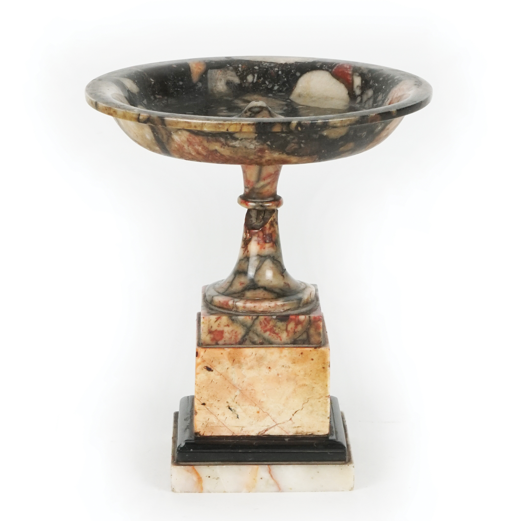 Alzata in marmo africano; coppa circolare su sostegno a campana; base in marmi diversi.