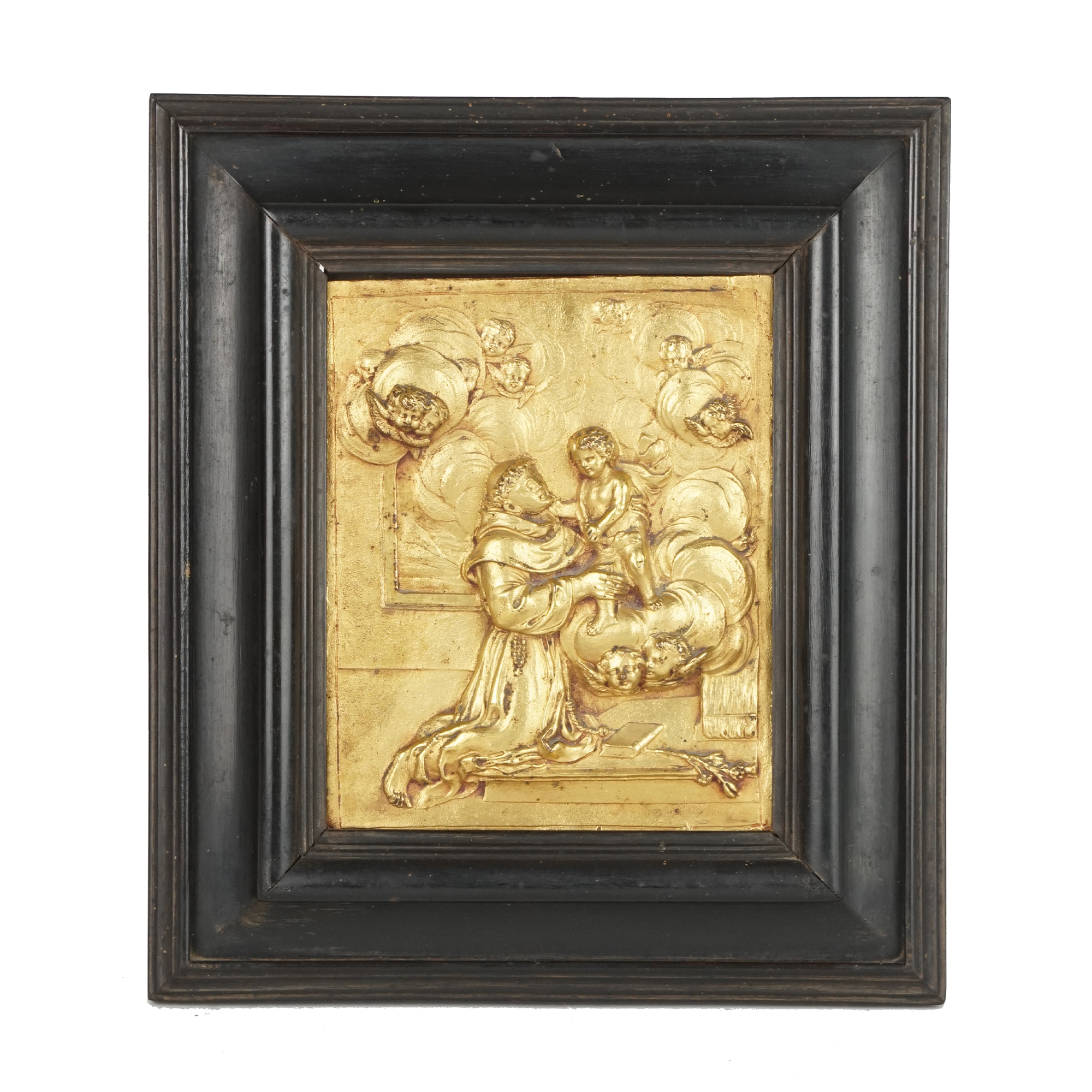 Placca in rame dorato finemente cesellata a raffigurare Sant'Antonio col Bambino.