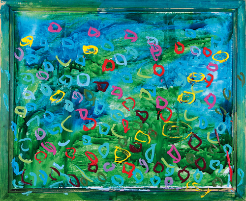 MARIO SCHIFANO Homs (Libia) 1934 - Roma 26/01/1998 Senza titolo, 1984-85 smalto e acrilico su tela con cornice dipinta cm. 90,5x110,5; firma ed etichetta della Fondazione M.S. Multistudio al retro, opera registrata presso l'Archivio della Fondazione M.S. Multistudio (Roma) come da dichiarazione su certificato con foto allegata.