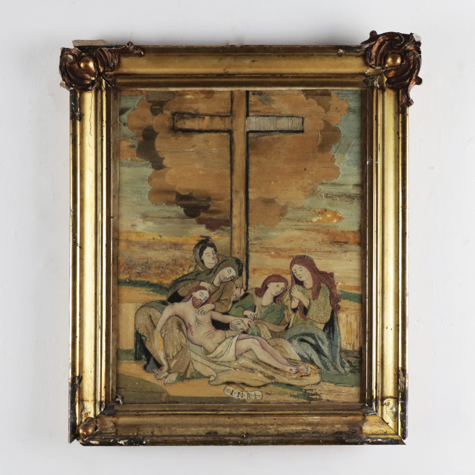 Ricamo in fili policromi in parte dipinto a tempera, raffigurante La Deposizione.