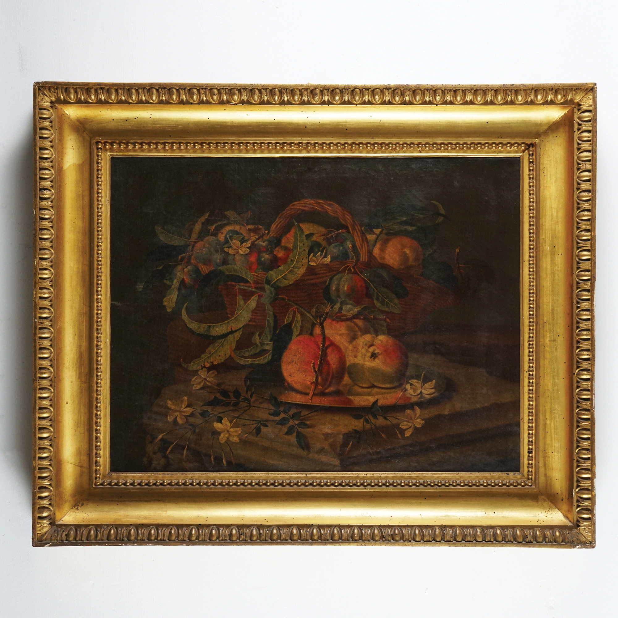 Pittore del XIX secolo Natura morta con cesto di frutta, pesche e una mosca...