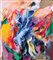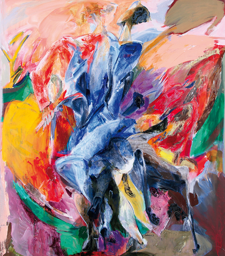 ENNIO CALABRIA Tripoli (Libia) 07/03/1937 Mutante gioioso, 1999 olio su tela cm. 150x130, firma e anno in basso al centro, titolo, firma, anno, etichetta e timbri dello Studio d'Arte Campaiola (Roma) al retro.