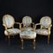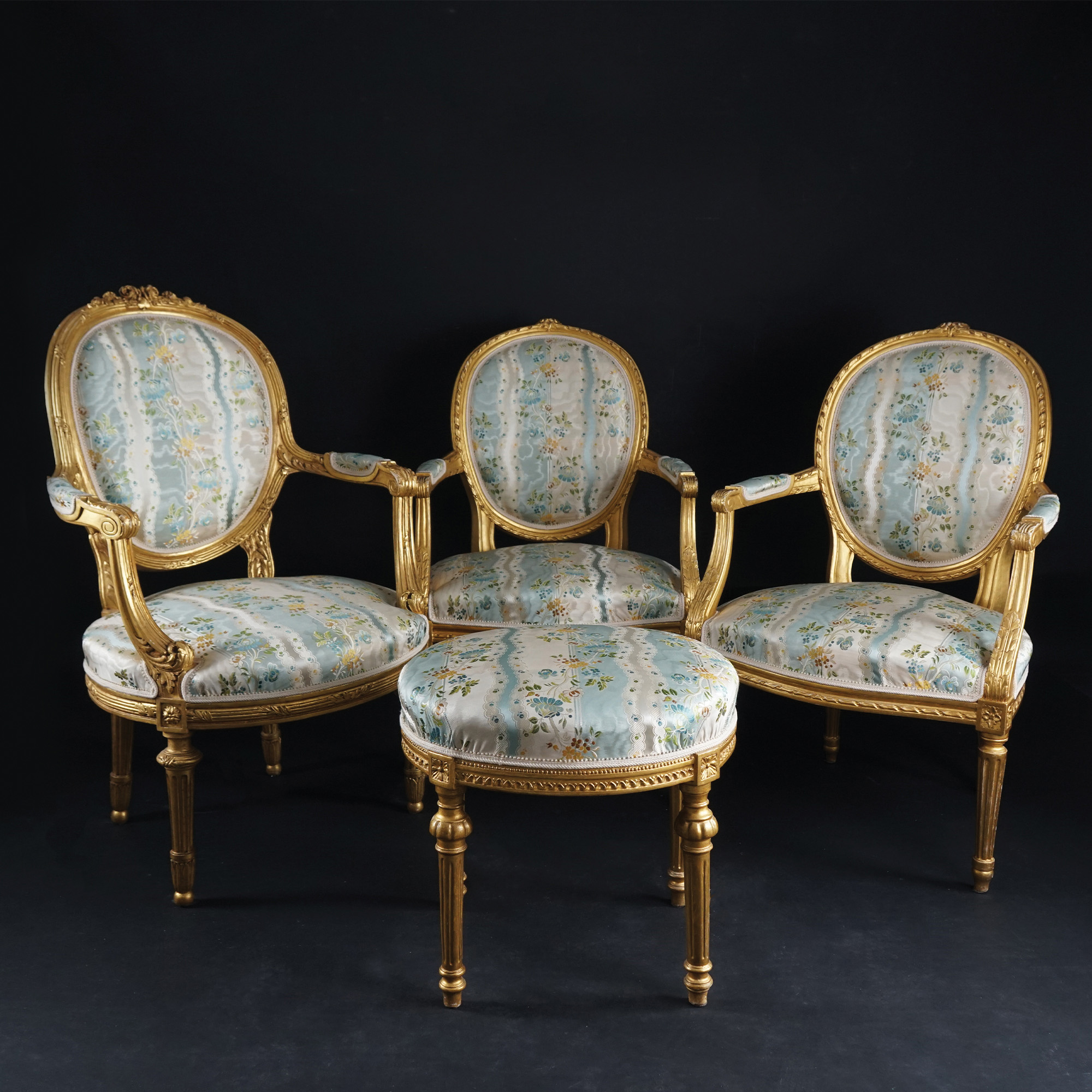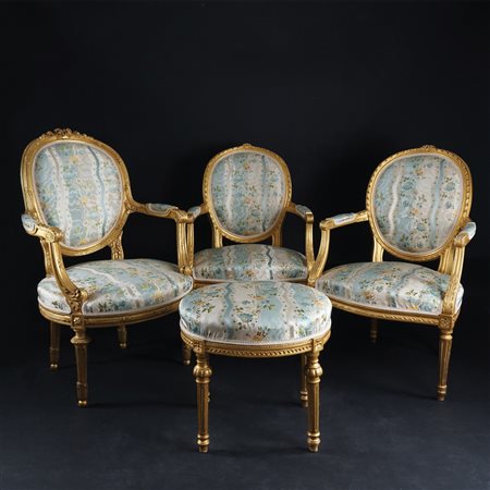 Coppia di poltrone in legno dorato scolpito lungo tutta la struttura lignea a nastrino ritorto UNITA a uno sgabello e a una poltrona di fattura similare; schienale ovale; braccioli e montanti degli stessi a voluta; gambe troncoconiche scanalate. Sedute e dosselli imbottiti.