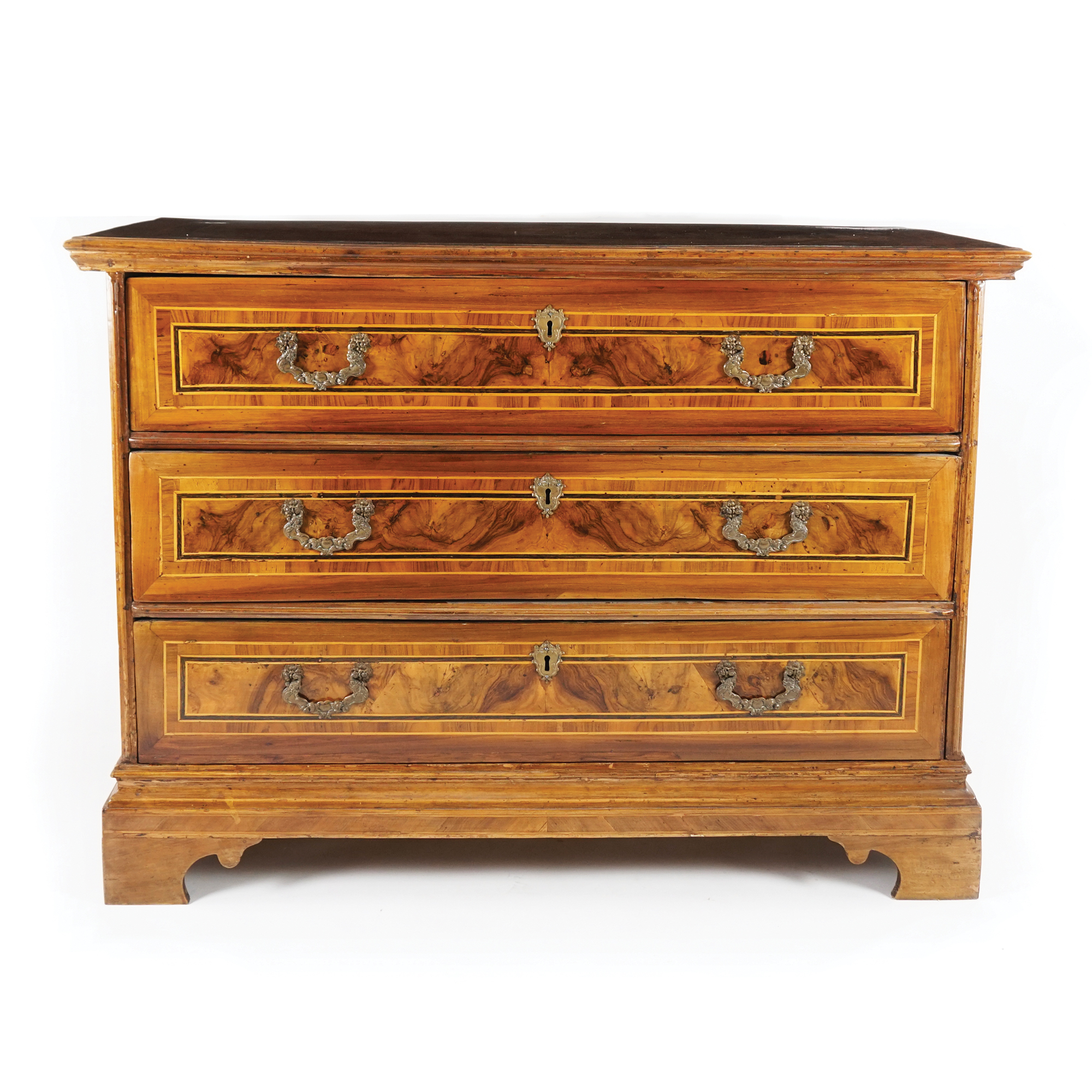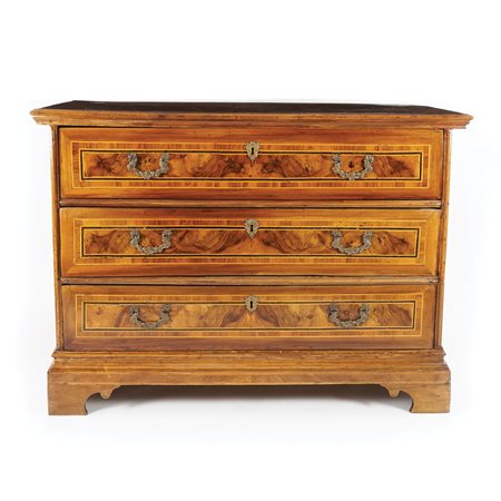 Cassettone lastronato in noce; piano rettangolare filettato in acero così...