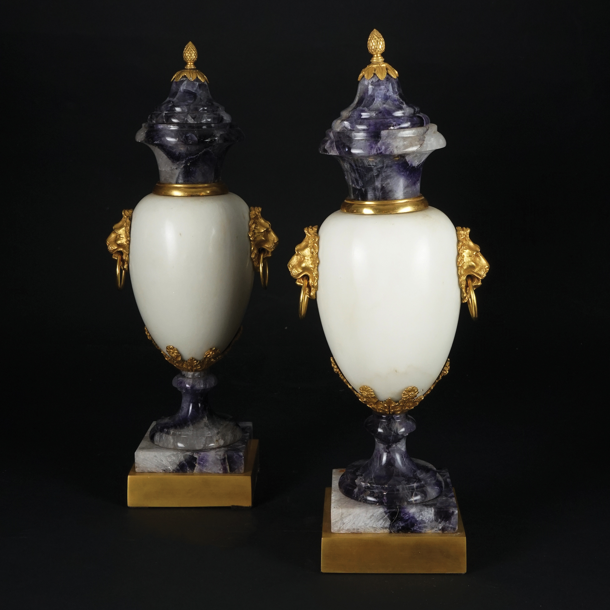 Coppia di potiches con coperchio in blue john e marmo bianco montate in bronzo dorato e cesellato. Corpo ovoidale con prese in forma di testa di leone trattenente un anello; presa del coperchio in forma di pigna; piede quadrato.