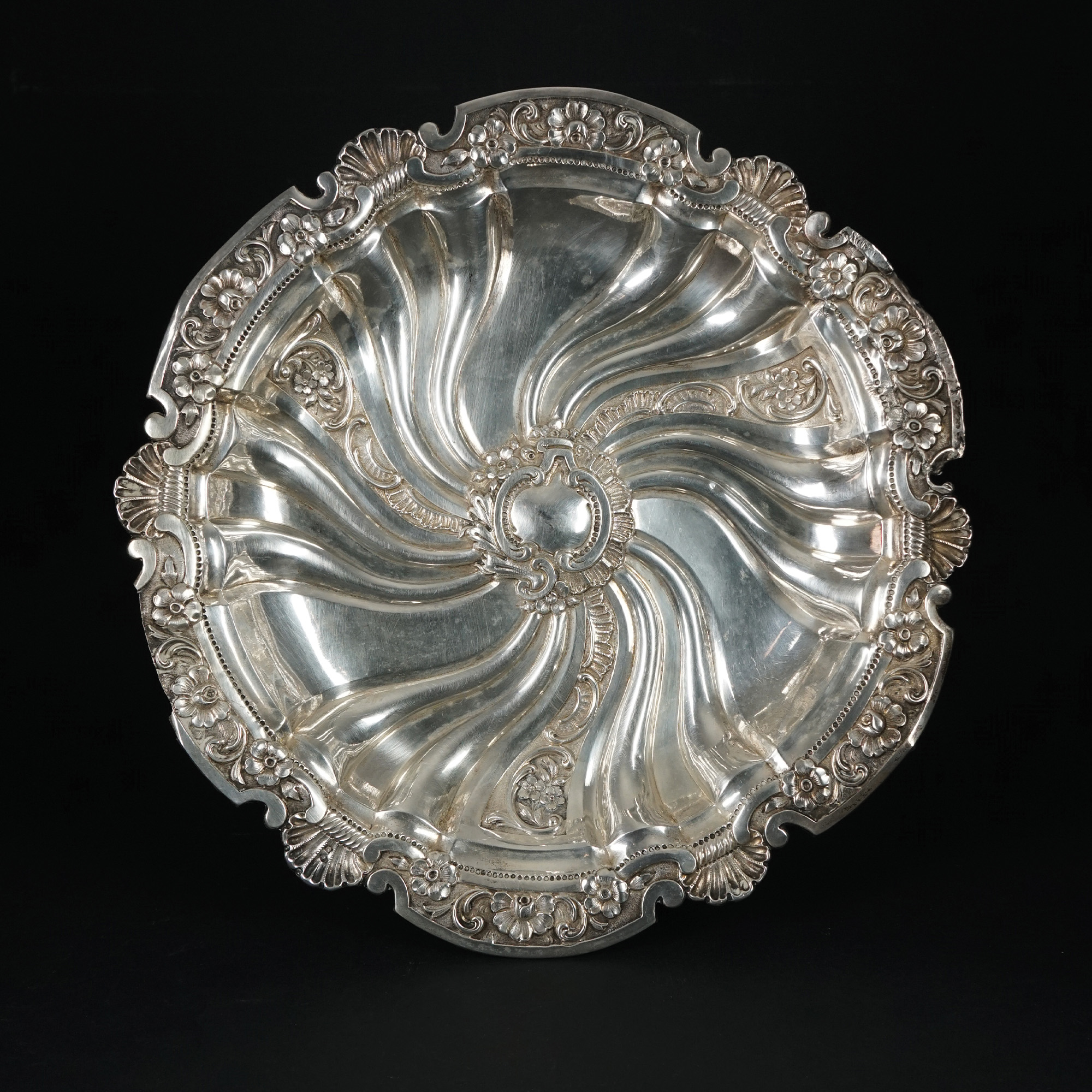 Centrotavola di forma circolare in argento 833/1.000 sbalzato a motivi elicoidali.