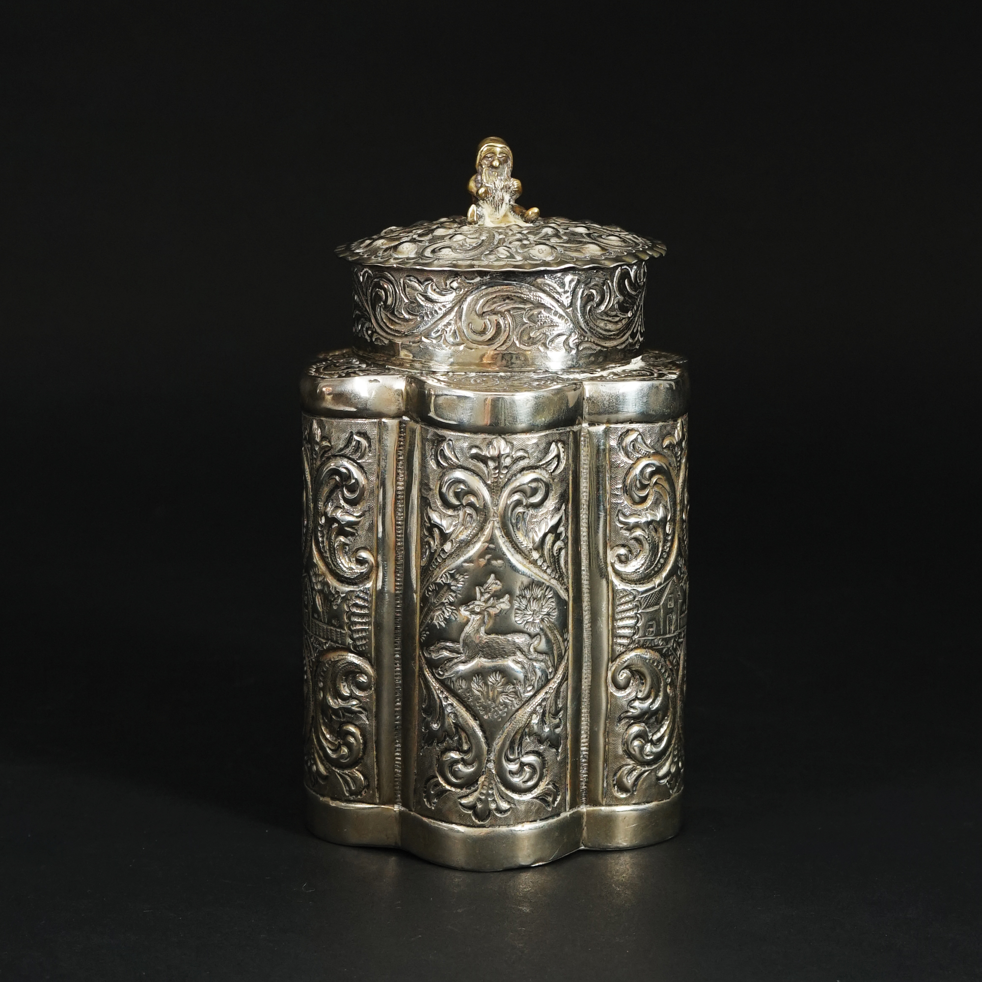 Tea caddy in argento a superficie sbalzata a raffigurare animali silvestri alternati a casolari entro riserva tra motivi vegetali; corpo polilobato; coperchio con presa a figura di nanetto in argento dorato.