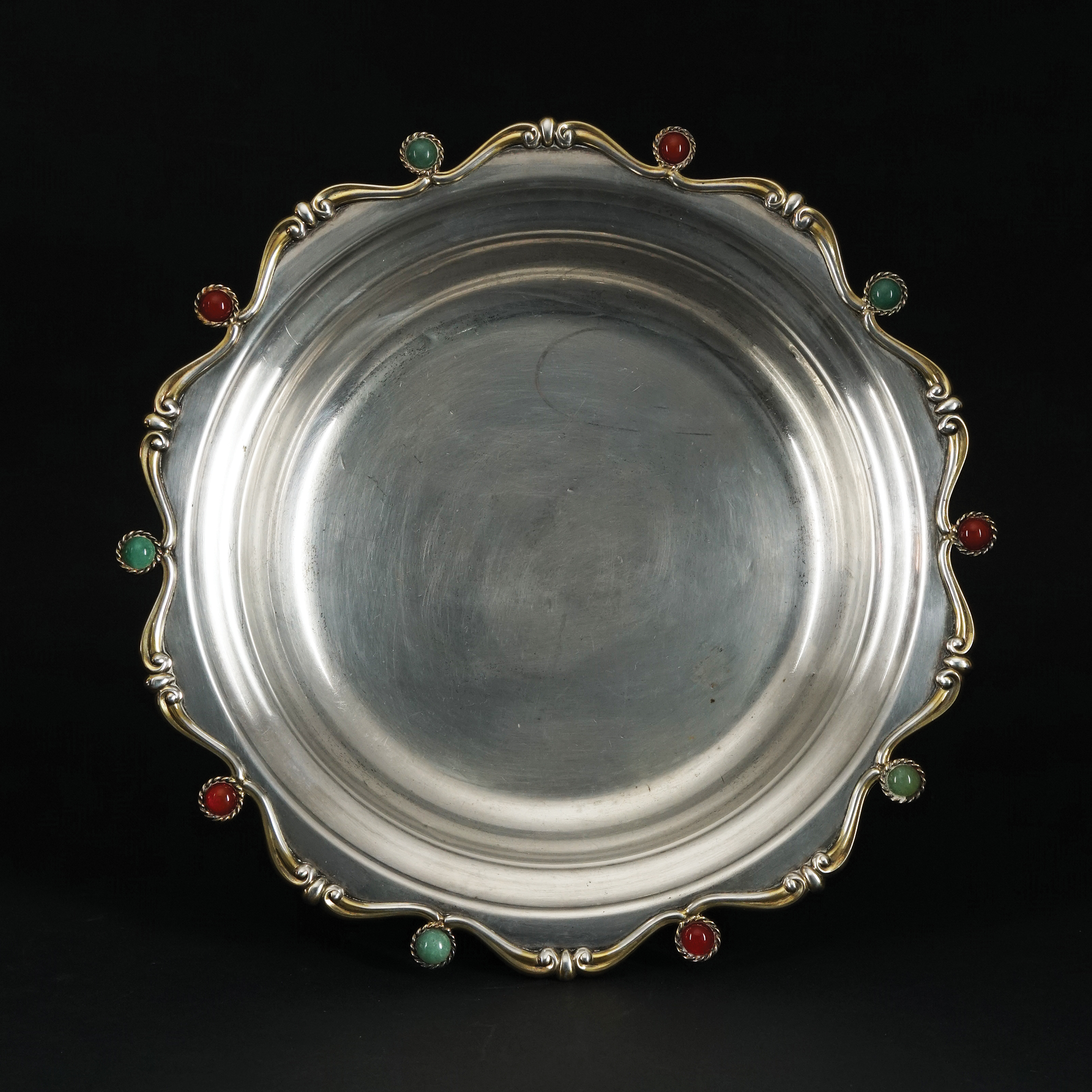 centrotavola di forma circolare in argento a superficie liscia con profilo del bordo centinato decorato da pietre dure.