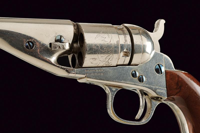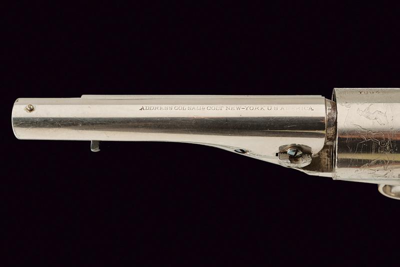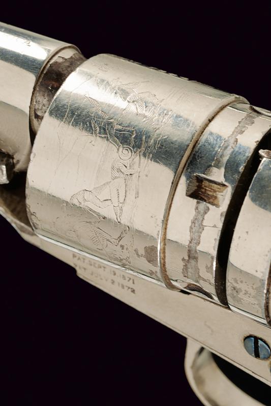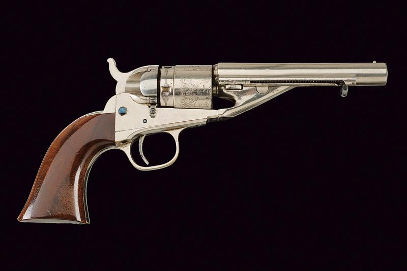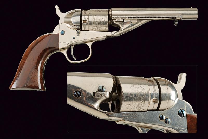 Colt 1862 Pocket Navy, Conversione Rimfire, con estrattore, datazione: 1873 - 1875 provenienza: USA, Canna tonda rigata da 4-1/2', con mirino, marcatura in una riga. Cal. 38 rimfire. Tamburo ribassato con incisione della diligenza, a cinque colpi, marcato 'COLT'S PATENT 7884'. Meccanica funzionante. Matr. '61xx' su canna, castello, ponticello e cornice dell'impugnatura. Marcature dei brevetti sul lato sinistro. Ponticello marcato '38 cal'. Nichelatura antica al 95%. Impugnatura in noce liscia. lunghezza 25.5 cm.