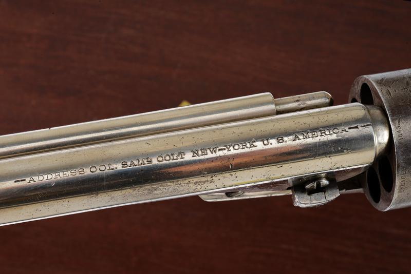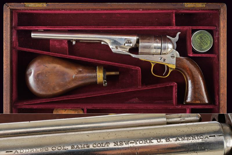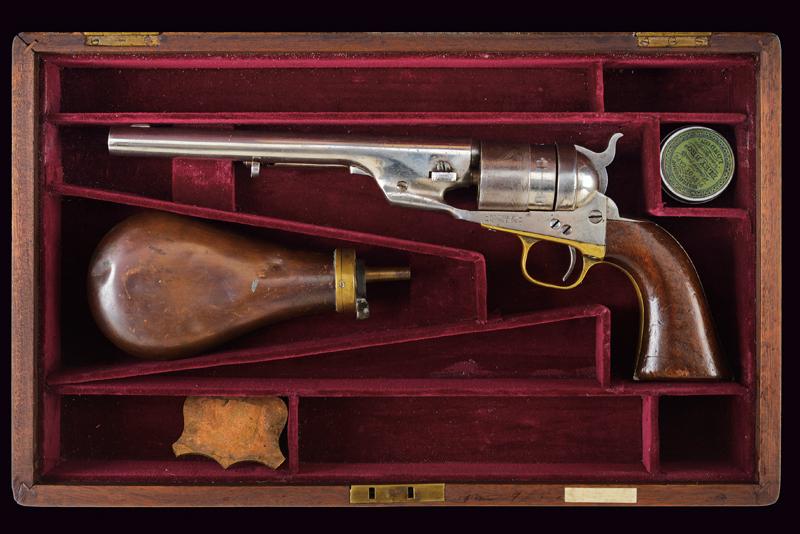 Raro Richards Conversion Colt 1860 Army revolver, datazione: Terzo quarto del XIX Secolo provenienza: USA, Modello di transizione (Second Model o Type II) fra il Richards e il Richard-Mason; dotato di canna ed estrattore del primo tipo, conversione e cane del secondo. Con canna rigata da 8 pollici, con anima in ottime condizioni, cal. 44 Colt centerfire. Brevetti del 1871 e 1872 marcati sul fianco sinistro del castello. Conserva il 50% della finitura nichelata originale. Guancette in legno verniciato; incisione navale sul tamburo ben definita e di qualità. In cassetta di legno foderato non pertinente. Prodotto in soli novemila esemplari. Vedi 'Flayderman's Guide': 5B-119. lunghezza 36.5 cm.
