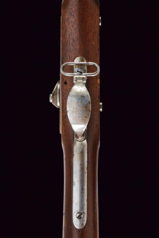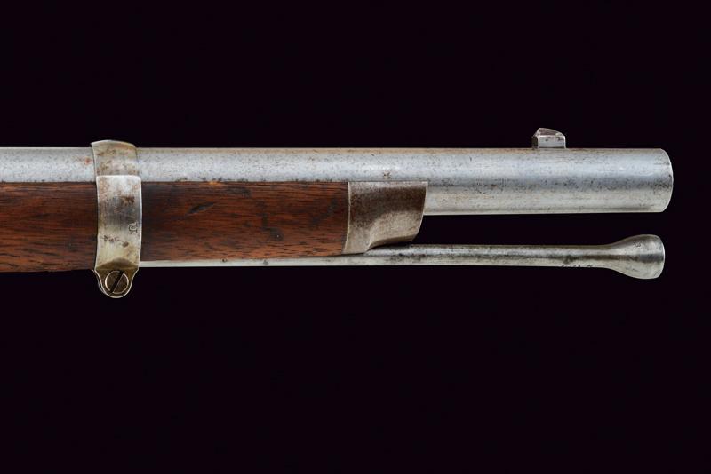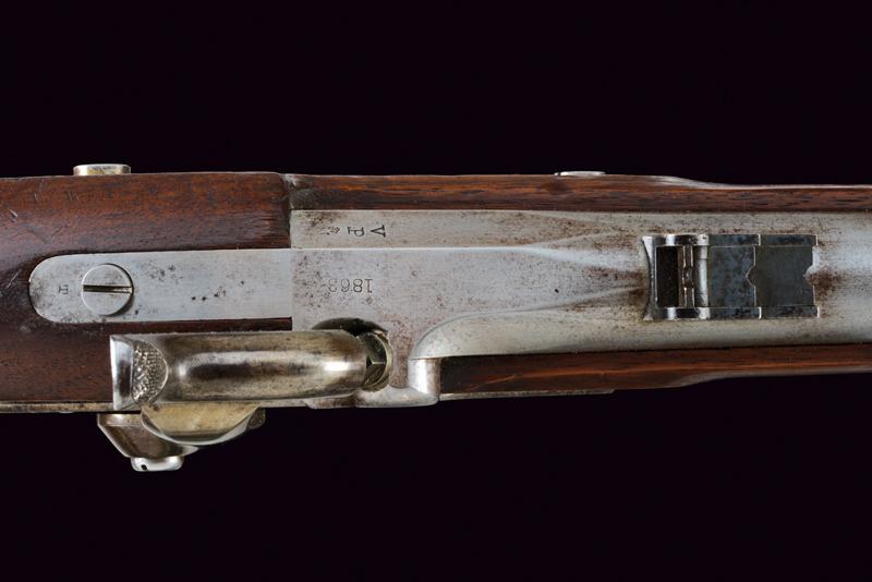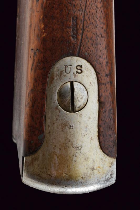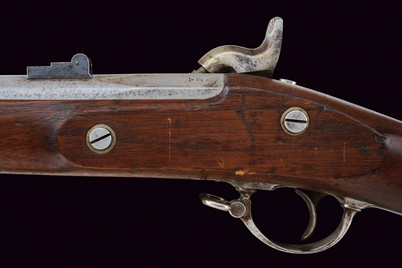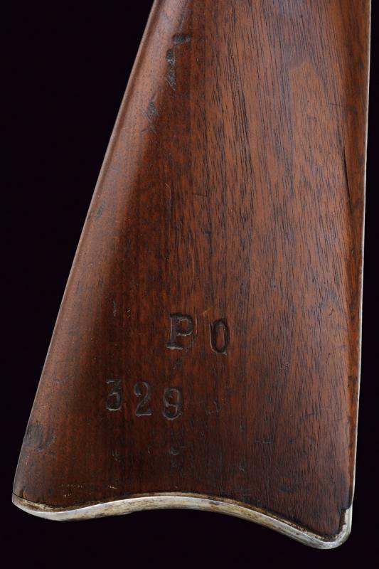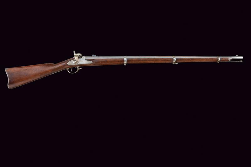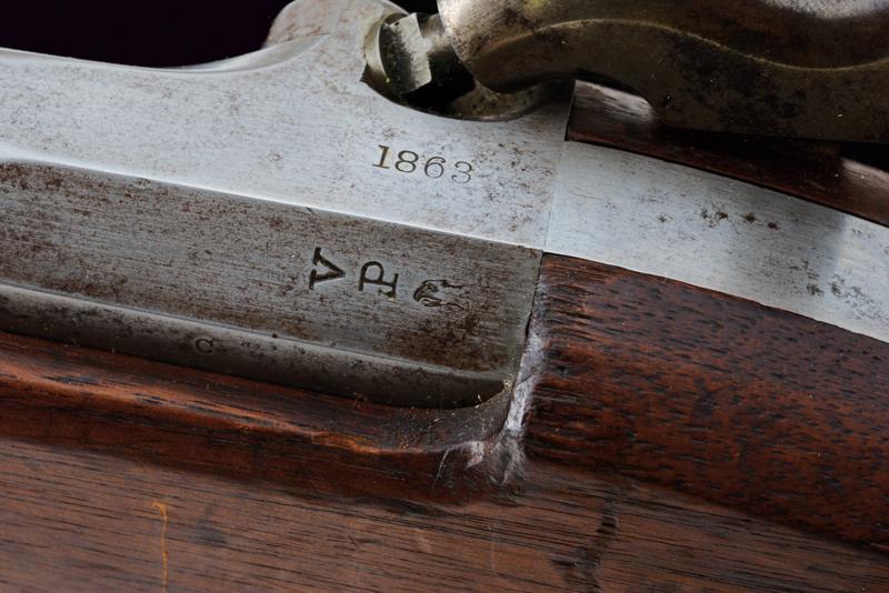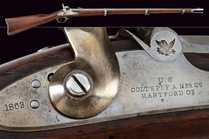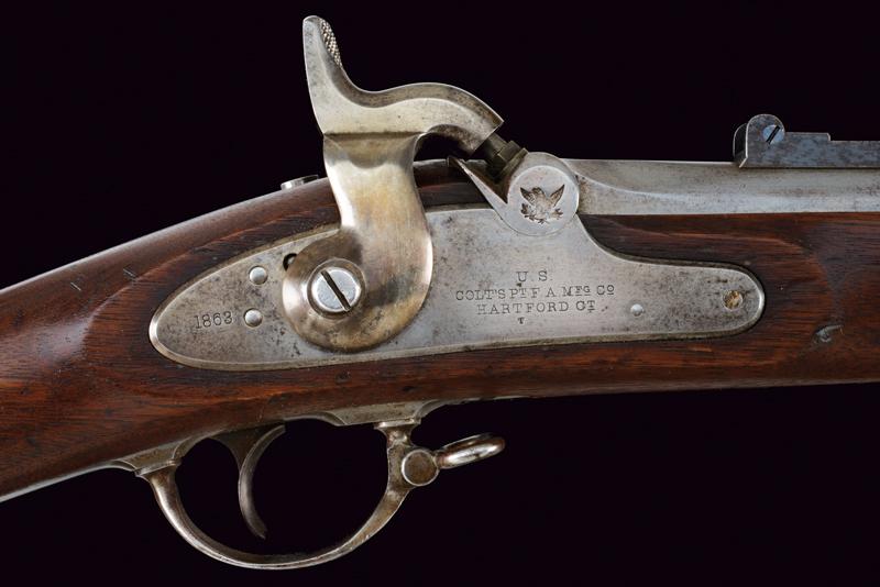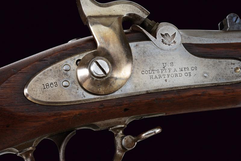 Interessante Colt Model 1861 Special Musket, datazione: 1863 provenienza: USA, Canna tonda, rigata (rigatura ancora visibile), con base ottagonale marcata '1863', 'V', 'P', 'C' e con eagle head, alzo variabile e mirino, cal. 15 mm; batteria a molla in avanti marcata 'US COLT'S PT.T A MFG C.O HARTFORD CT.' e con anno '1863'; cassa intera in legno (calcio marcato 'P O 329', e con vari timbri) con fornimenti e bacchetta in ferro, coccia marcata 'US'. lunghezza 142 cm.