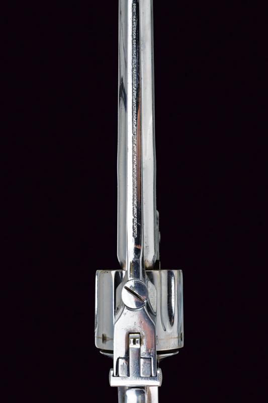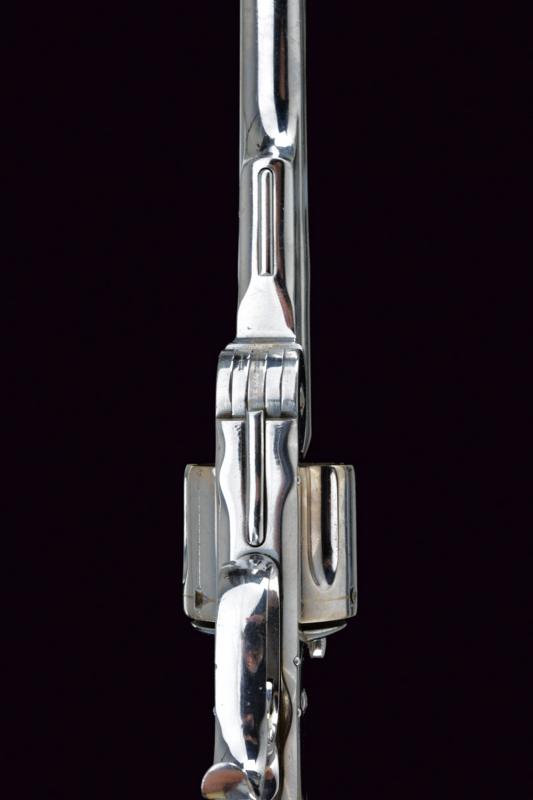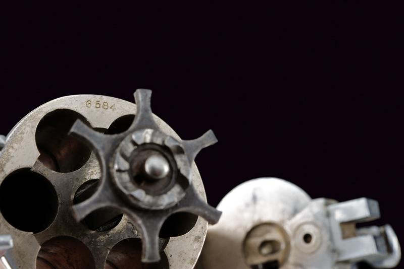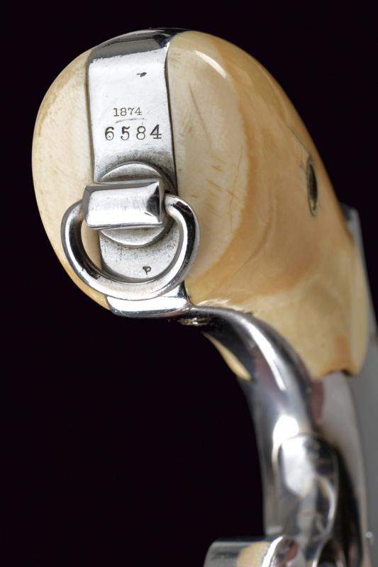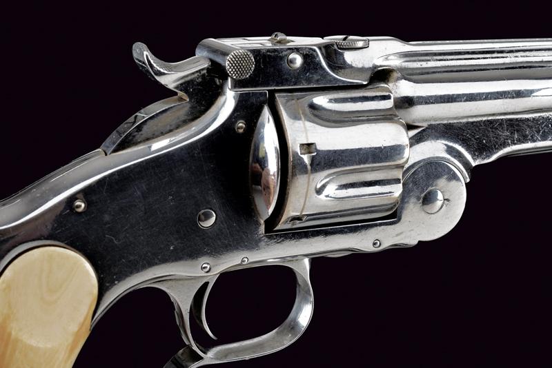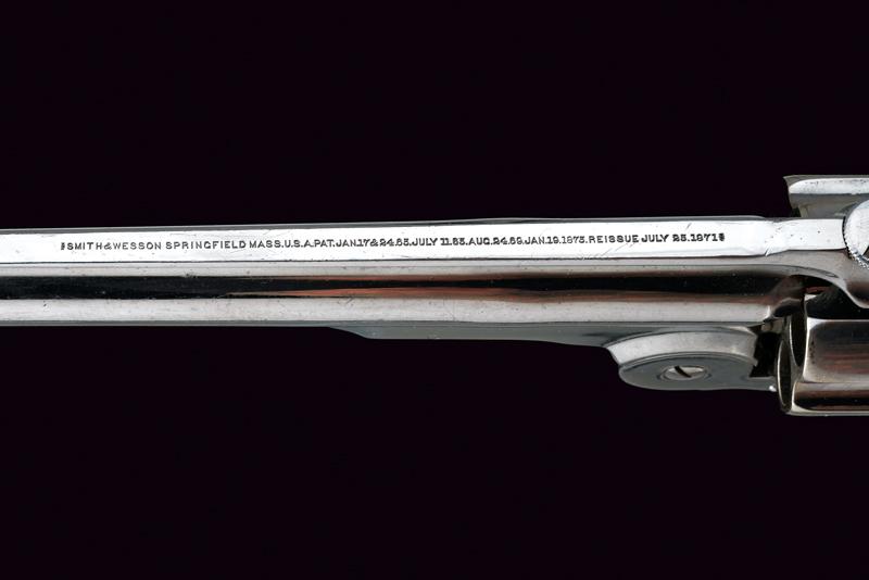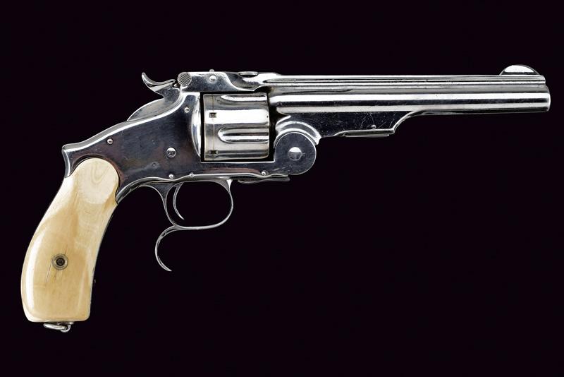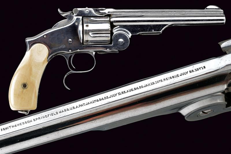 Rara S&W Third Model Russian revolver, datazione: 1874 provenienza: USA, Canna tonda da 6-1/2', con mirino lavorato in un unico pezzo con la bindella. Al dorso la marcatura della ditta con brevetti sino al 1875 e la rara dicitura 'REISSUE JULY 25.1871'. Cal. 44 Russian. Tamburo scanalato a sei colpi. Meccanica funzionante. Interno della canna con rigatura visibile e aree di pitting. Lieve gioco della canna. Ponticello con poggiadito. Guancette in avorio. Anello porta correggiolo. Impugnatura datata '1874' e con matricola in quattro cifre '65xx', la stessa matricola è presente sulla canna, sul suo gancetto e sul tamburo. Incisioni a freccia sulla bascula. Forse tracce di un punzone sul fondo dell'impugnatura. Sono stati prodotti in tutto 9000 esemplari con la dicitura 'REISSUE', numerati a parte da 1 a 9000. In questa serie speciale erano inclusi sia Second Model Russian che Third Model Russian, realizzati prevalentemente per i contratti Turchi e Giapponesi e per i mercati civili. Si potrebbe trattare di un rarissimo Third Model giapponese (1000 in tutto prodotti) per il mercato civile, vista la mancanza di marchi militari e il cal. 44 Russian che in Turchia non era utilizzato. Vedi: 'Standard Catalog of Smith & WESSON' di Supica/Nahas, pagg. 95-97. lunghezza 29,5 cm.