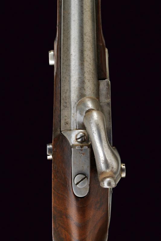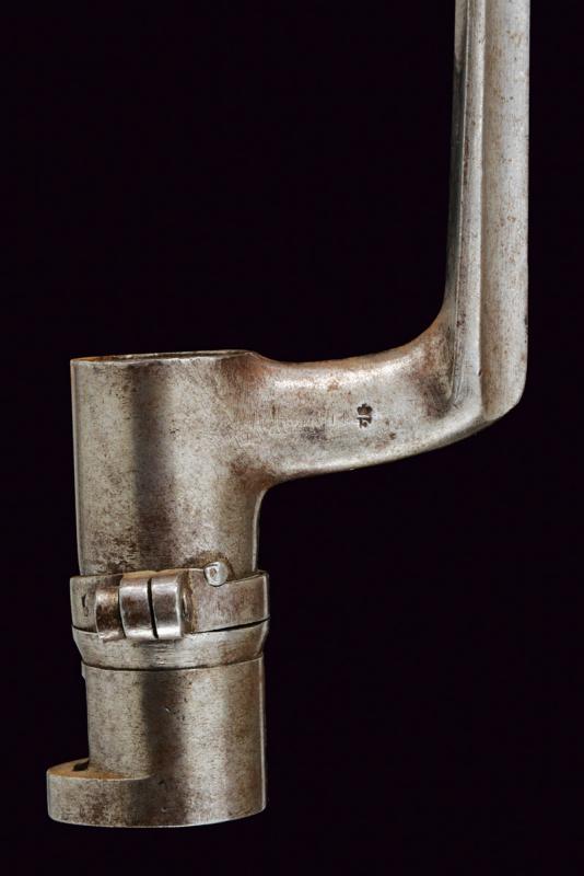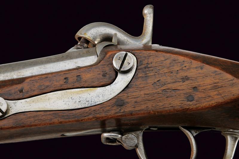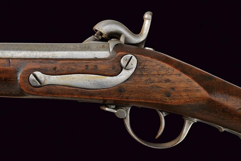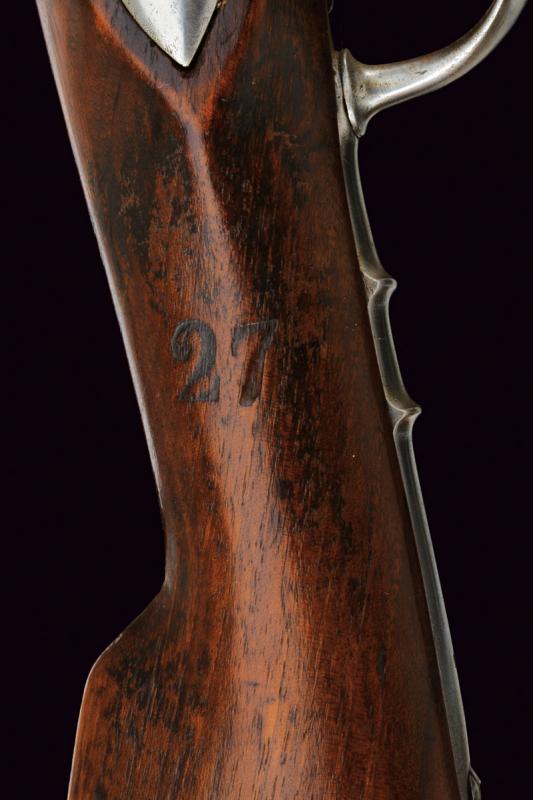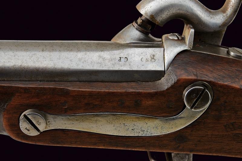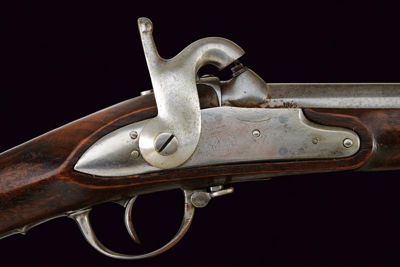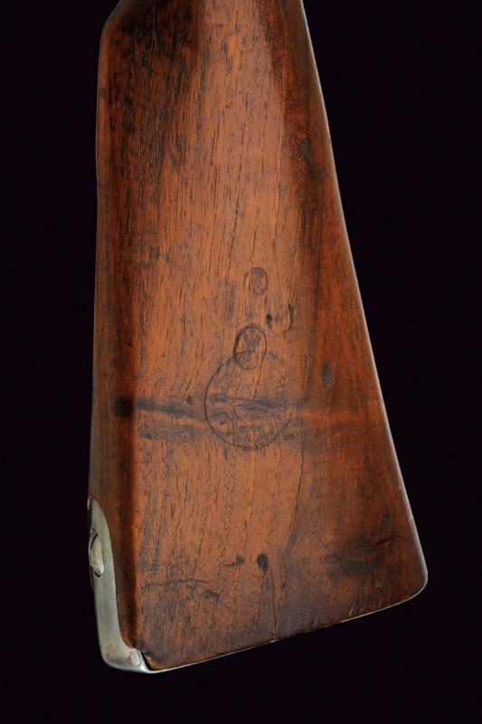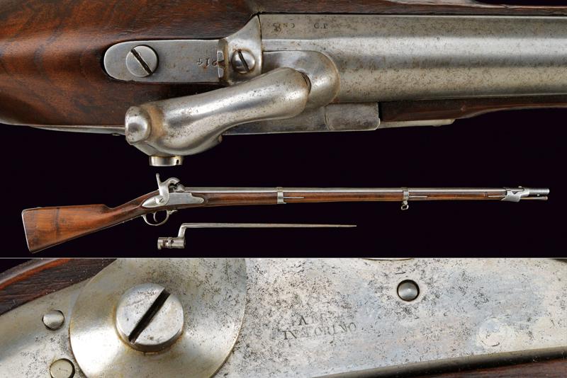 Fucile a luminello Mod. 1844 con baionetta, datazione: Metà del XIX Secolo provenienza: Piemonte, Canna tonda, liscia, munita di dente d'innesto per baionetta, con culatta ottagonale, recante resti di marchi e data '1848', cal. 17,6 mm. in volata. Codolo con alzo fisso. Batteria a molla in avanti con resti di marcatura '... IN TORINO'. Cassa intera in legno con timbri sul lato destro della pala. Fornimenti e bacchetta in ferro. Baionetta a ghiera (lungh. 53 cm.). Con note storiche raccolte dal proprietario. lunghezza 150 cm.