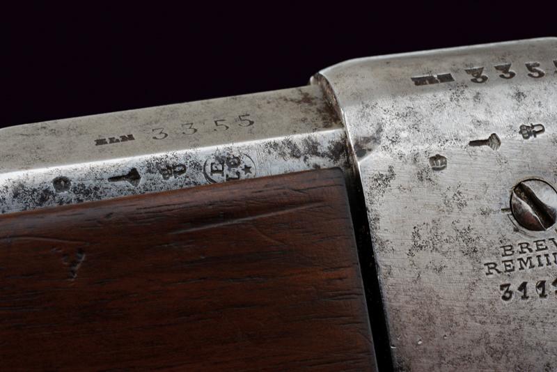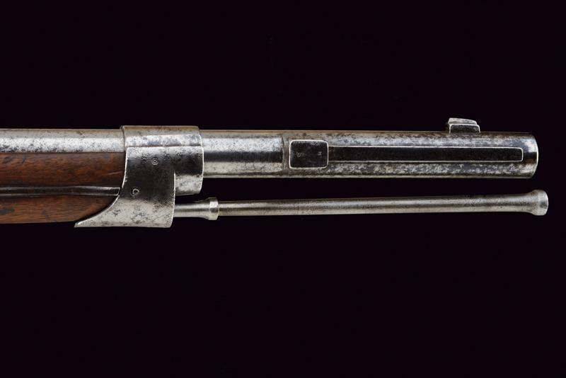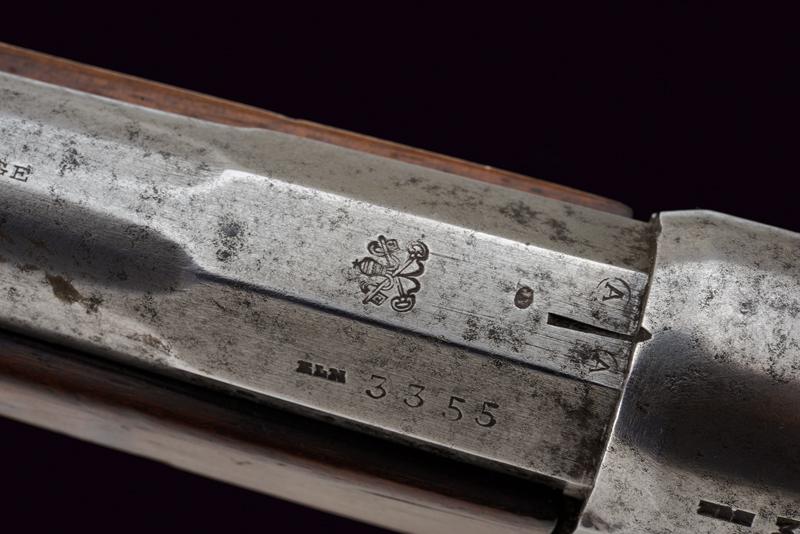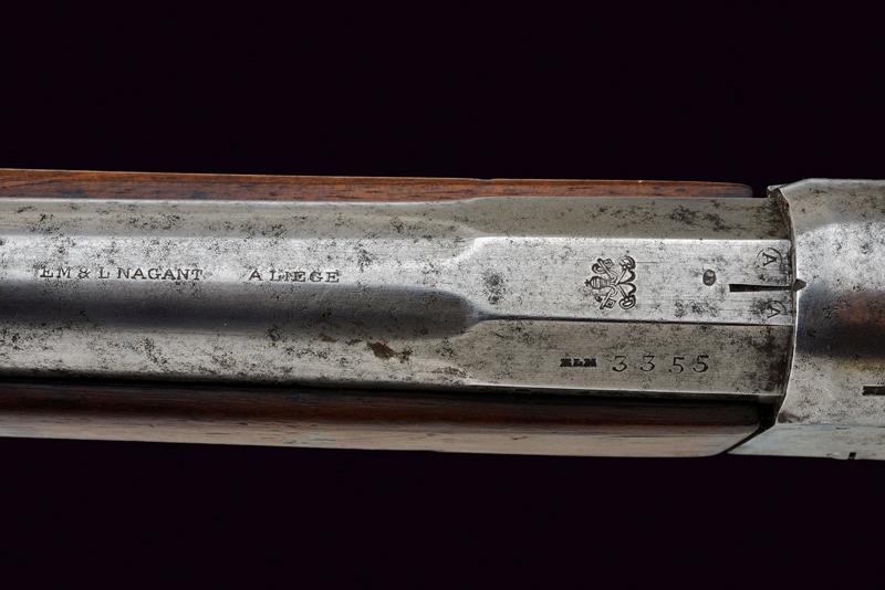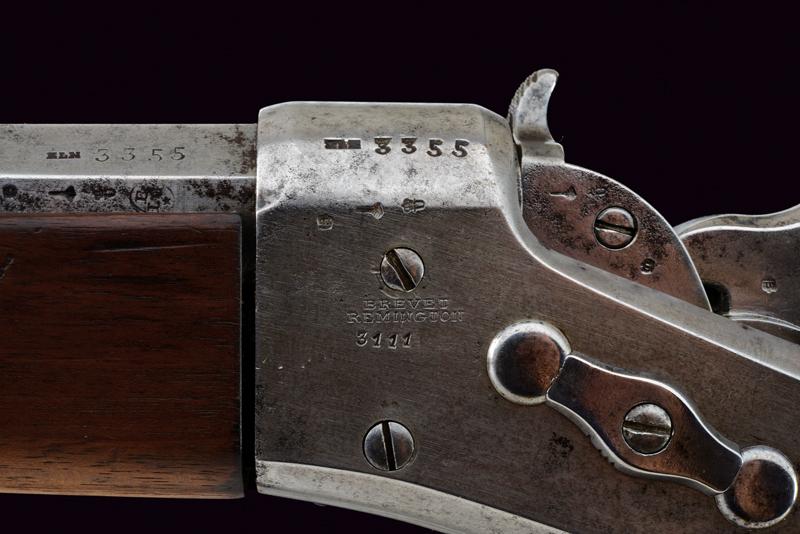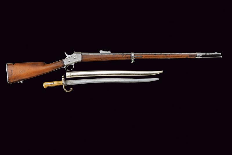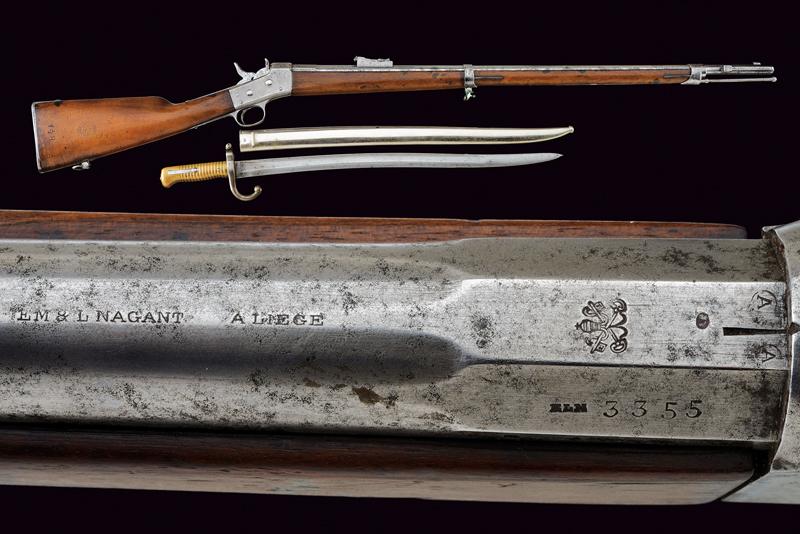 Fucile Remington Rolling Block Nagant con baionetta, datazione: Terzo quarto del XIX Secolo provenienza: Stato Pontificio, Canna tonda rigata (anima pulita rigatura visibile), dotata di mirino, guida d'innesto per baionetta, alzo abbattibile e regolabile, recante alla base le marcature 'EM & L NAGANT', marchio pontificio, vari altri punzoni e marchi del banco di prova di Liegi. Cal. 12,7 mm. in volata. Castello con otturatore a blocco rotante recante marcatura della Nagant, punzoni e numeri di serie coevi alla canna. Meccanica funzionante. Calcio ed astina in legno, ben visibile sul lato destro della pala il timbro 'CATHOLIQUES BELGES' con data '1868'. Fornimenti e bacchetta in ferro. Qualche intaccatura all'esterno. Con baionetta (lungh. 70 cm.) punzonata con 'S' coronata come la guida d'innesto e 'A' entro un cerchio, munita di numero di serie differente dal fucile e completa di fodero. Allegate note storiche raccolte dal proprietario e informazioni sui punzoni presenti sull'arma. lunghezza 131,5 cm.