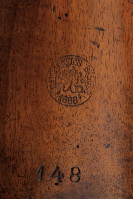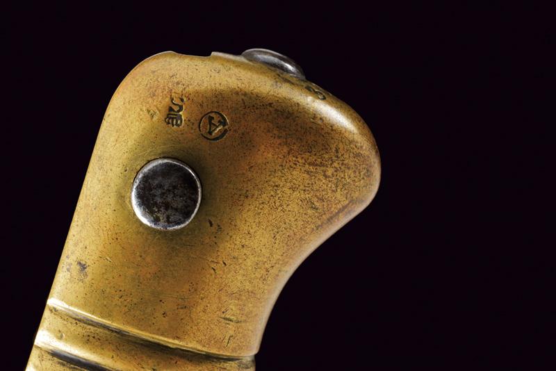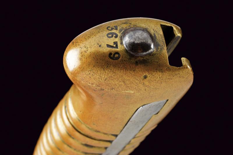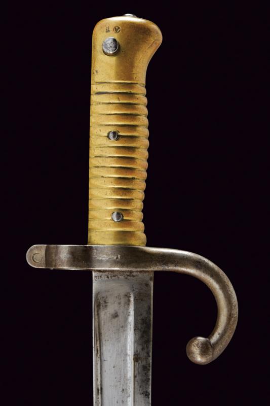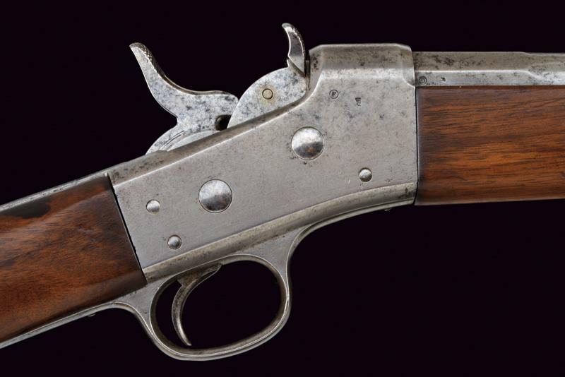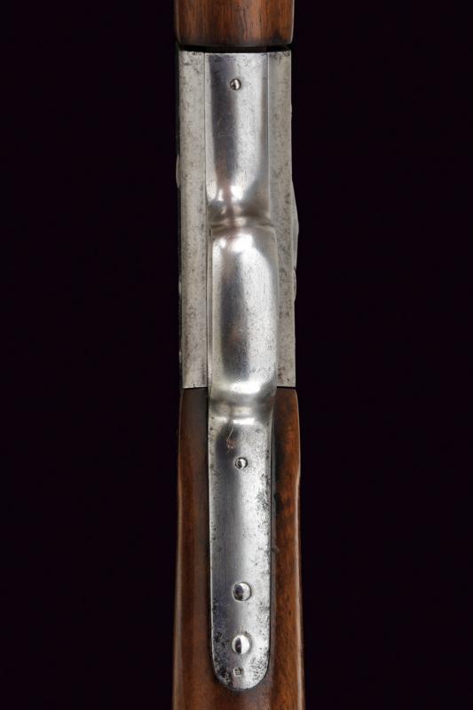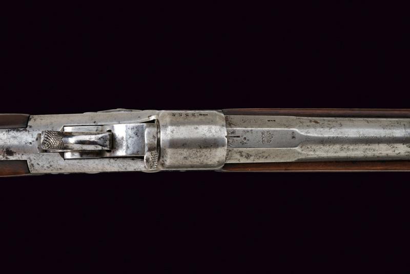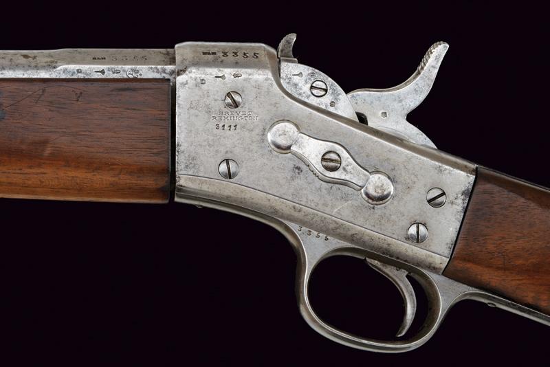 Fucile Remington Rolling Block Nagant con baionetta, datazione: Terzo quarto del XIX Secolo provenienza: Stato Pontificio, Canna tonda rigata (anima pulita rigatura visibile), dotata di mirino, guida d'innesto per baionetta, alzo abbattibile e regolabile, recante alla base le marcature 'EM & L NAGANT', marchio pontificio, vari altri punzoni e marchi del banco di prova di Liegi. Cal. 12,7 mm. in volata. Castello con otturatore a blocco rotante recante marcatura della Nagant, punzoni e numeri di serie coevi alla canna. Meccanica funzionante. Calcio ed astina in legno, ben visibile sul lato destro della pala il timbro 'CATHOLIQUES BELGES' con data '1868'. Fornimenti e bacchetta in ferro. Qualche intaccatura all'esterno. Con baionetta (lungh. 70 cm.) punzonata con 'S' coronata come la guida d'innesto e 'A' entro un cerchio, munita di numero di serie differente dal fucile e completa di fodero. Allegate note storiche raccolte dal proprietario e informazioni sui punzoni presenti sull'arma. lunghezza 131,5 cm.