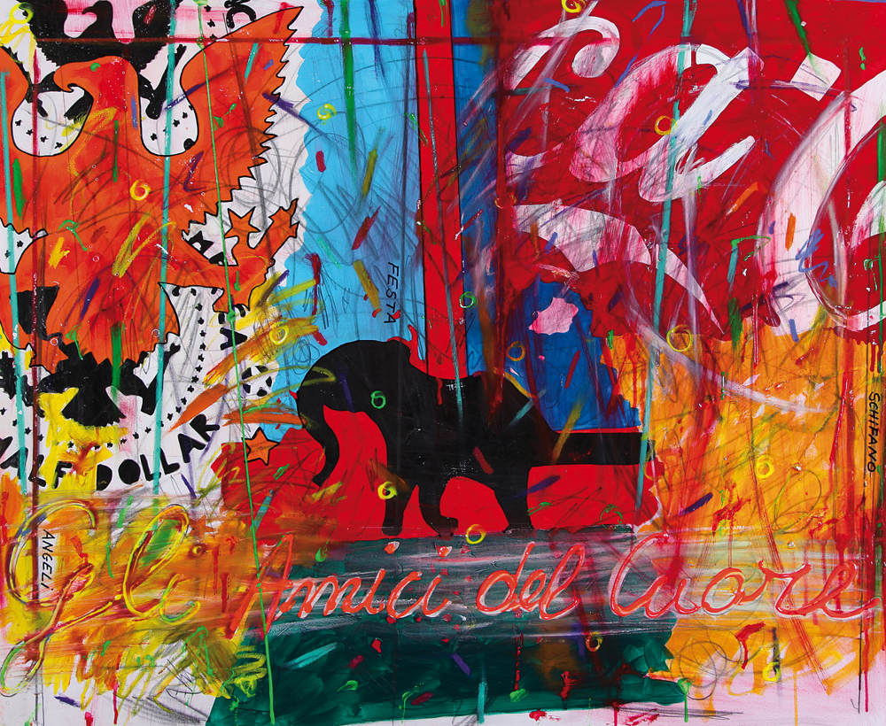 ENRICO MANERA Asmara (Etiopia) 04/04/1947 Gli amici del cuore, 2001 smalti e tecnica mista su tela cm. 90x110, firma, titolo e anno al retro, dichiarazione d'autenticità dell'artista su foto.