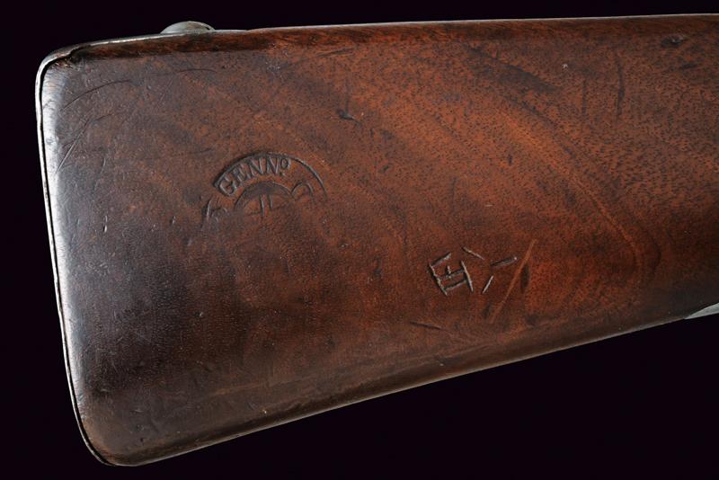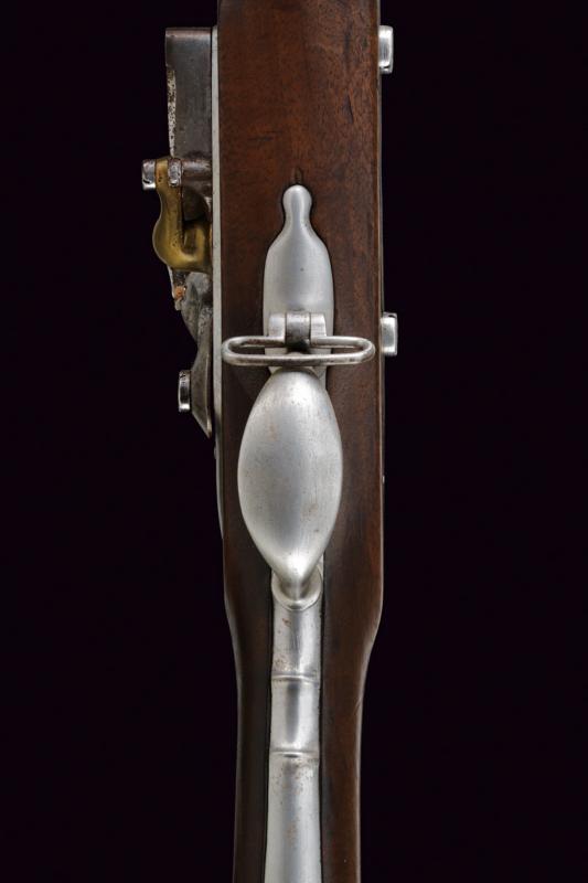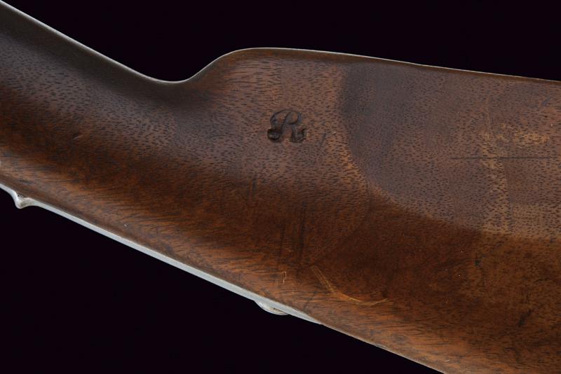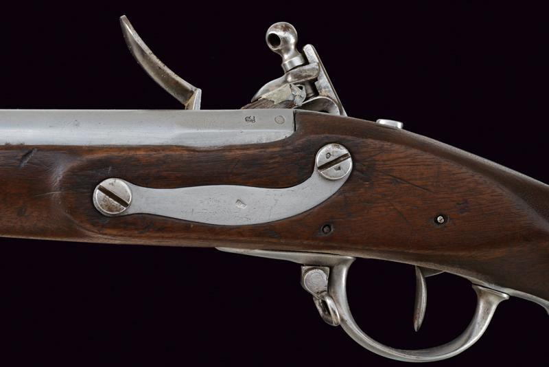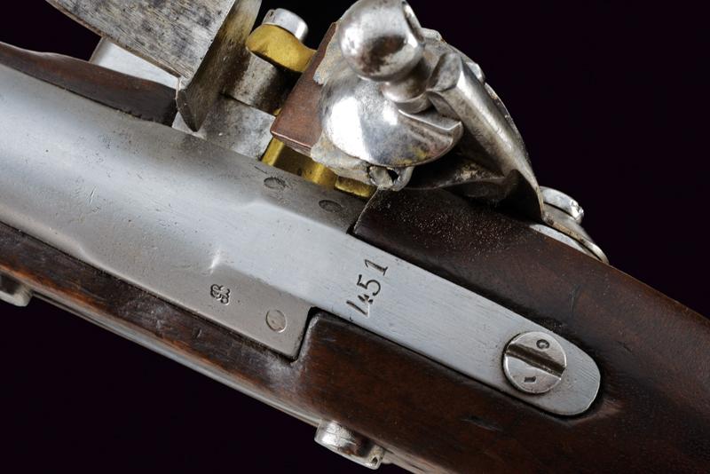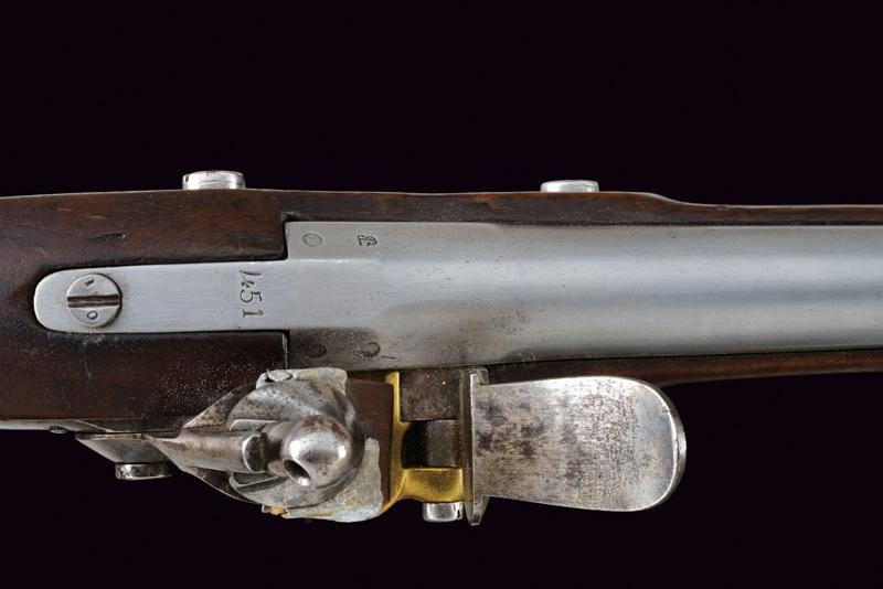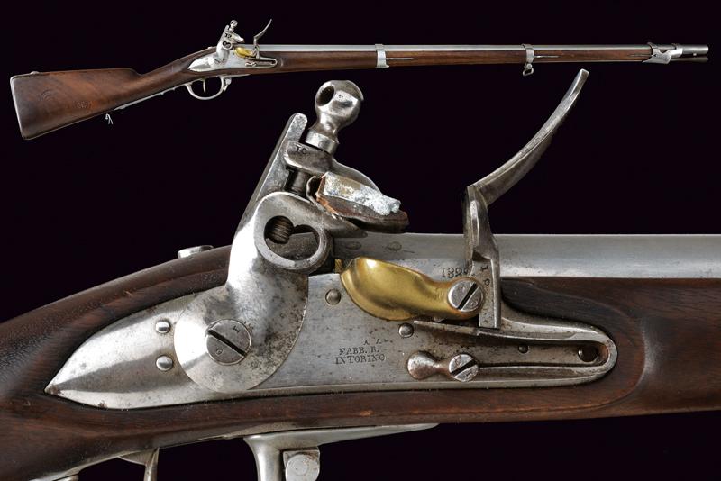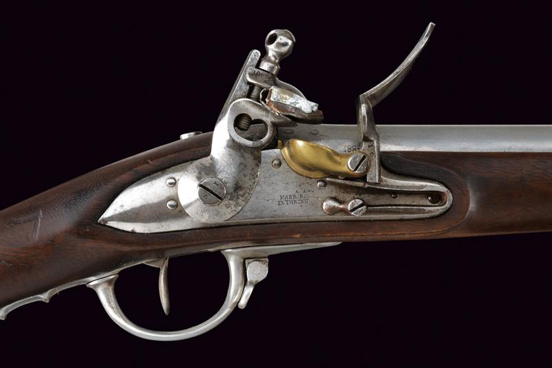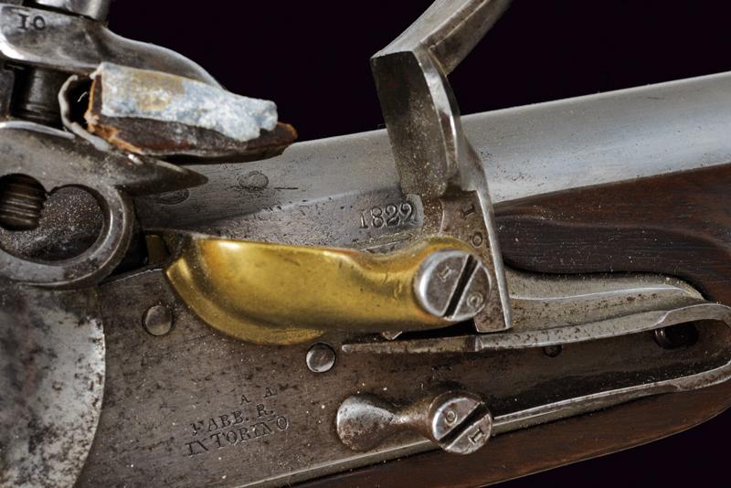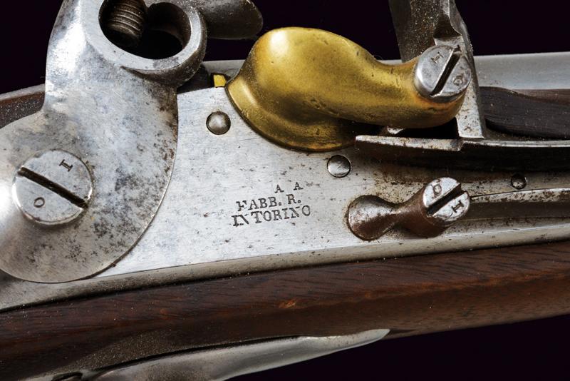 Fucile a pietra focaia, datazione: 1829 provenienza: Torino, Canna tonda, liscia con base ottagonale marcata con quattro punzoni e anno di produzione '1829', cal. 17 mm; codetta marcata '451'; batteria a pietra focaia firmata 'FABB.A R.A IN TORINO', scodellino in ottone, parti marcate '10'. Cassa intera in legno, il calcio con timbro incompleto 'GENN.O' e con croce sabauda. Fornimenti e bacchetta in ferro. lunghezza 140.5