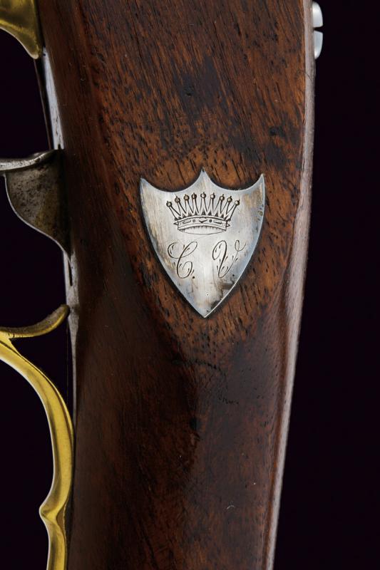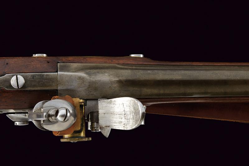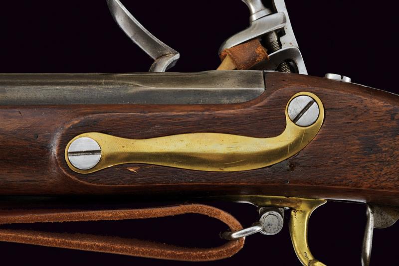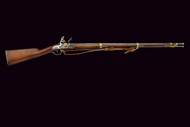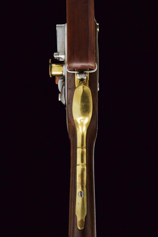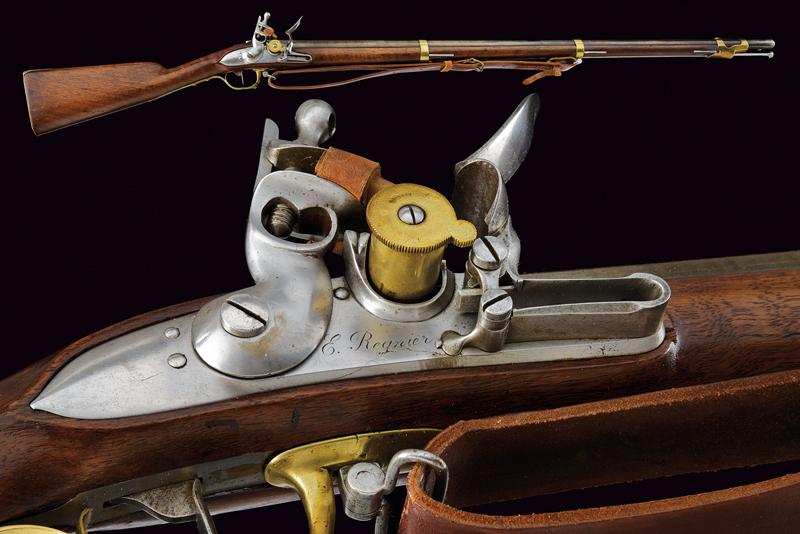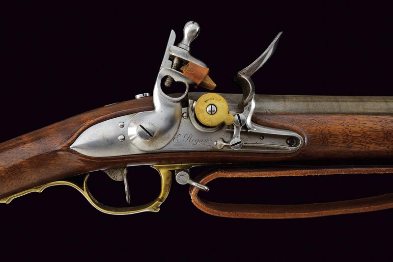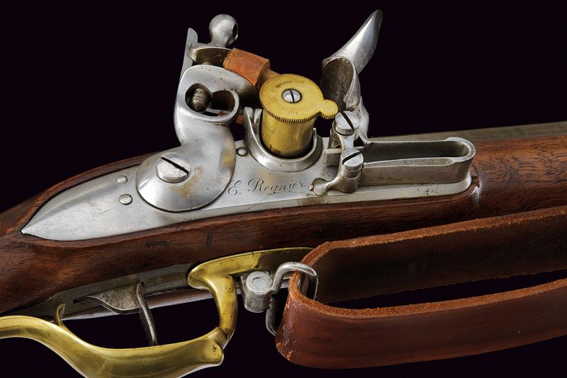 Raro fucile da ufficiale a pietra focaia di Regnier, datazione: 1810 - 1830 provenienza: Francia, Canna liscia, tonda, con base quadra, con 75% di brunitura originale, attacco per la baionetta, cal. 17 mm; batteria a pietra focaia firmata 'E. Regnier' con scodellino tubolare in ottone marcato 'REGNIER'. Cassa intera in legno con fornimenti in ottone e bacchetta in ferro. Cinghia in cuoio di epoca moderna. In splendide condizioni. lunghezza 139 cm.