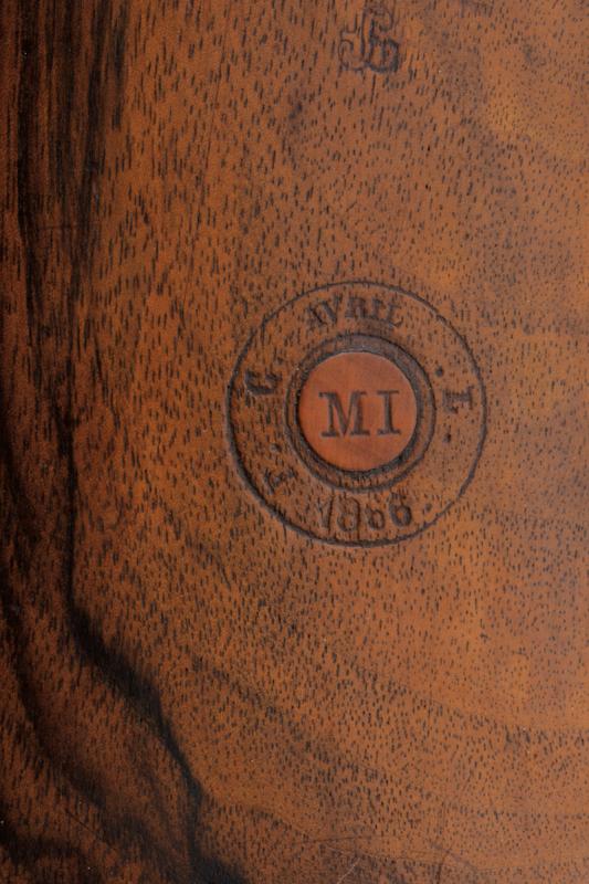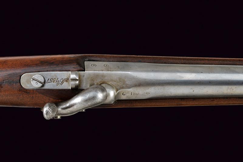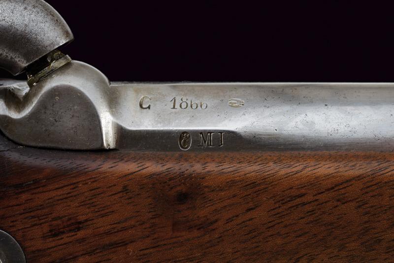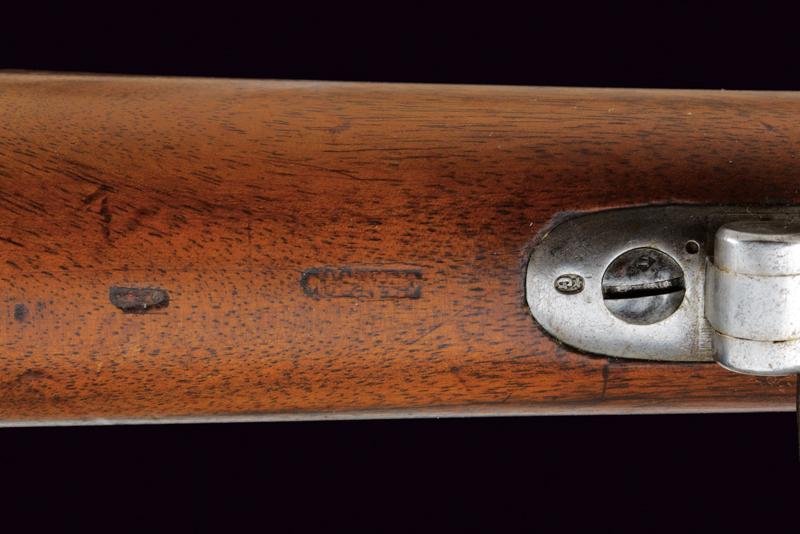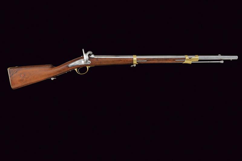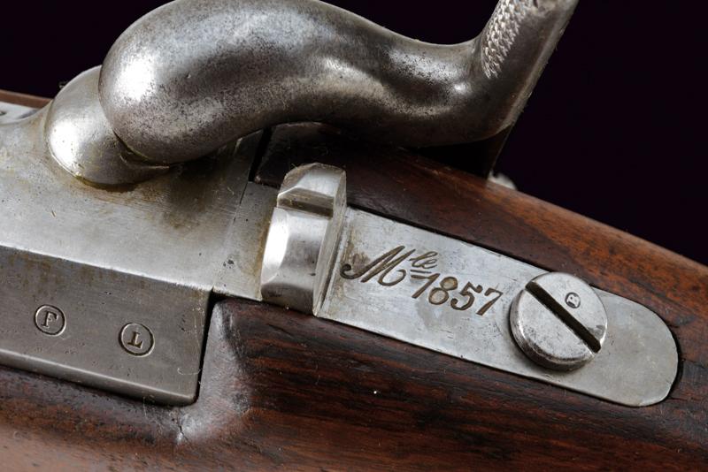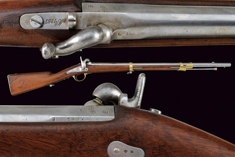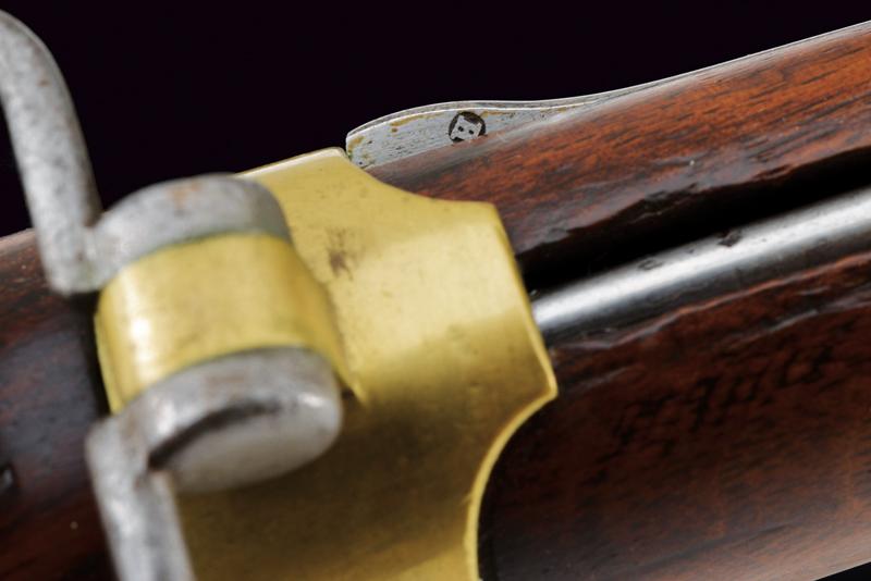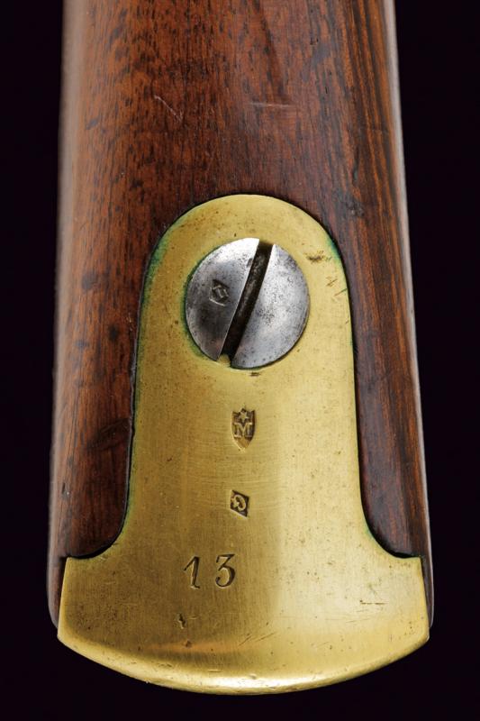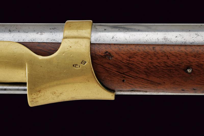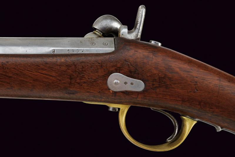 Moschettone a luminello Mod. 1857 da gendarmeria, datazione: Terzo quarto del XIX Secolo provenienza: Francia, Canna tonda rigata (segni d'uso all'interno, rigatura visibile), dotata di mirino e di dente d'innesto per baionetta, con culatta ottagonale datata 'C 1866', punzonata 'F' e 'L' entro cerchi, con 'C' sormontata da corona e 'MI', cal. 18 mm. Codolo con alzo fisso e dicitura 'M.le 1857' ben visibile. Batteria a molla indietro marcata 'M.re Imp.le de Chatellerault' e con punzone 'M' entro scudo e sormontato da stella. Meccanica funzionante (il primo scatto non ingaggia la sicura). Cassa a tre quarti in legno con vari timbri ben visibili sul lato sinistro della pala, su quello destro marchio 'MI' e 'AVRIL 1866'. Fornimenti in ottone tutti con vari punzoni ben leggibili. Bacchetta in ferro. lunghezza 114,5 cm.