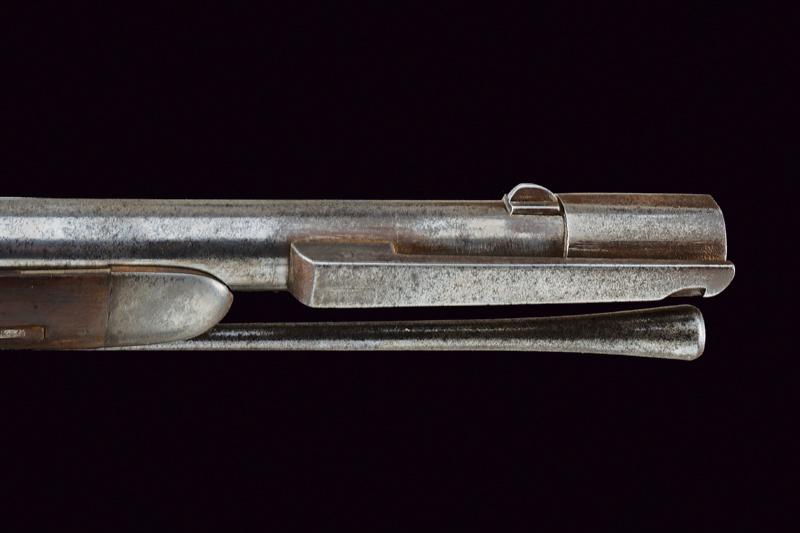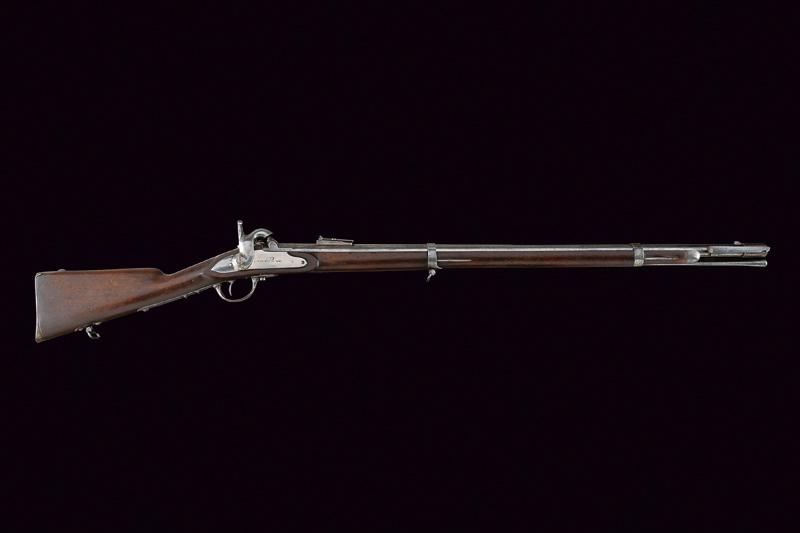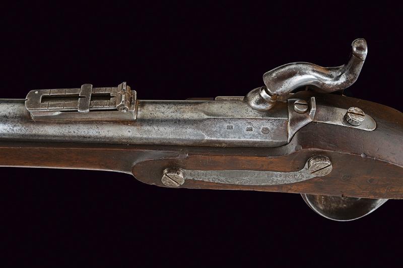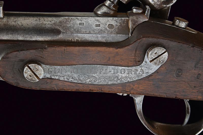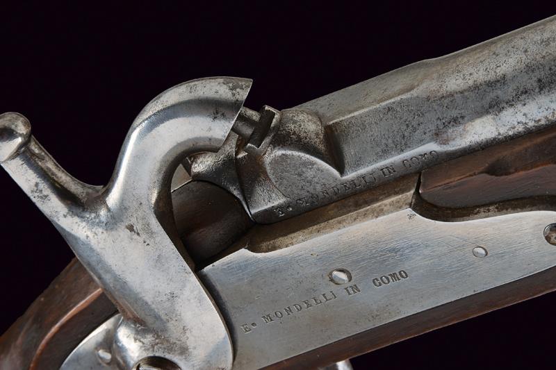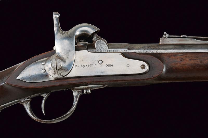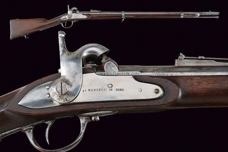 Rarissima carabina da bersaglieri a luminello Mod. 1856, datazione: Terzo quarto del XIX Secolo provenienza: Italia, Canna tonda rigata, con base ottagonale firmata 'E. MONDELLI IN COMO 62', recante lo scudo sabaudo, il marchio 'CB' e resti di altri due punzoni, dotata di alzo abbattibile e regolabile, con mirino ed attacco per la baionetta, cal. 17,4 mm. in volata. La canna apparentemente tappata con metallo all'interno. Batteria a molla in avanti firmata come la canna. Meccanica funzionante a un solo scatto. Cassa intera in legno ben conservata, con timbro 'FG' accanto alla contropiastra. Fornimenti e bacchetta in ferro. La contropiastra incisa 'GIO.NI RICOLFI-DORIA' e con racemi. La canna è tappata solo con metallo non ferroso, quindi sicuramente di facile ripristino, nella parte libera la rigatura è ancora ben visibile. Interessante. lunghezza 126,5 cm.