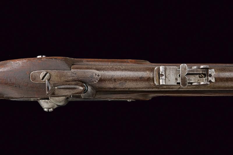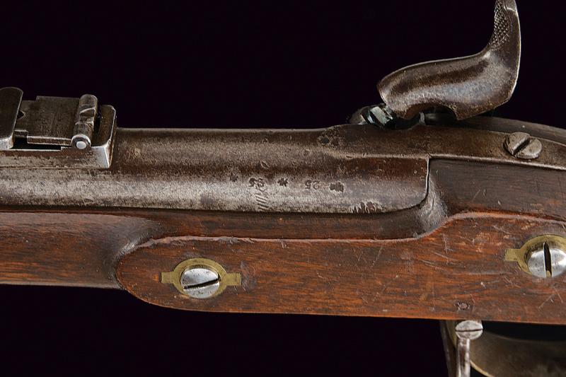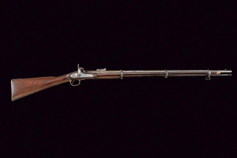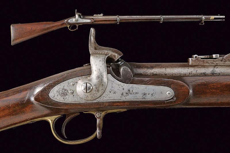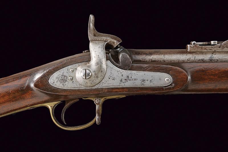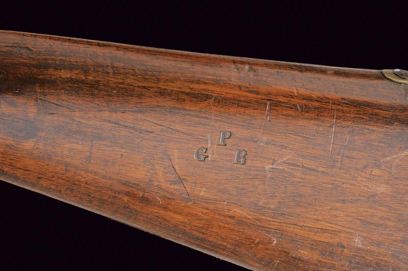 Fucile Enfield a luminello, datazione: Metà del XIX Secolo provenienza: Inghilterra, Canna tonda rigata con alzo variabile e mirino, la base con punzoni del banco di prova e '25', cal. 15 mm; batteria a molla in avanti marcata 'TOWER' e con corona. Cassa intera in legno marcato sul calcio 'PGB' e 'GF', con fornimenti in ottone, bacchetta e reggicanna in ferro. lunghezza 140.5 cm.