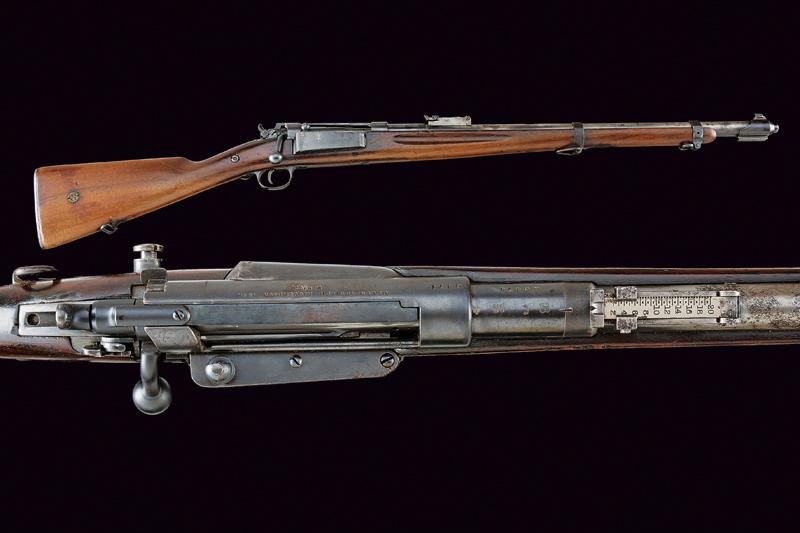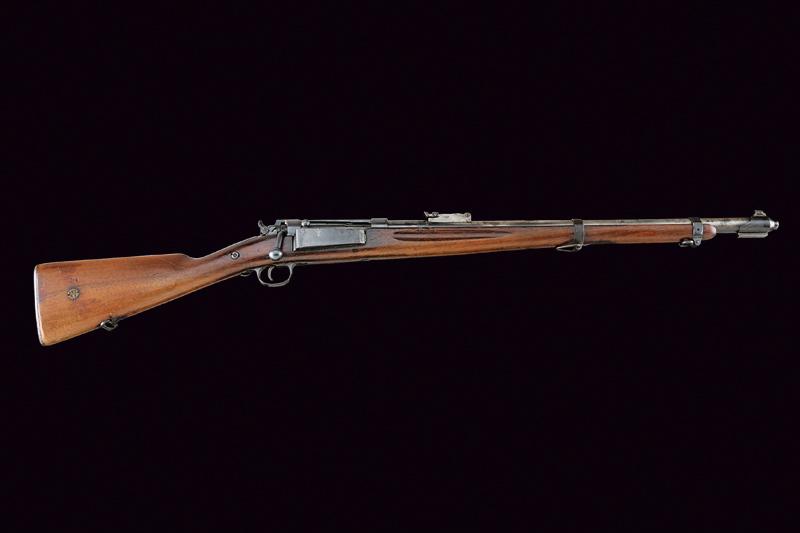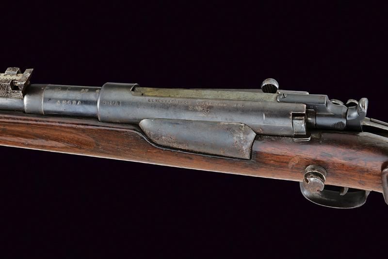 Fucile Krag-Jorgensen Mod. 1889 a retrocarica, datazione: 1891 provenienza: Danimarca, Canna tonda rigata, marcata 'A 6471' e con vari punzoni, dotata di ghiera con mirino e guida d'innesto per baionetta, alzo regolabile, cal. 8 x 58R. Otturatore con dicitura del modello 'M. 89', 'GEVAERFABRIKEN KJOBENHAVN 1901', Matr. '6471'. Cassa intera in legno, fornimenti in ferro. Calcio con medaglione '1 R 339'. lunghezza 110.5 cm.