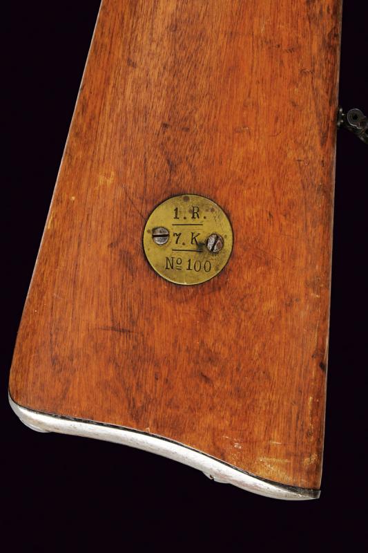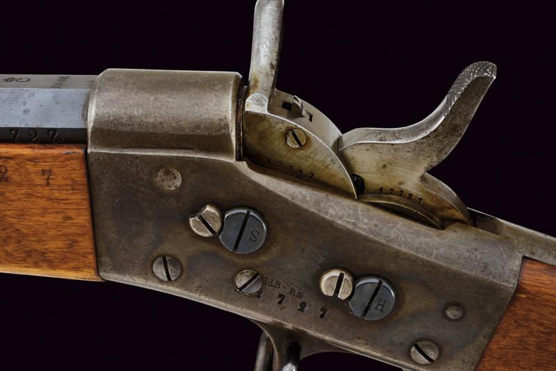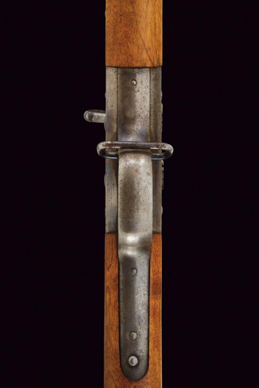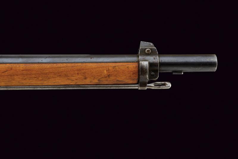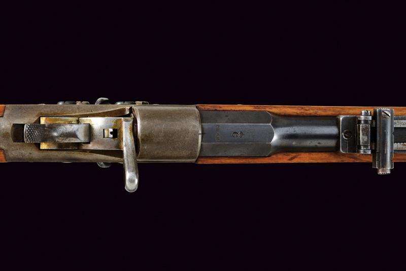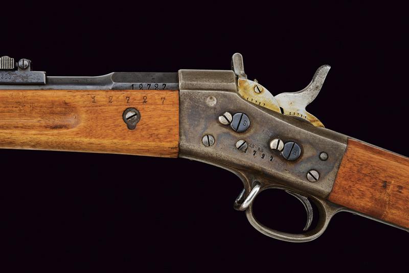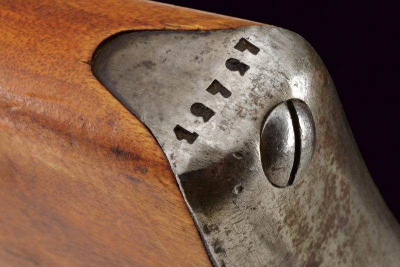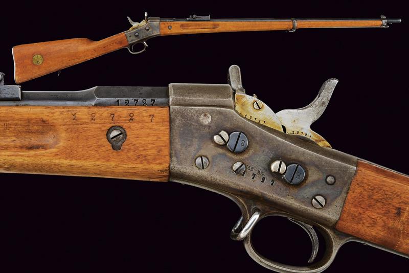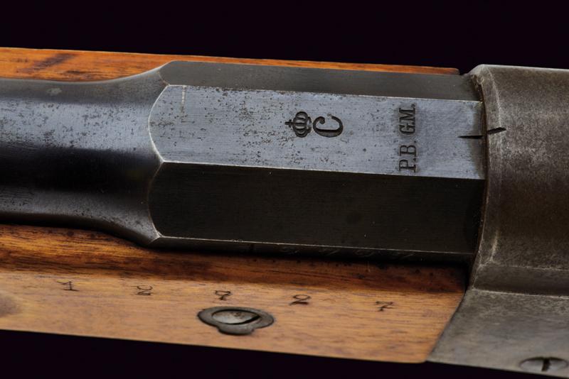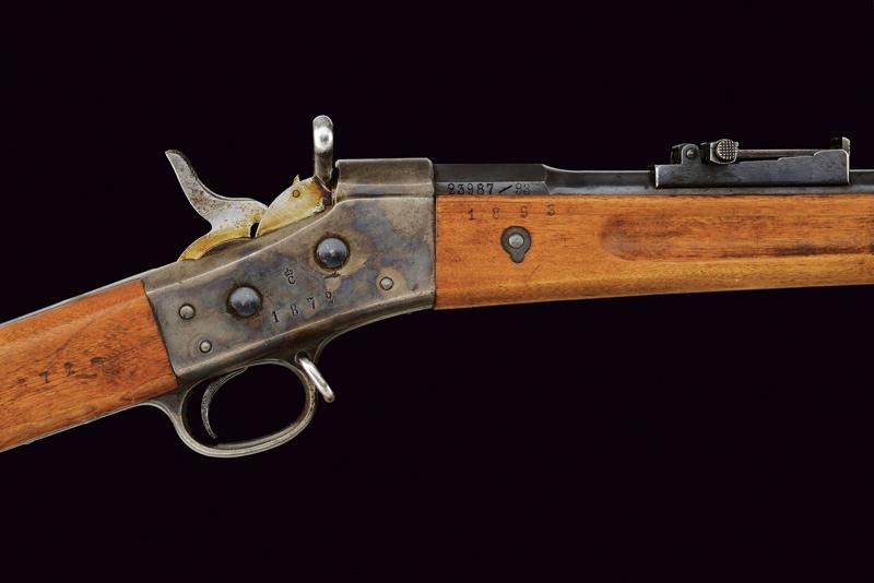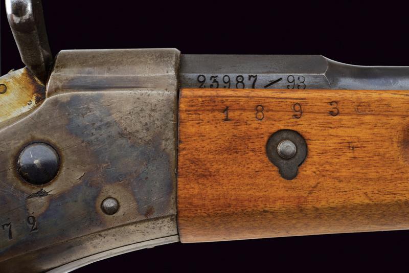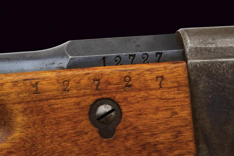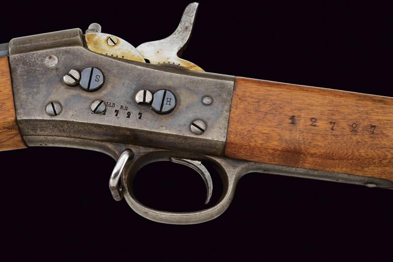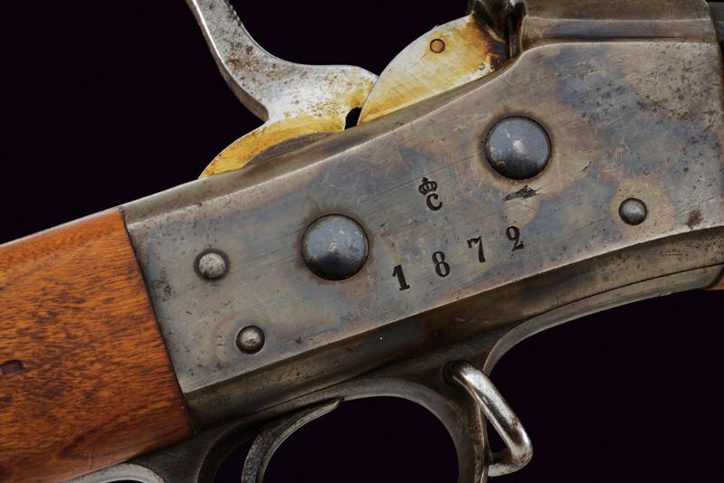 Fucile tipo Remington Rolling Block, datazione: 1872 provenienza: Svezia, Canna rigata, tonda, con base ottagonale marcata 'PBGM', con matricole '12727' e '13987/93', brunita, con alzo variabile e mirino; cal. 8 mm; castello datato '1872' e con punzone 'C' sotto corona; cassa in legno a due pezzi, fornimenti e bacchetta in ferro. Placchetta tonda in ottone sul calcio '1. R. 7 K No. 100'. lunghezza 124.5 cm.