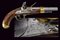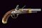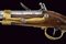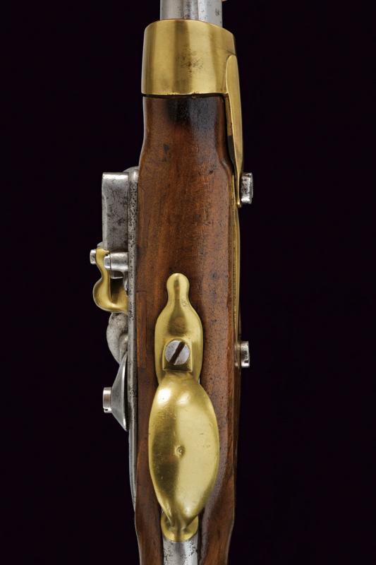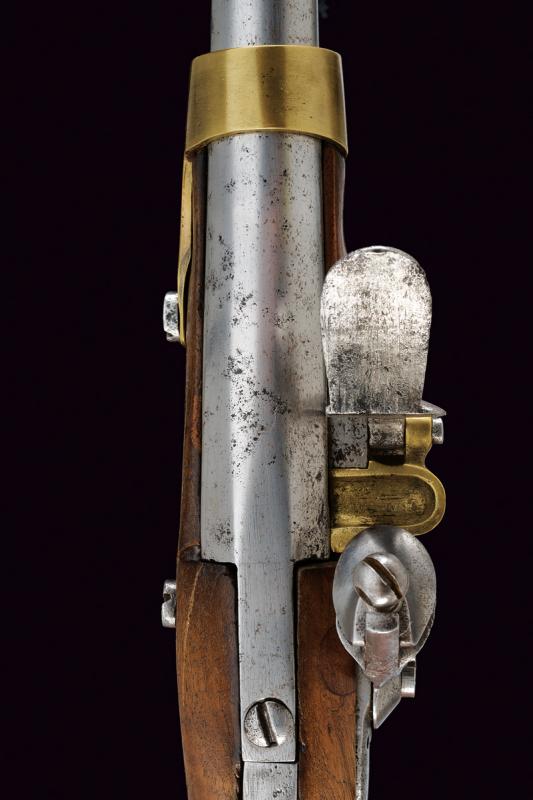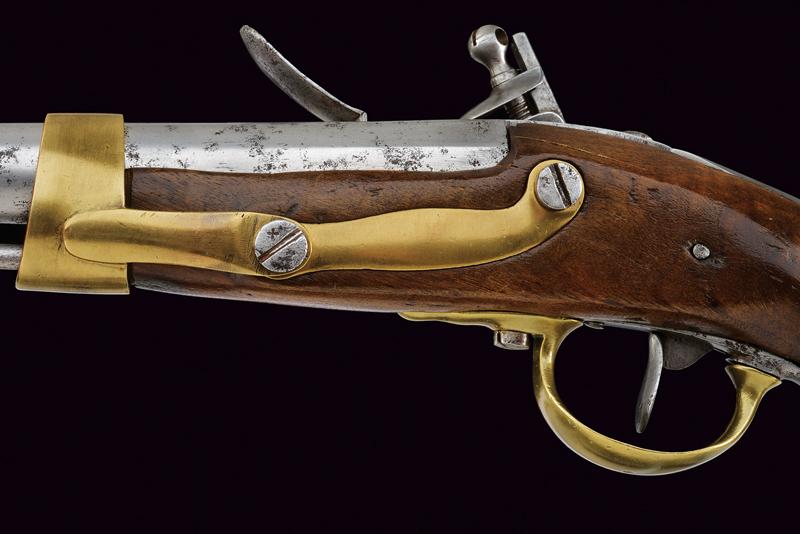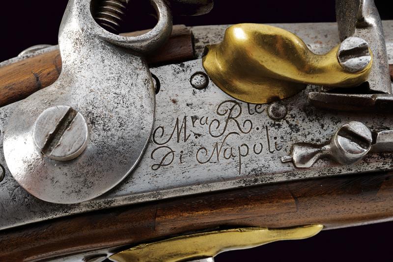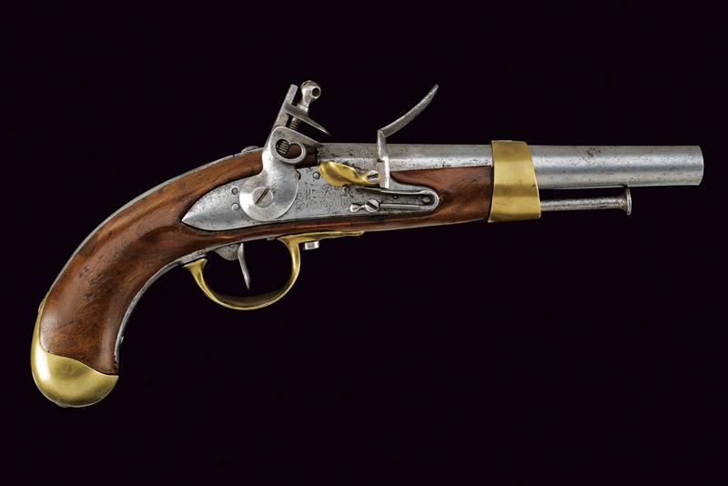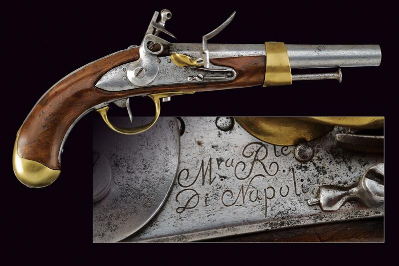Pistola a pietra focaia mod. AN XIII d'epoca murattiana, datazione: 1810 provenienza: Napoli, Canna liscia a due ordini, cal. 17 mm; batteria firmata 'M.ra R.le di Napoli', con scodellino in ottone, all'interno la data '1810'. Cassa in noce con piccoli restauri. Fornimenti in ottone e ferro, bacchetta in ferro. lunghezza 36 cm.