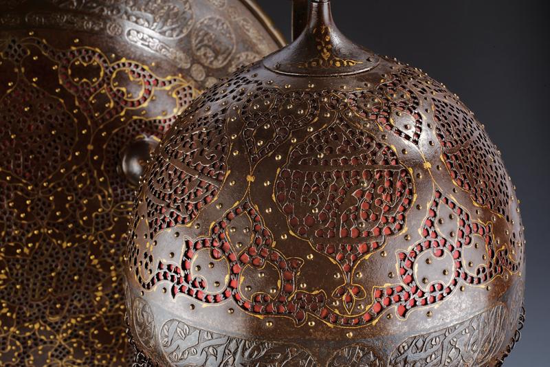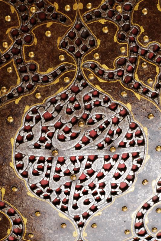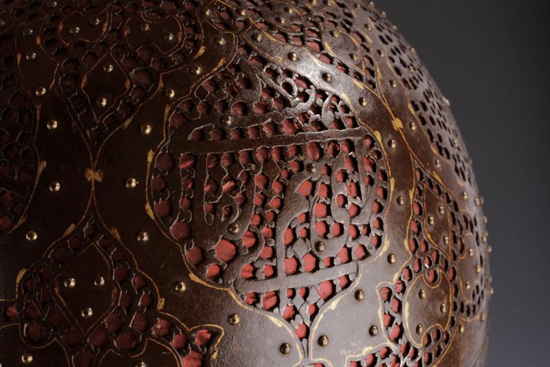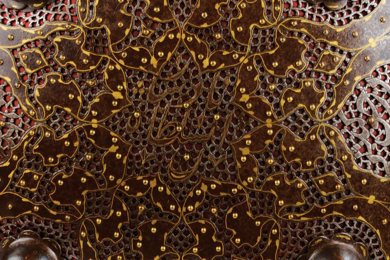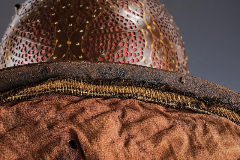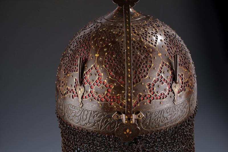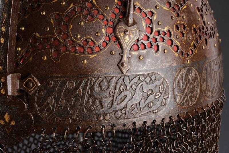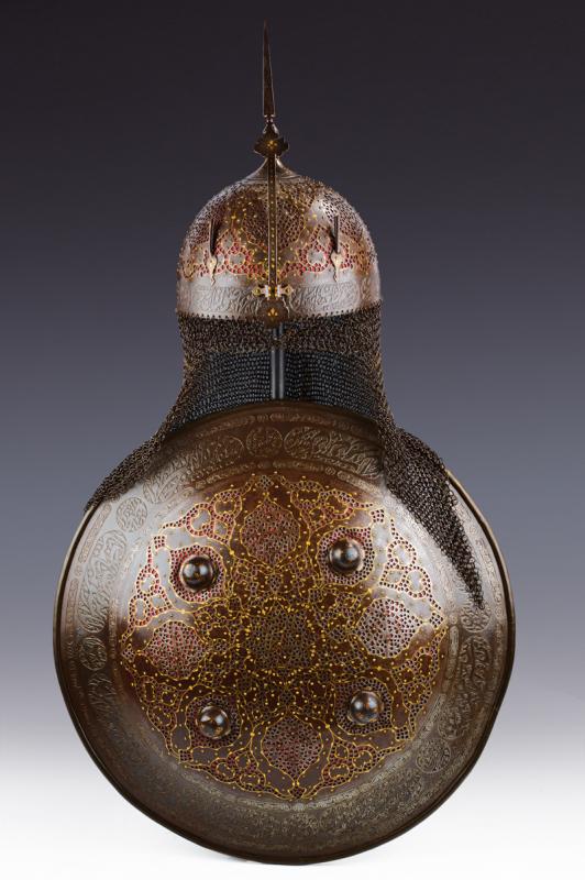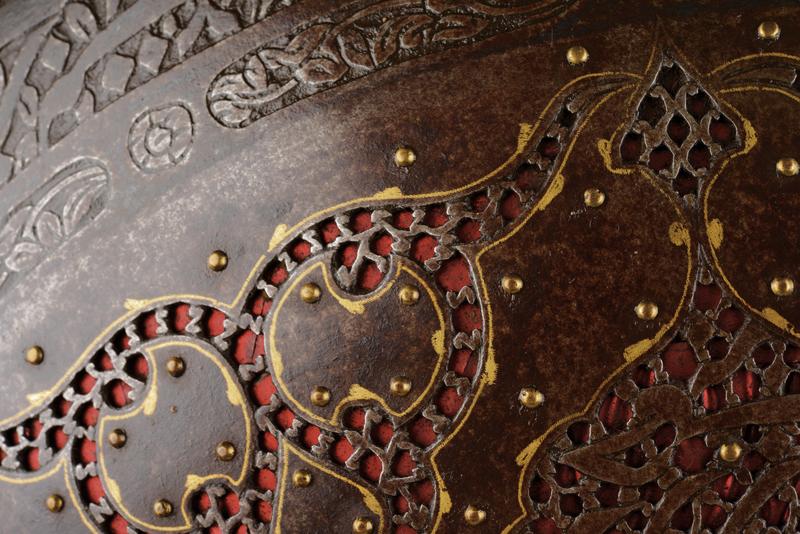 Parure di khula khud e sipar, datazione: XIX Secolo provenienza: Indopersia, Khula-khud con calotta emisferica, al sommo cuspide di sezione romboidale su nodo e base troncoconica, protezione del naso scorrevole (vite mancante), due pennacchiere laterali, la superficie riccamente incisa, intagliata, traforata e parzialmente decorata a motivi floreali, nei cartigli principali anche con iscrizioni in arabo, lo spazio sotto i segmenti traforati foderati in smalto (?) rosso, il bordo con cartigli recanti scritte in arabo, completo di camaglio formato da piccoli anelli di chiusura semplice. All'interno fodero in panno rosso. Insieme con il suo scudo di forma circolare, convesso al centro, con quattro borchie ageminate in oro a basi festonate, il bordo rinforzato in ottone; tutta la superficie decorata en suite con il khula-khud, le iscrizioni del cartiglio centrale dorate ai bordi. All'interno fodero in panno marrone (piccoli danni) e quattro anelli per le maniglie mancanti. Ensemble molto raro. altezza circa 60 cm.