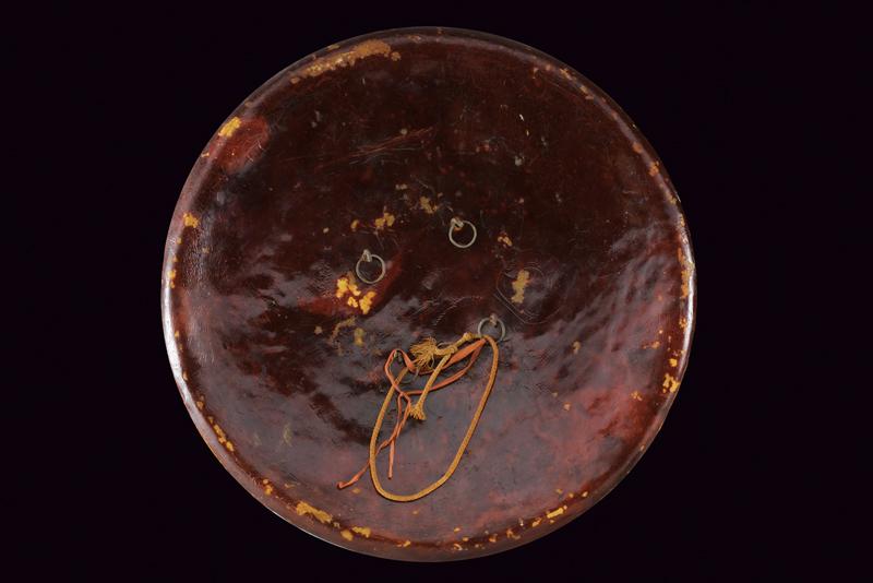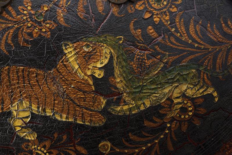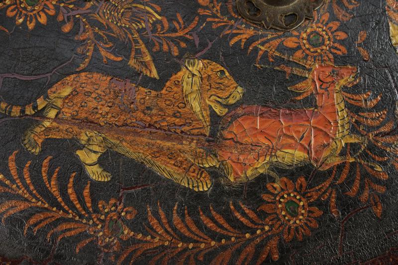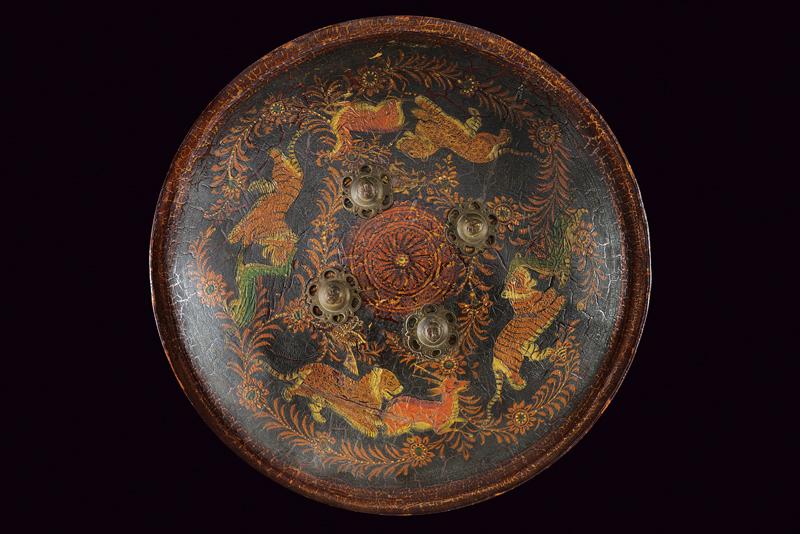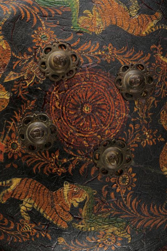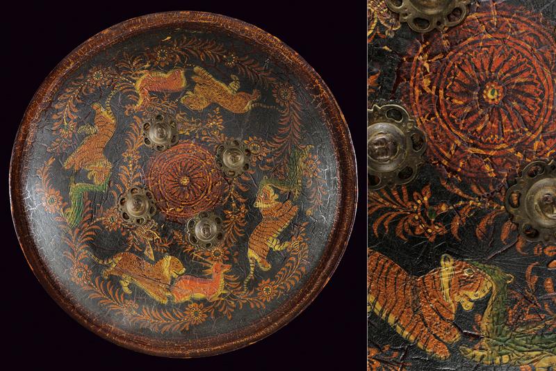 Dhal dipinto, datazione: 1900 circa provenienza: India, In cuoio di forma circolare convessa con bordo alzato e munito di quattro borchie metalliche con volto ad alto rilievo e bordo traforato. Tutta la superficie dipinta in policromia con trini, antilopi e motivi floreali. All'interno laccato (piccole mancanze) e munito di quattro anelli in ferro per le maniglie. diametro 47 cm.