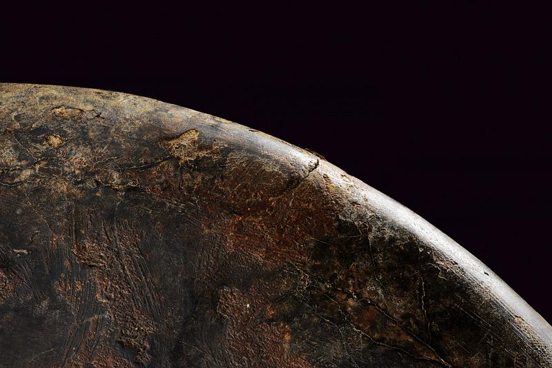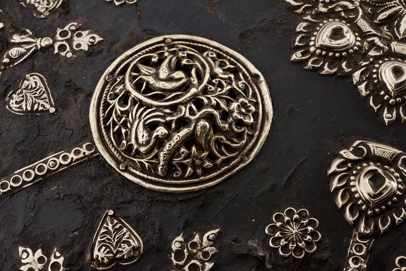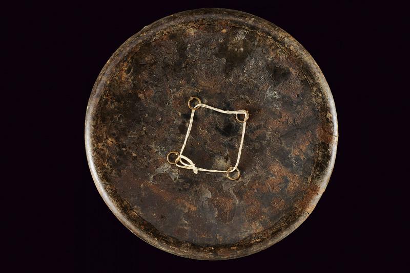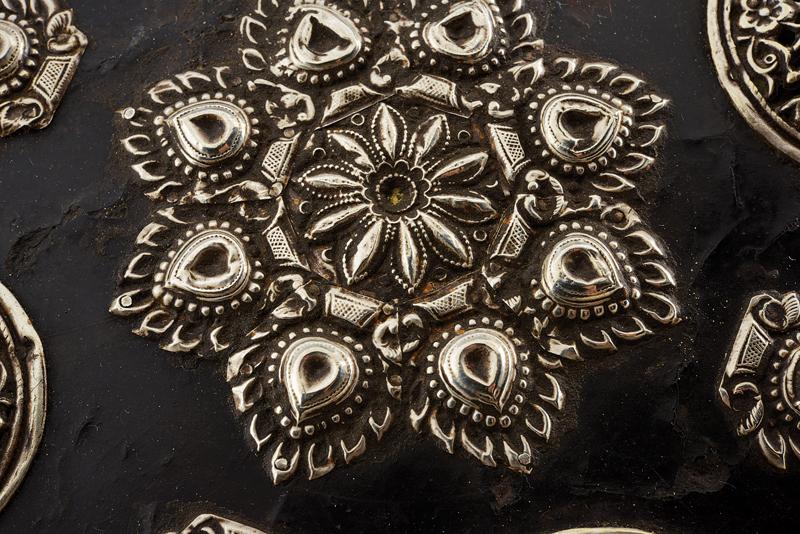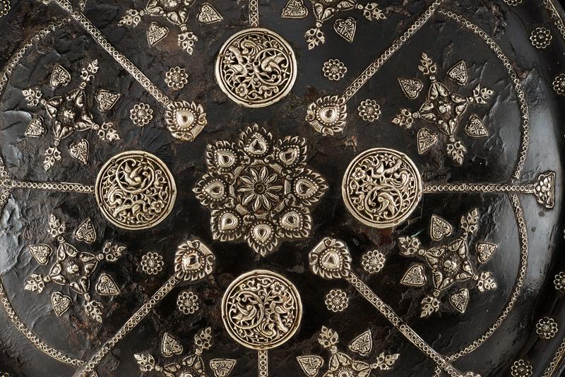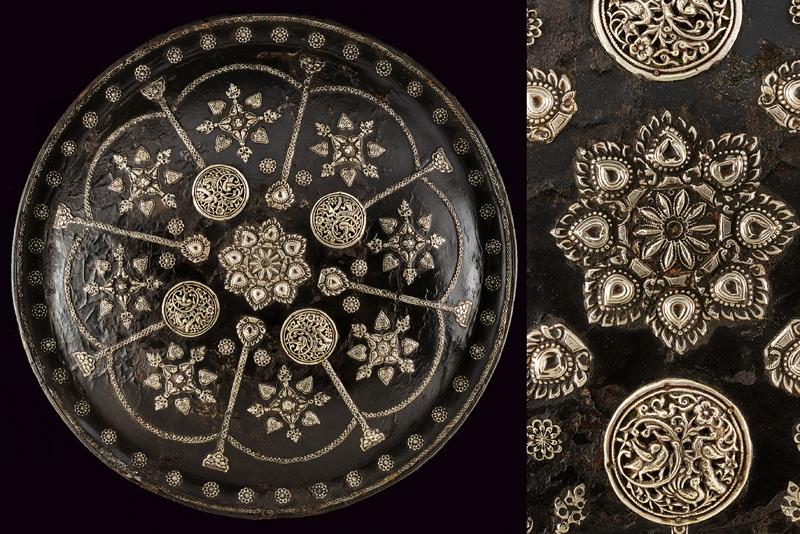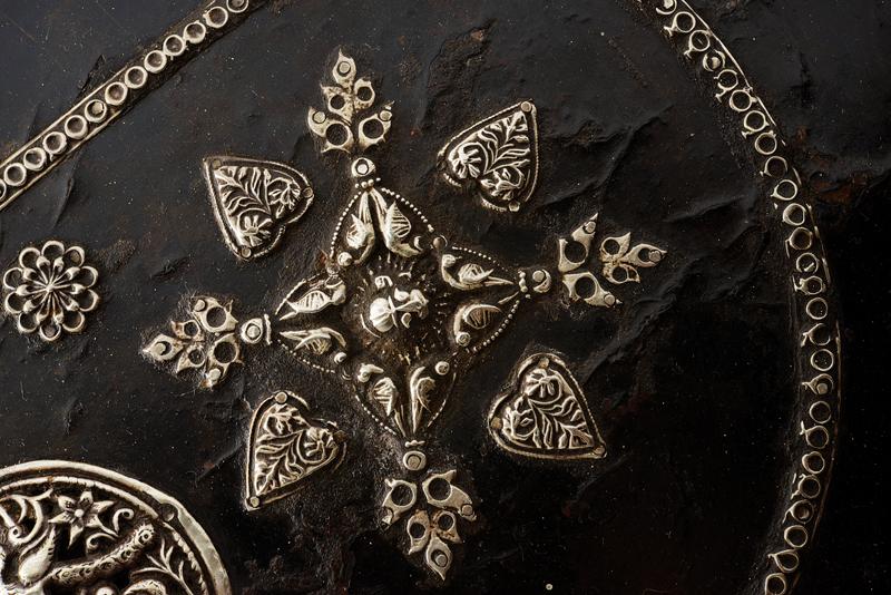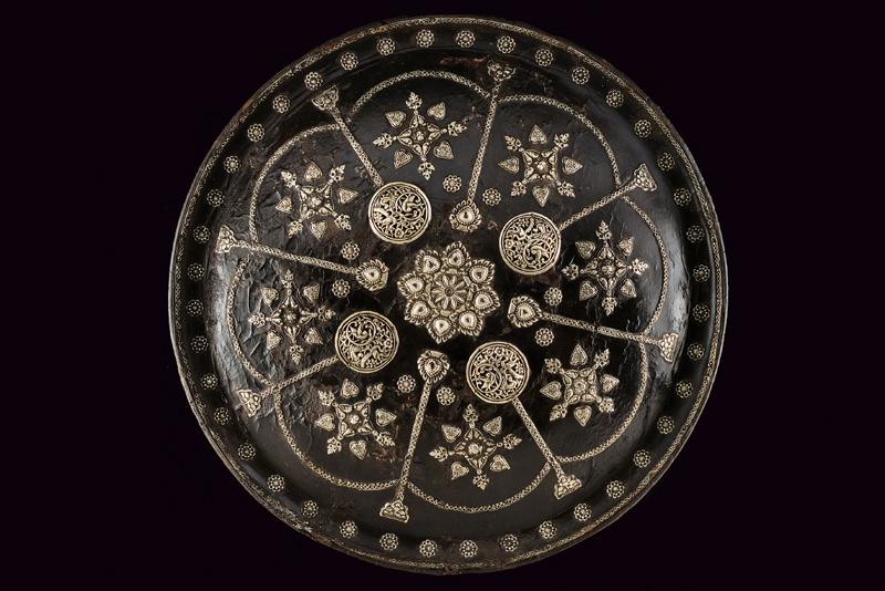 Raro dhal con fornimenti in argento, datazione: fine del XVIII Sec. provenienza: Indopersia, In cuoio, di forma circolare e convessa, con bordo leggermente rilevato. Tutta la superficie (piccole mancanze) decorata con numerose placche in argento incise e parzialmente traforate. Al centro una grande stella fra quattro borchie riccamente traforate e decorate con uccelli fra motivi floreali, il resto suddiviso in otto segmenti con bordi perlinati con mascheroni al centro fra placche a cuore e foglie traforate. Il bordo decorato a rosette. Interessante scudo con inusuale e rara decorazione. diametro 47 cm.