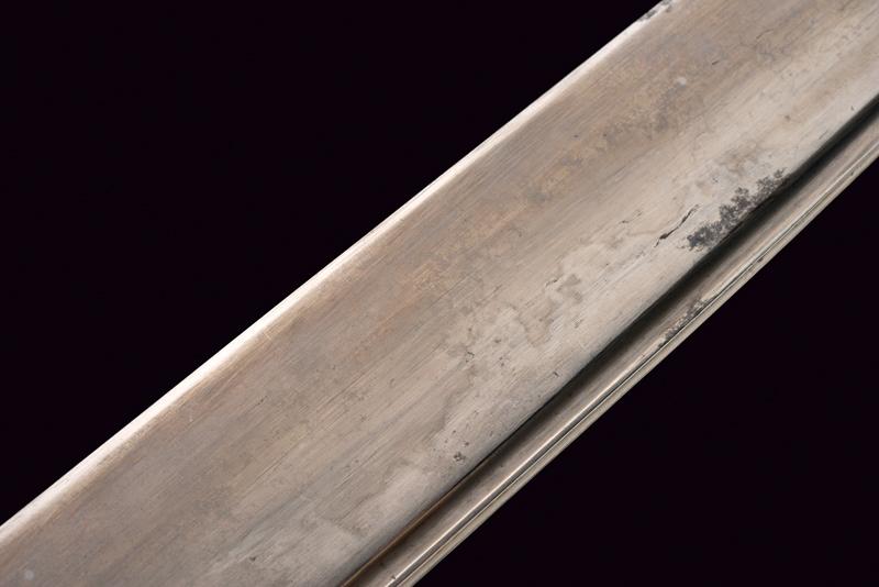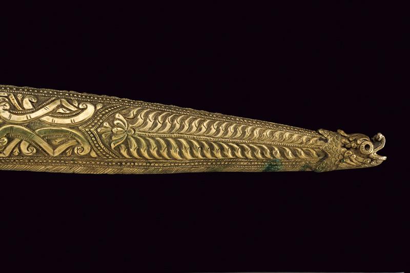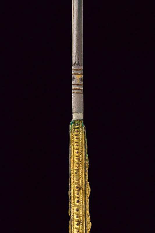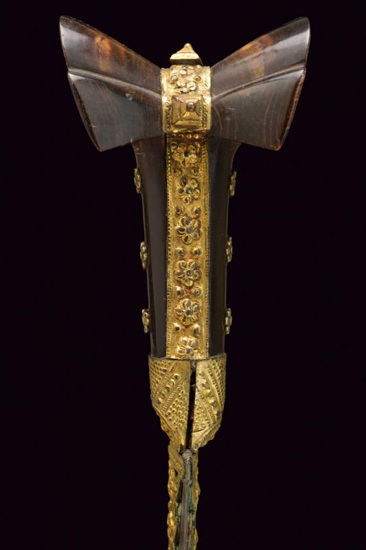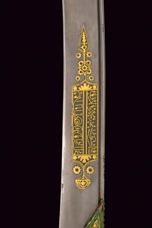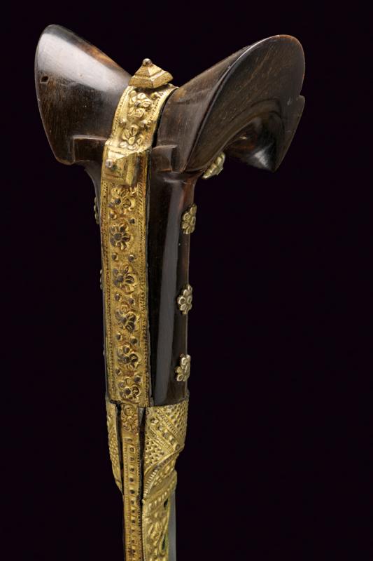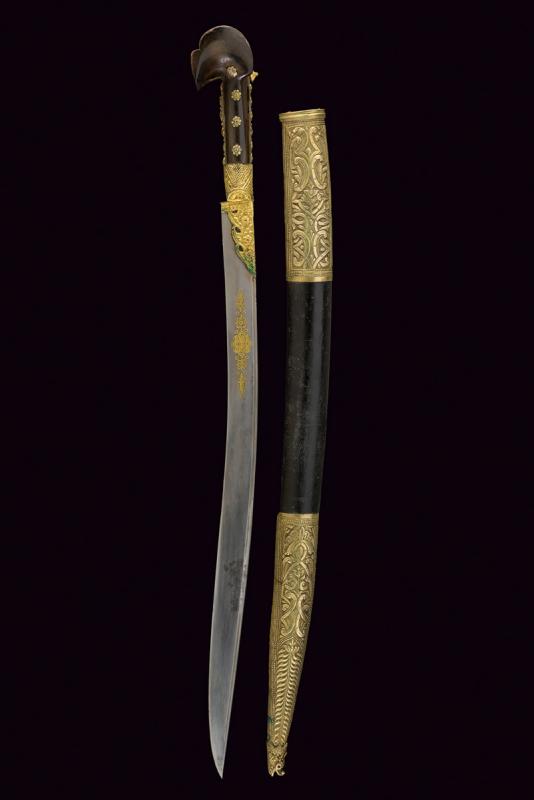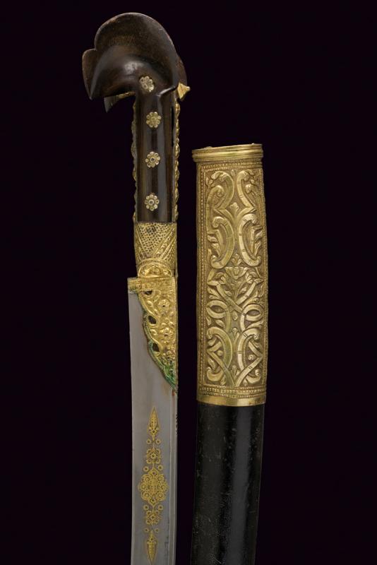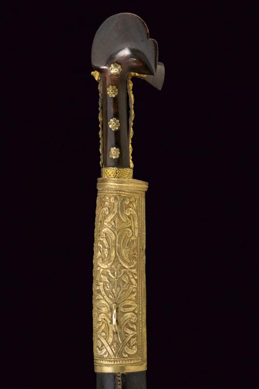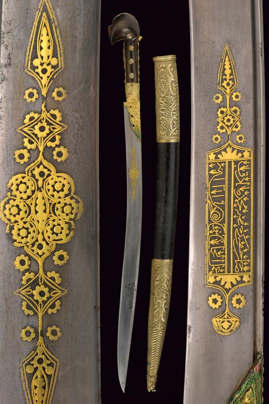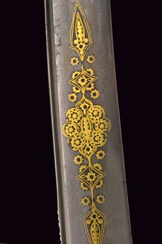 Yatagan ottomano opera di Haji Nuh, datazione: 1814 provenienza: Turchia, Lama curva a un filo con sguscio, decorata su ambo i lati con cartigli contornati da motivi floreali e geometrici rimessi in oro a koftgari, uno con iscrizione: 'Hadrat Muhammad Sadiq' - ' Opera di Haji Nuh - AH 1219 (AD 1804)'.Tipica impugnatura ad orecchi in corno bruno ornata da fornimenti in argento a vermeille con rosette e puntinature in bassorilievo. Fodero in legno rivestito di pelle nera con cucitura metallica a spirale, fornimenti in argento lavorati a sbalzo en suite con puntale a testa animale. Per altre opere di Haji Nuh vedi:Bonhams, Islamic and Indian Art, 8 April 2014, lot 183Sotheby's, Art of the Islamic World, 14 April 2010, lot 248Croatian History Museum, datato 1803-4, inv. No HPM/PMH-003080Tre altre spade citate in L.A. Mayer, Islamic Armoureres and their Works, Geneva, 1962,pag. 67 lunghezza 81 cm.