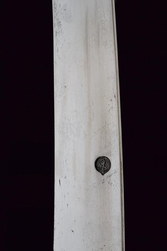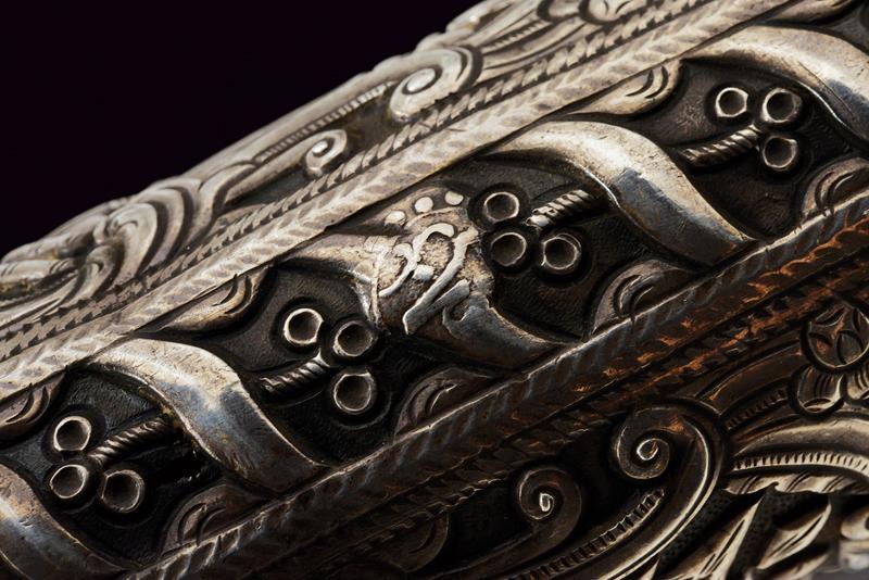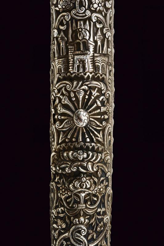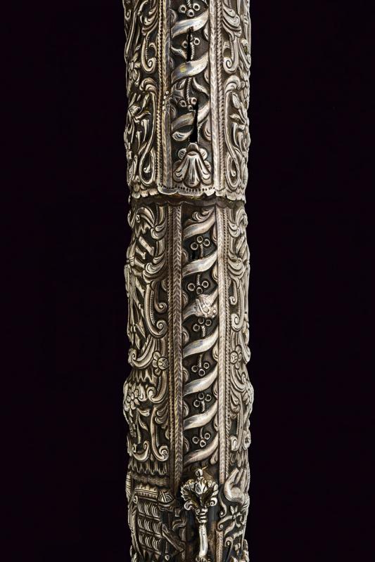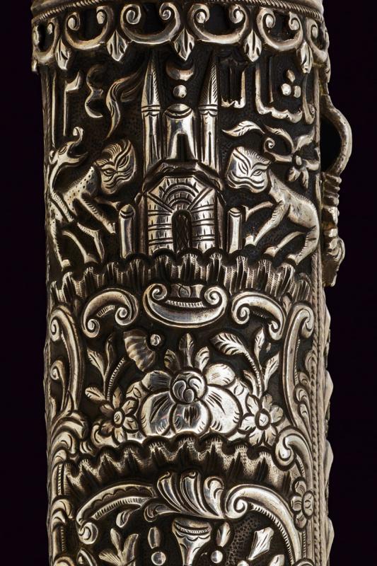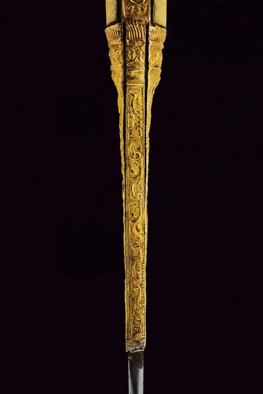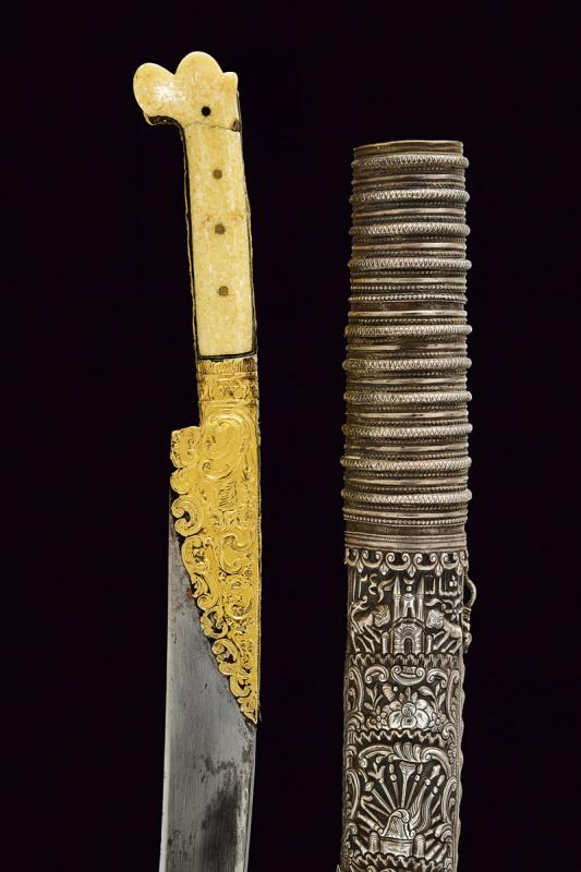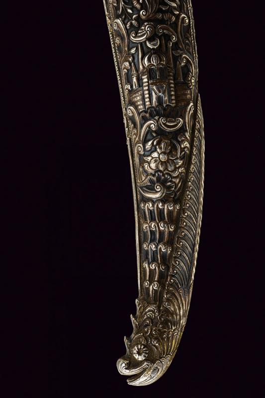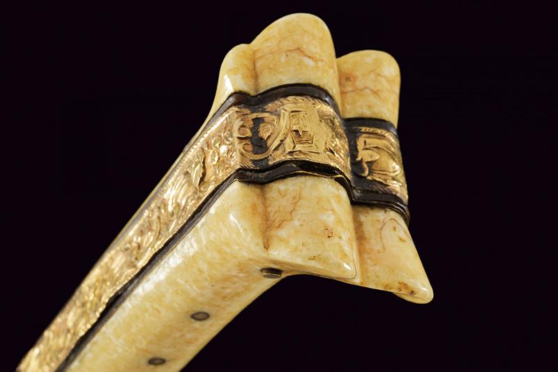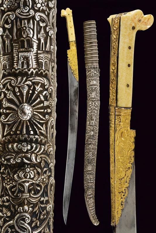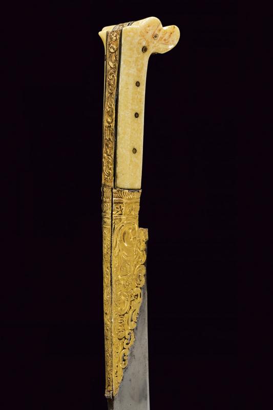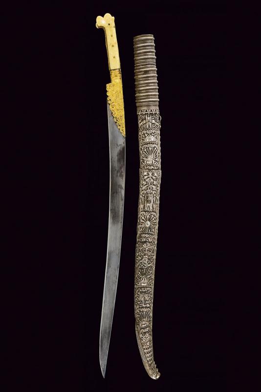 Importante yatagan con fornimenti in oro, datazione: Inizio del XIX Secolo provenienza: Turchia, Lama a un filo, di forma slanciata e lievemente controcurvata, a facce piane, e leggermente ingrossata verso il dorso, recante su un lato di punzone profondamente marcato di forma quasi circolare con un simbolo su base granulata. Il fornimento tutto rivestito da lamine d'oro. Le due bande che tengono la lama con belle decorazioni a rocaille e fiori in rilievo. Il dorso sempre in lamina d'oro, inciso en suite. Il collo tutto laminato d'oro con cornice a foglie. La banda centrale dell'impugnatura a rocaille. Guancette in avorio di tricheco a piccole orecchie con bordo a due lobature. Imponente fodero in argento. La cappa tutta lavorata ad anellature in argento in rilievo e in filigrana. Il resto della superficie con decorazioni a tema navale e militare in rilievo: in alto una moschea affiancata da due grandi velieri sul mare, poi un grande trofeo di lance e bandiere con shamshir e cannoni. In seguito le decorazioni si differenziano sulle due facce: da un lato un grande ornamento floreale e a rocaille, dall'altro una moschea e una panoplia. In seguito altri trofei d'armi, cornucopie e moschee. Il puntale lavorato a mostro marino. Il fodero è munito di vari punzoni. Il dorso con tipico piccolo passante. Il fodero reca inoltre un punzone tipo Tughra, una data in numeri arabi (probabilmente 1246 , 1830 nel calendario gregoriano) e una breve iscrizione sempre in caratteri arabi. Sicuramente l'arma di un'importante nobiluomo ottomano. lunghezza 76 cm.