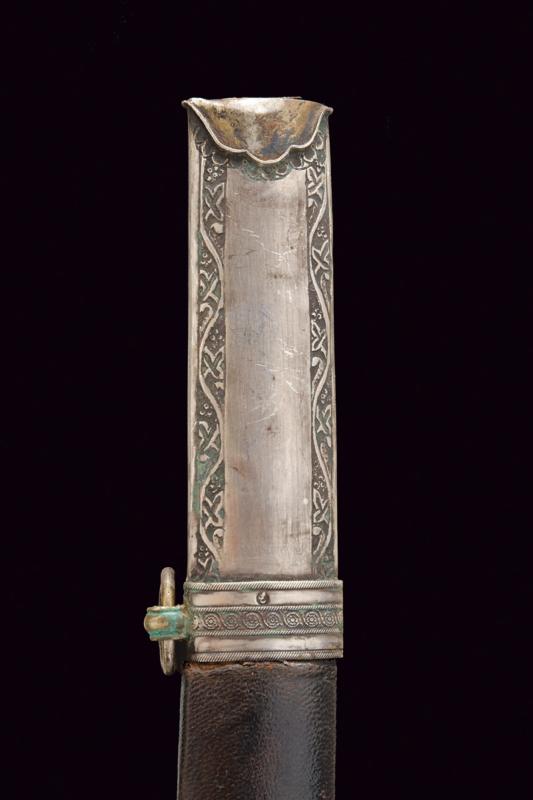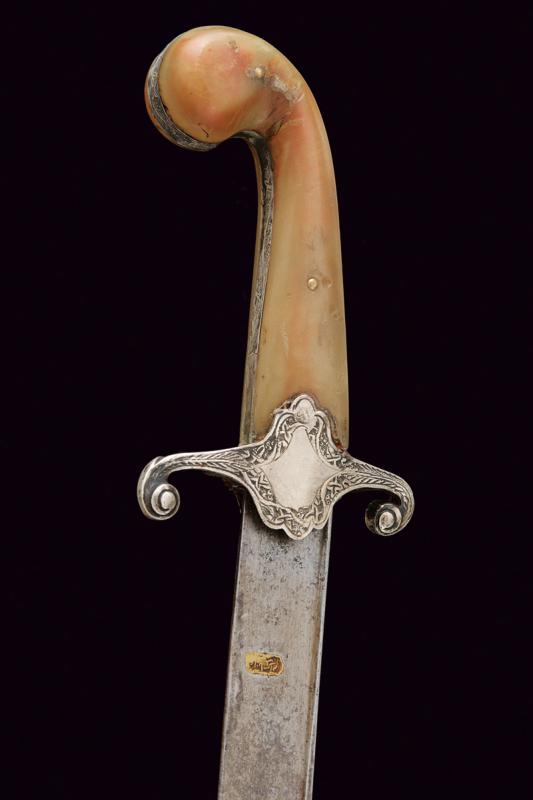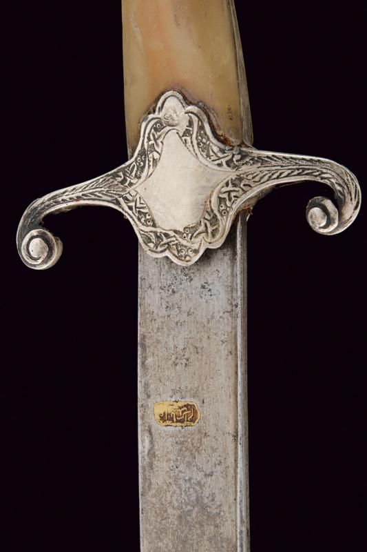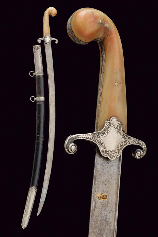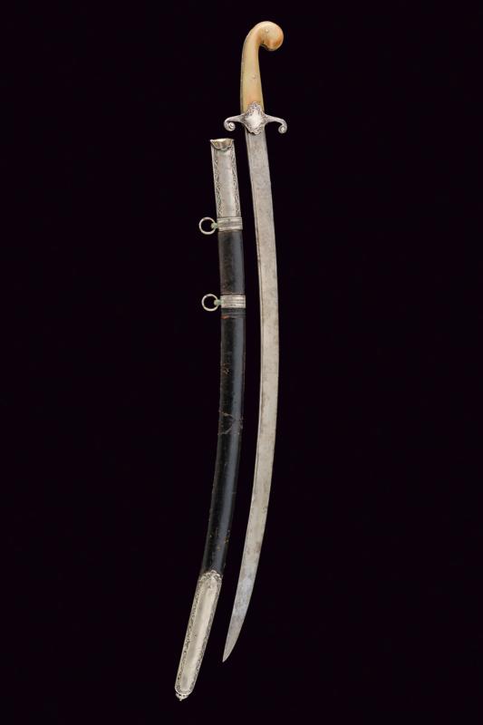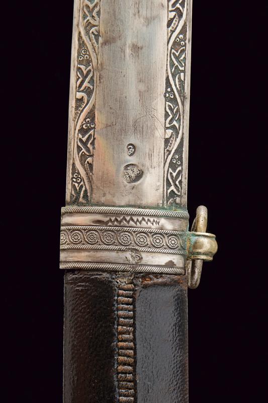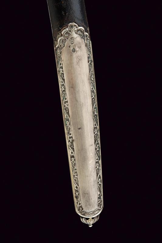 Shamshir con fornimenti in argento, datazione: Seconda metà del XIX Secolo provenienza: Turchia, Lama leggermente curva a un filo in damasco, con dorso leggermente lavorato a 'T', la base con punzone arabo rimesso in oro. Fornimento in argento finemente inciso e con punzone arabo. Guancette in corno, la cornice probabilmente restaurata. Fodero in legno rivestito di cuoio cucito con filo metallico, con fornimenti in argento inciso a motivi floreali e muniti di punzoni. Due anelli di sospensione. lunghezza 91 cm.