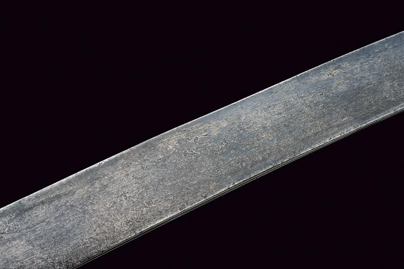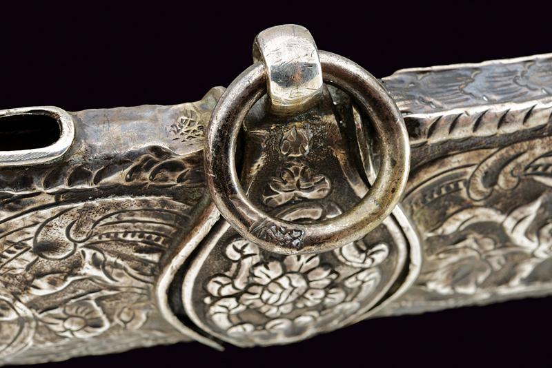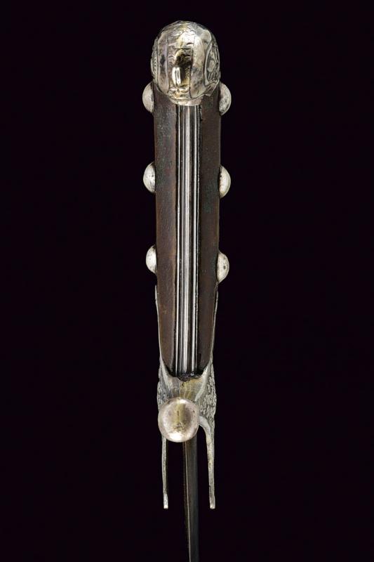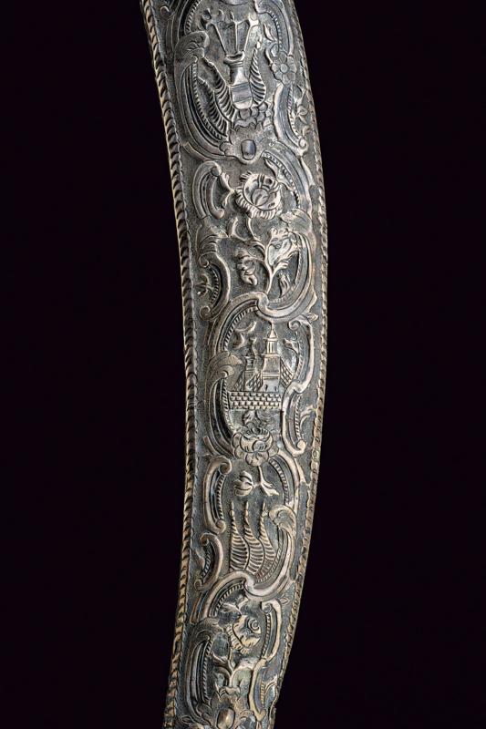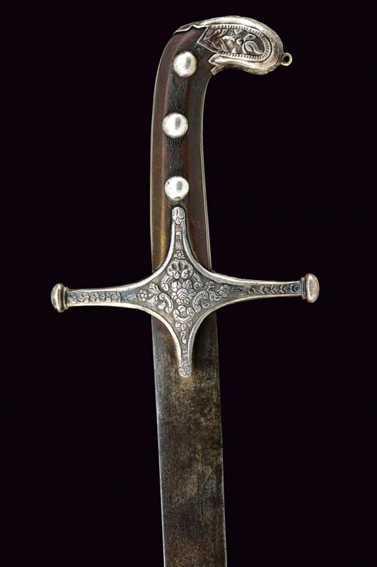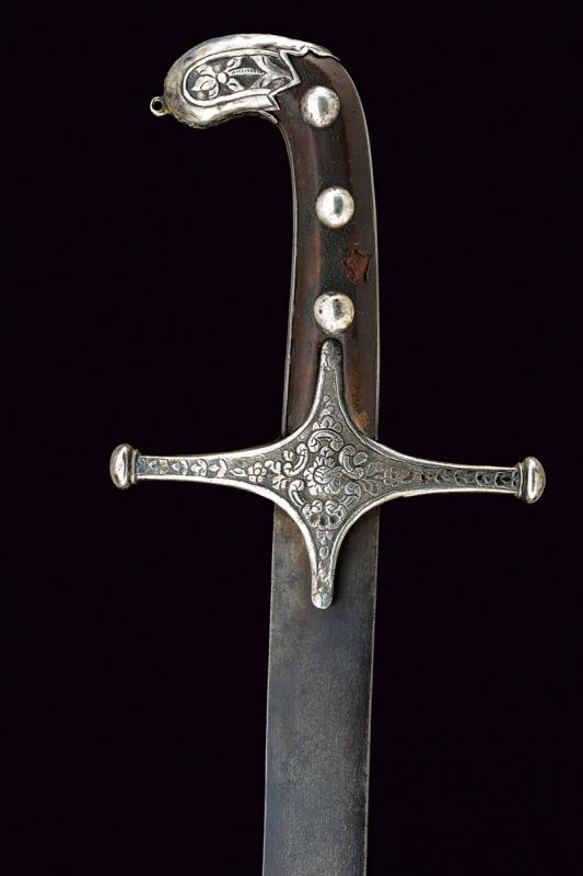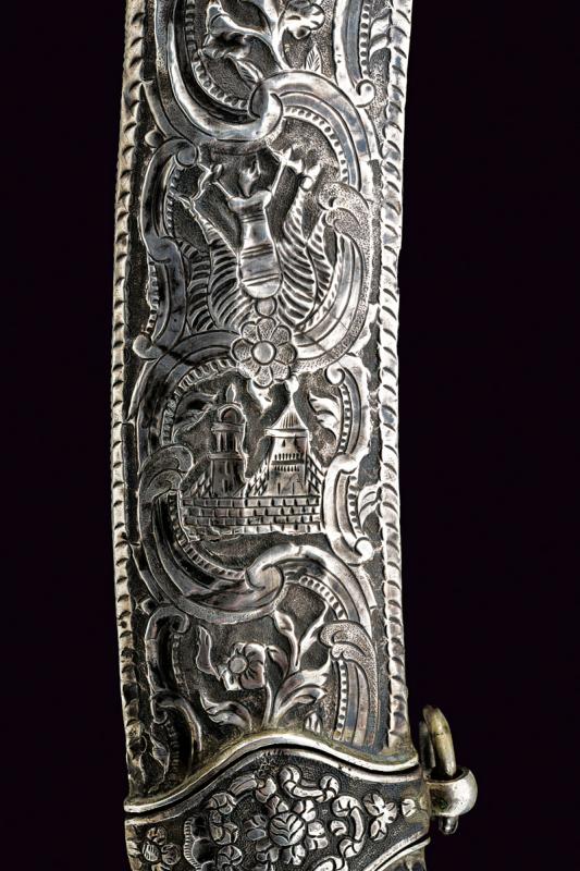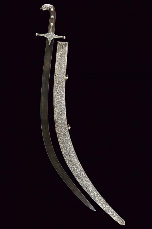 Shamshir con fornimenti in argento con decorazioni a tema militare, datazione: fine del XVIII Sec. provenienza: Turchia, Ampia ed elegante lama curva in fine damasco wootz, a un filo e facce piane. Elso in argento con alette fermafodero e bracci dritti terminanti a bulbo; la superficie anteriore e il retro finemente decorati a fiorami in rilievo su fondo a granuli. Resti di Tughra su un lato. Guancette in legno rivestite con cuoio antico (lieve mancanza su un lato), tenute da tre borchiette in argento. La banda centrale e il cappellotto sempre in argento, quest'ultimo lavorato come l'elso e munito di un piccolo passante. Bel fodero in legno completamente rivestito di lamina d'argento (lievissima mancanza sul retro). Riccamente lavorato in rilievo e inciso con una fitta trama di rocailles che racchiude all'interno varie raffigurazioni: trofei di cannoni e bandiere, fiori di vario tipo, città fortificate e minareti, trofei di lance e alabarde. Le due fascette lavorate come l'elso della spada e munite di campanella (una campanella recante anche punzone). Resti di marchi anche sul fodero. lunghezza 88 cm.