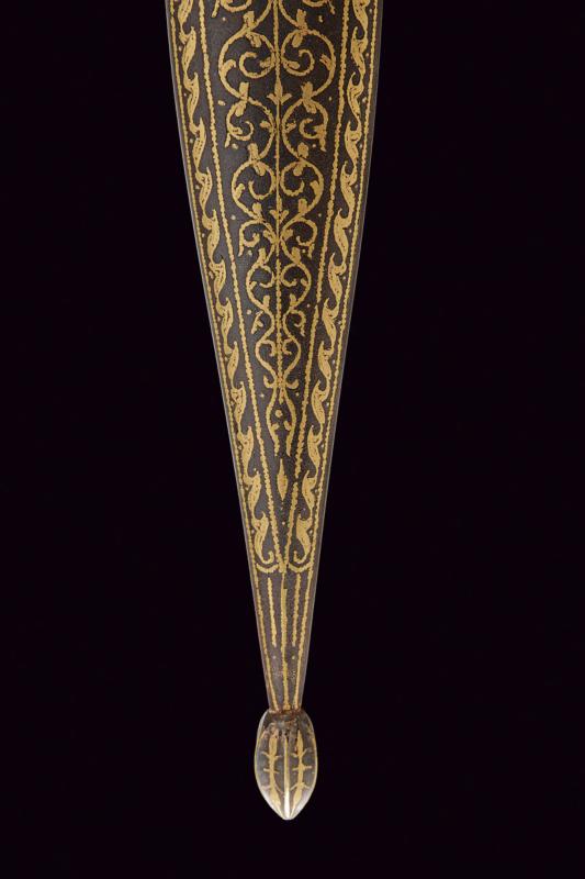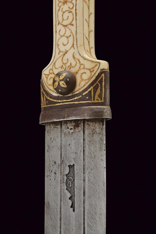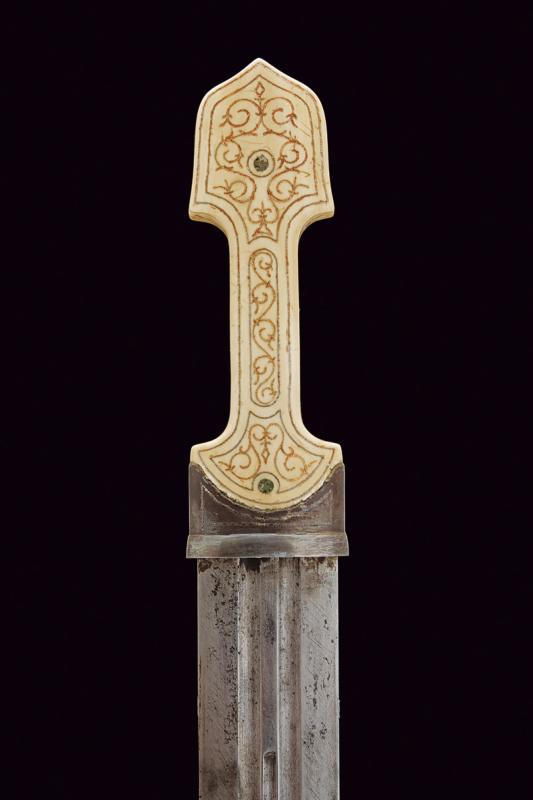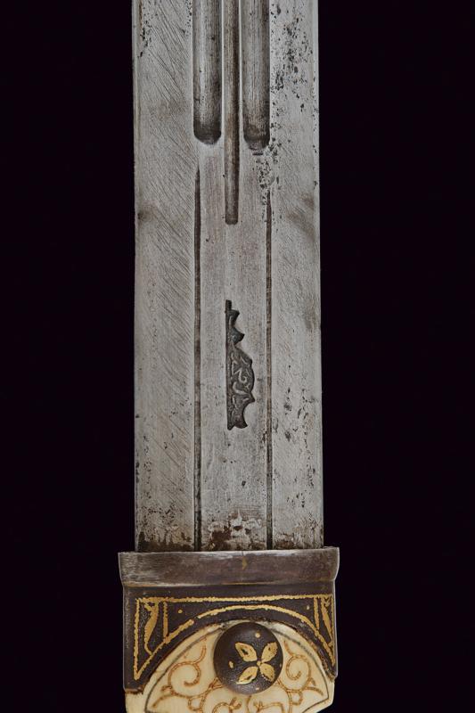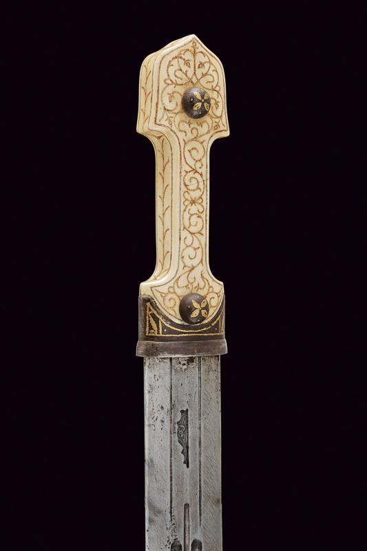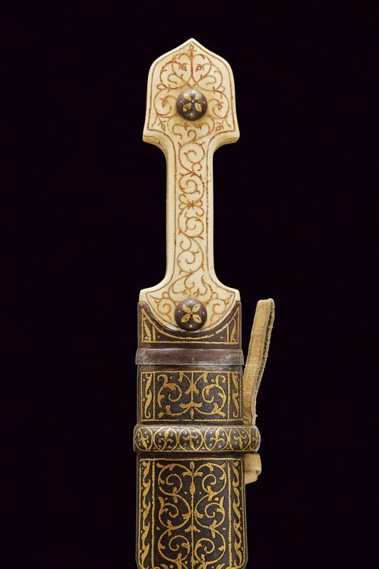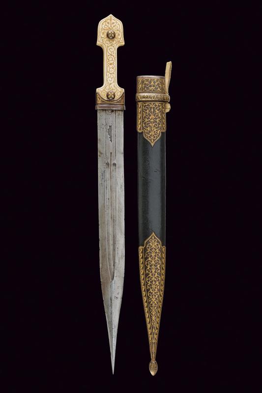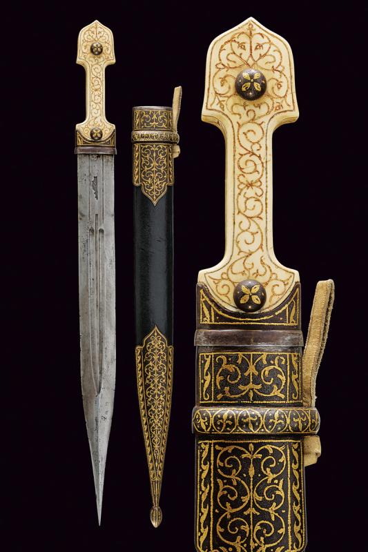Kubachi kindjal, datazione: ultimo quarto del XIX Sec. provenienza: Daghestan, Lama dritta a due fili con tre scanalature e profonda marca araba alla base in terza; tipica impugnatura in avorio decorata con incisioni dorate, ghiera e rivetti in ferro decorati in oro. Fodero in legno ricoperto di cuoio con fornimenti in ferro decorati en suite. lunghezza 56.5 cm.