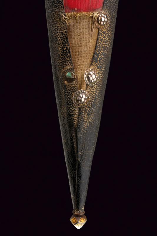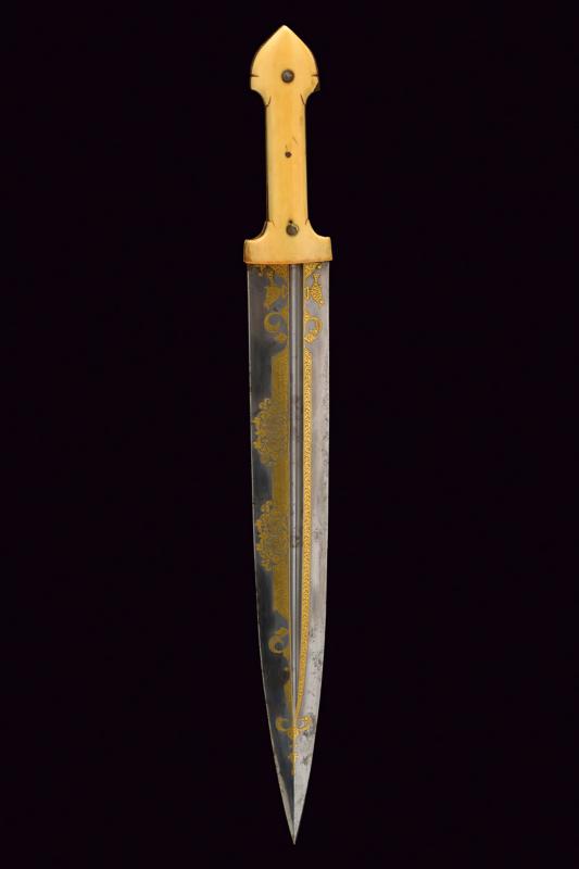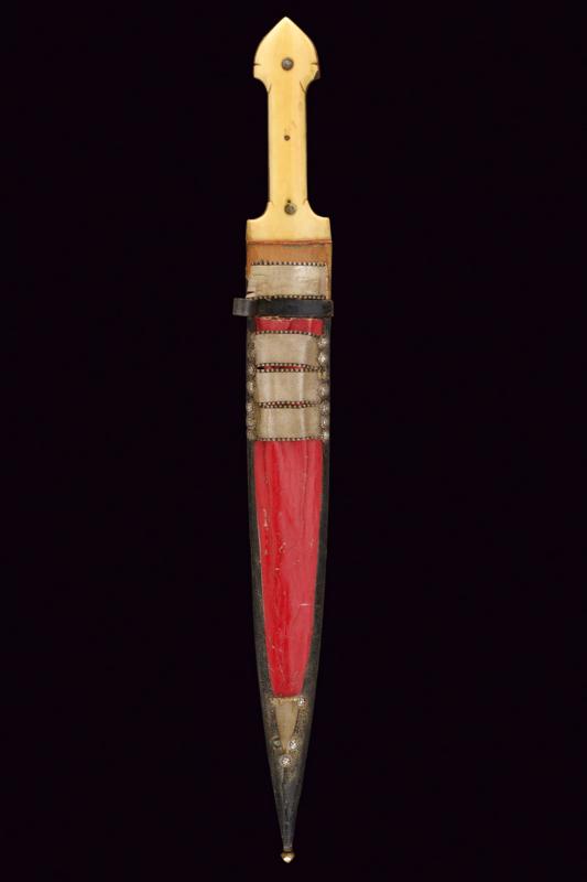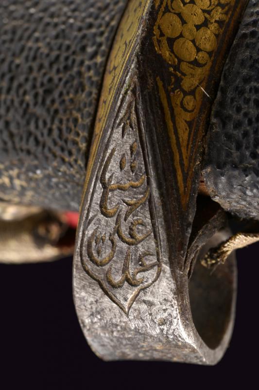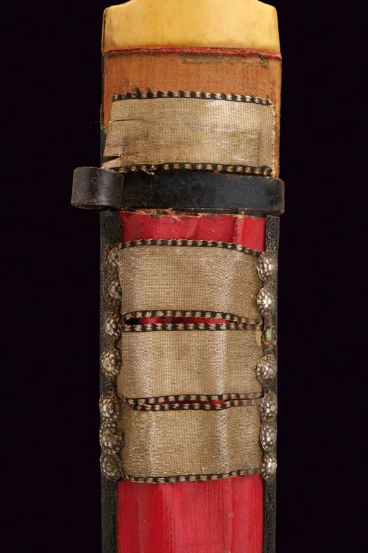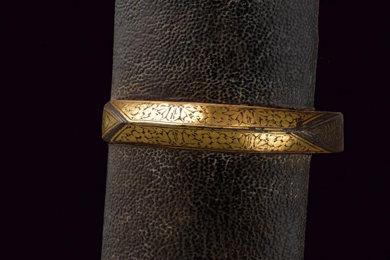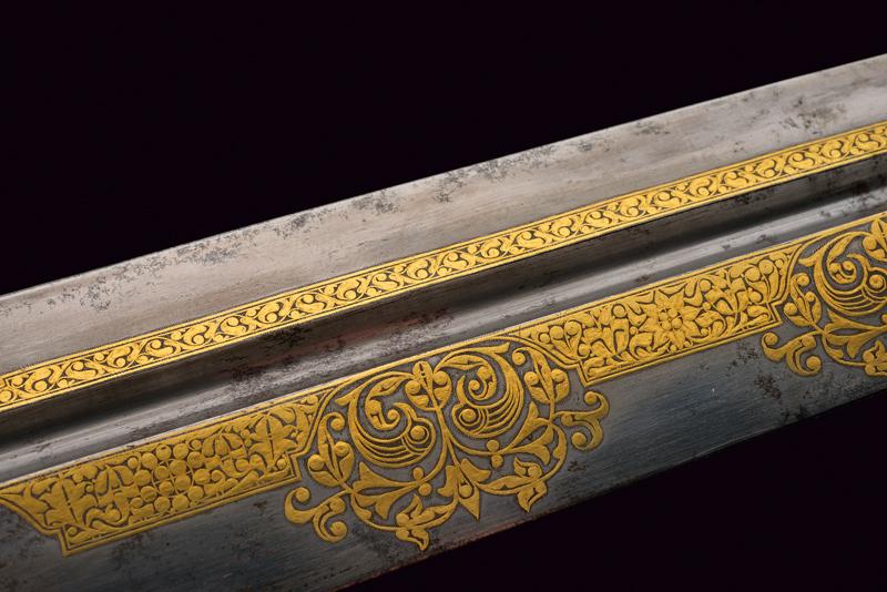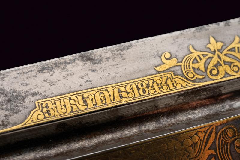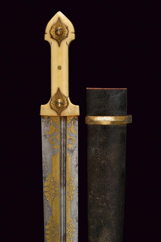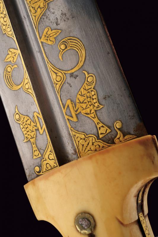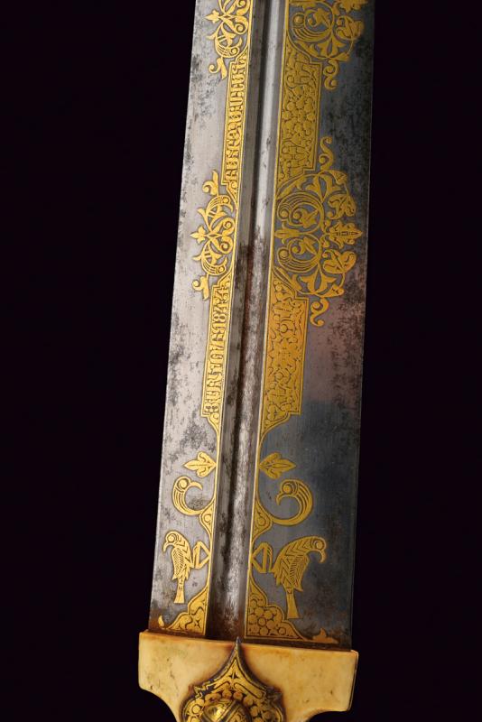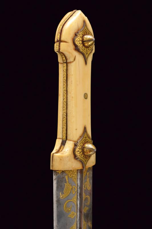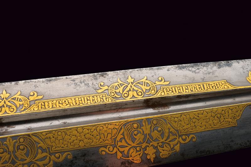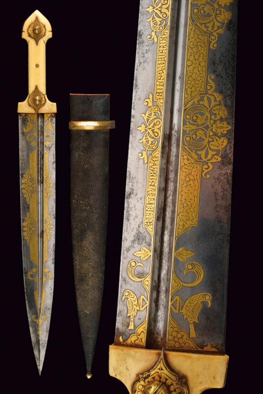 Bellissimo Qama , datazione: 1844 provenienza: Armenia, Lama a due fili con sguscio centrale, ornata per tutta la lunghezza da belle decorazioni in oro a koftgari di uccelli e volute con motivi floreali; su un lato tre cartigli recanti iscrizioni in lingua armena sempre rimessi in oro: 'Agop 1844' - 'Tamirianz' - 'Barghamian'.Impugnatura in osso (tricheco) con perni ogivali e basette geometriche ornate in oro. Fodero in legno con rivestimento in pelle nera al recto e rossa al verso. Bottone del puntale e passante in ferro en suite con motivi in oro a koftgari. Il passante reca incisa la firma: 'Amal-e-Ali Shah' (opera di Ali Shah). I maestri armeni erano assai apprezzati e rinomati alla corte imperiale russa. lunghezza 58 cm.
