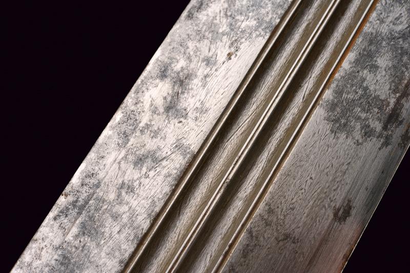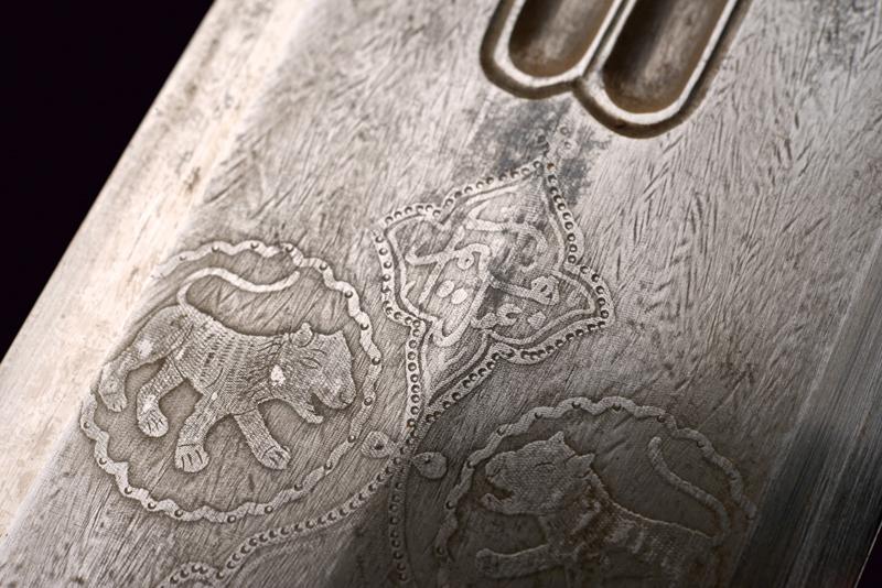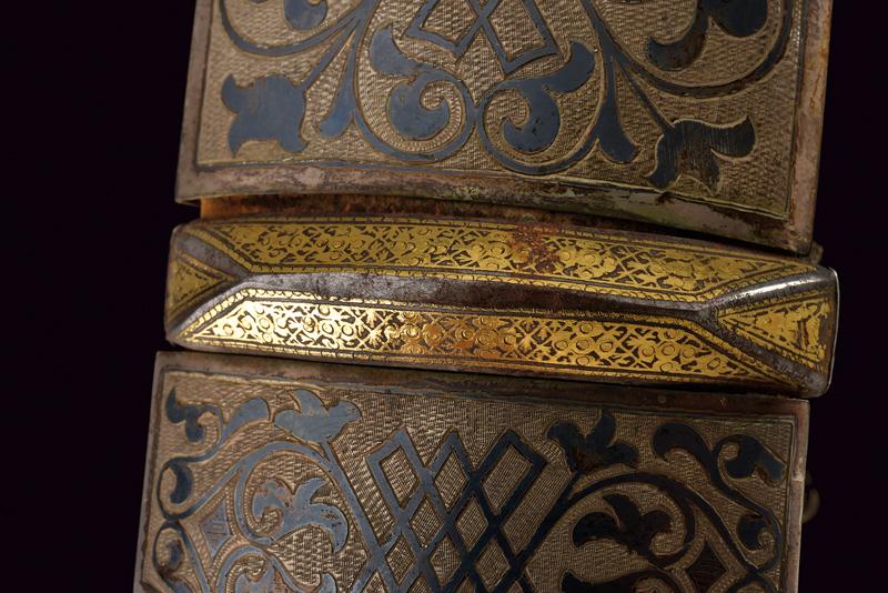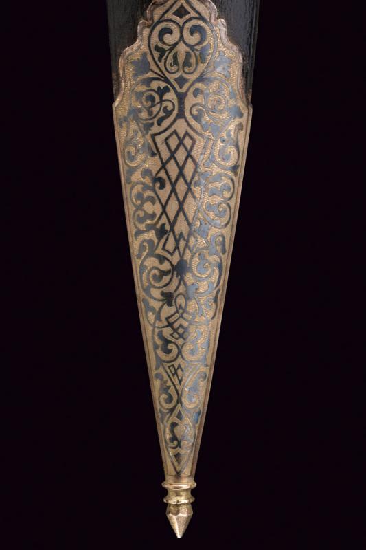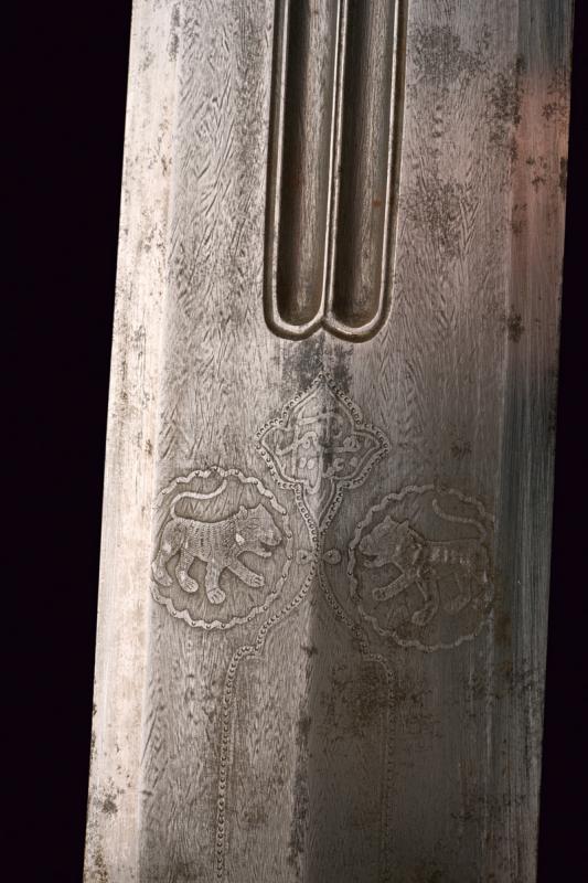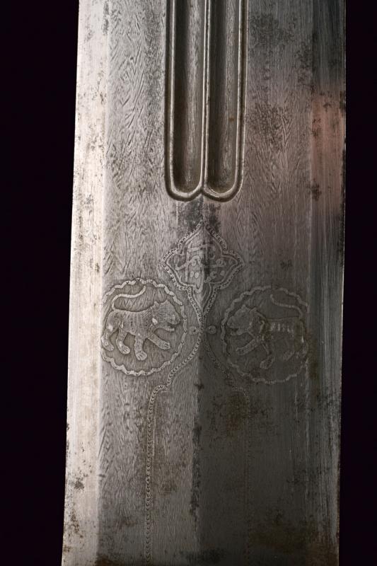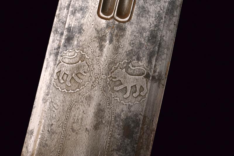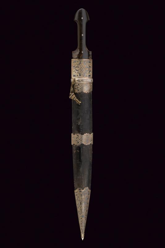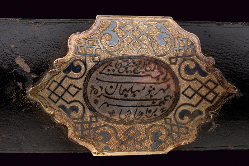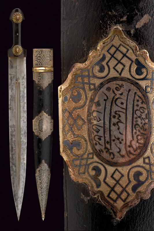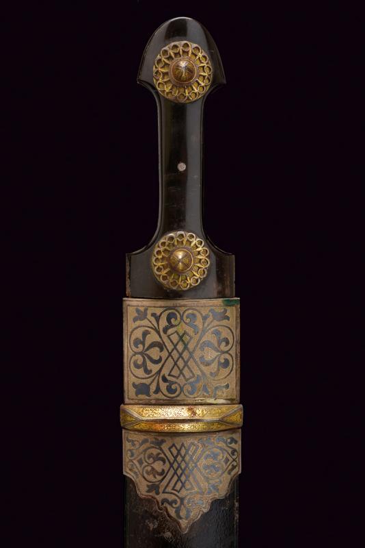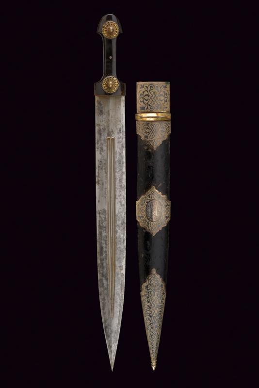 Raro e grande Qama Ottomano, datazione: primo quarto del XIX Sec. provenienza: Turchia, Lunga lama a due fili con doppio sguscio per quasi tutta la lunghezza e punta acuminata. Reca incisi sul forte due leoni affrontati entro tondi smerlati e cartigli sagomati su ambo le facce, uno dei quali con il nome dell' artefice: 'Amal-e Ibrahim' (opera di Ibrahim). Impugnatura con guancette in corno bruno con perni ad ogiva sgusciati e basette circolari e decorate da filettature in oro. Fodero in legno rivestito di pelle nera con fornimenti in argento niellati a figure geometriche. L' ovale del cartiglio centrale reca l'iscrizione 'If'tha lana bi haqq hamilaha rahmatan fa huwa min Suleyman' (Apri per noi con la Verità per colui che porta questa spada con la Misericordia poiché è da Suleyman) lunghezza 72 cm.