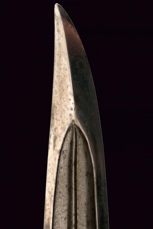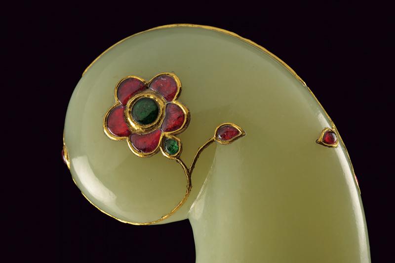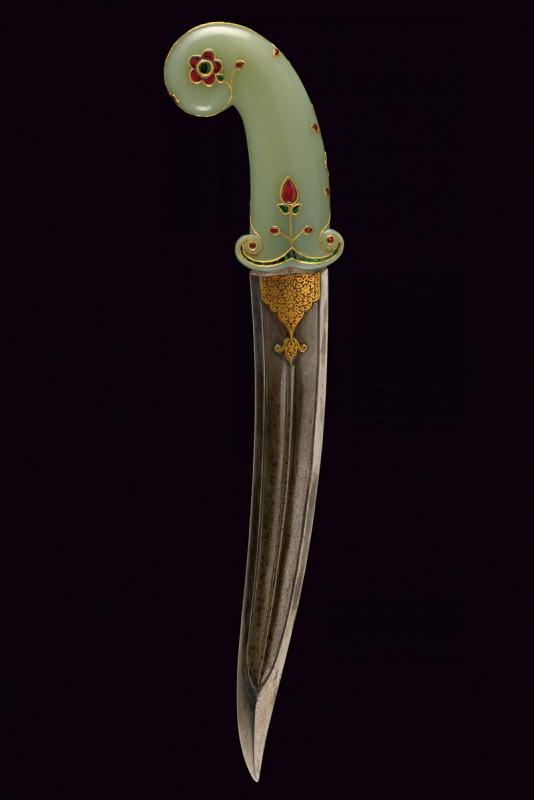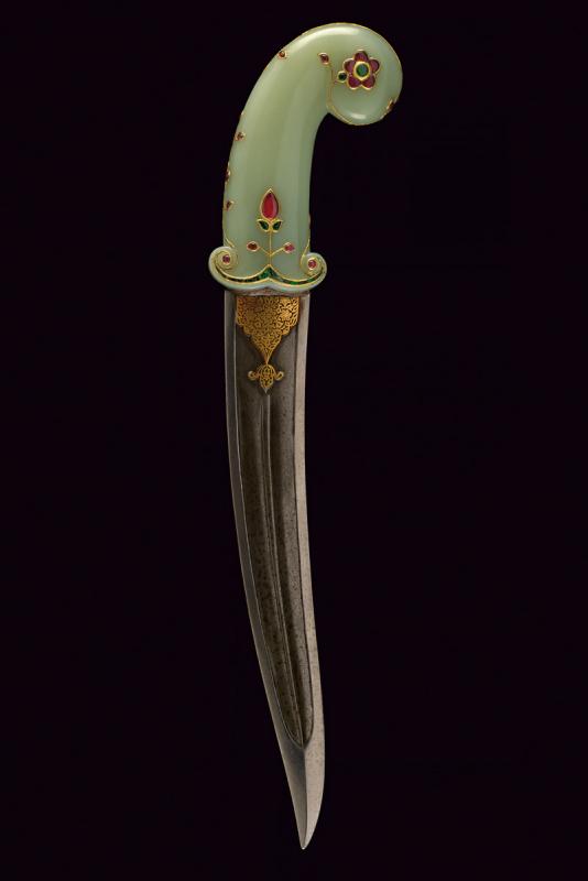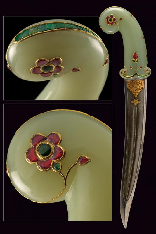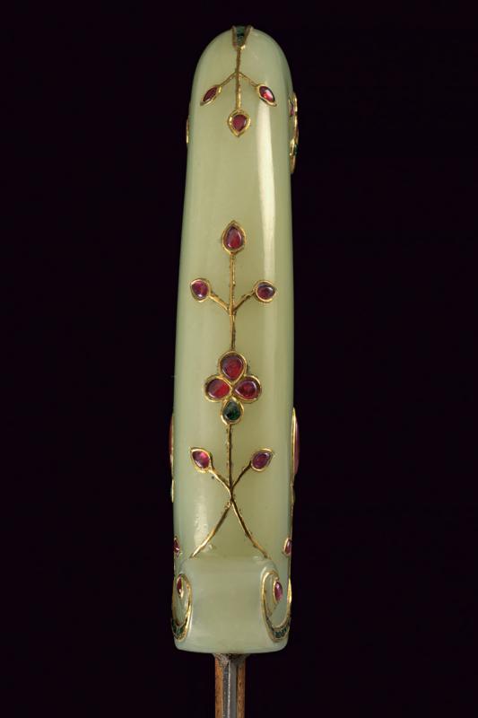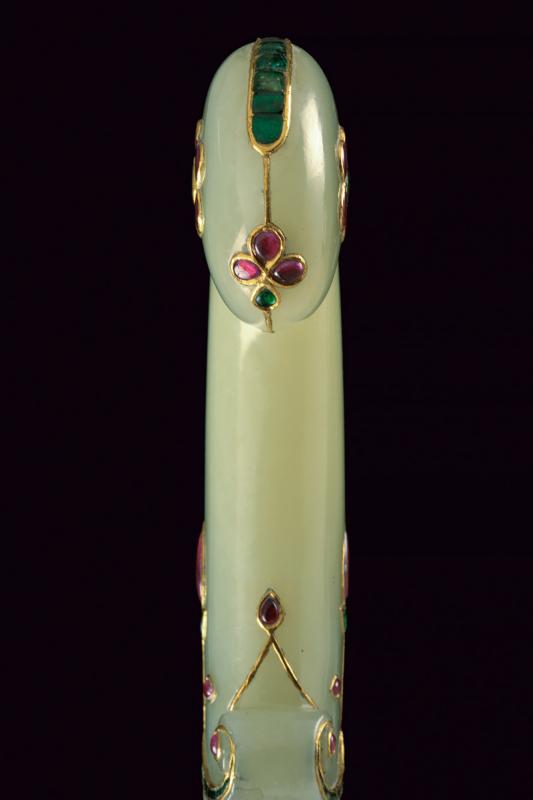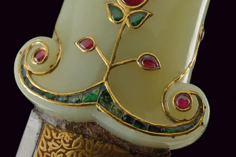 Bellissimo kandshar con impugnatura in fine giada decorato con pietre preziose e oro, datazione: Prima metà del XIX Secolo provenienza: India Moghul, Lama curva a due fili in finissimo damasco con larga scanalatura e nervatura in mezzeria, la punta costolata e leggermente rinforzata, la base con fornimento in bassorilievo finemente inciso e dorato a motivi floreali. Impugnatura di forma tipica con pomo angolato, in finissima giada di colore molto omogeneo, decorata con pietre verdi e rosse a motivi floreali, con cornici e rami in oro giallo. Vedi un esemplare con una decorazione molto simile in 'Islamic and Oriental Arms and Armour' di Robert Hales, pag. 26 no. 65. lunghezza 40.3 cm.