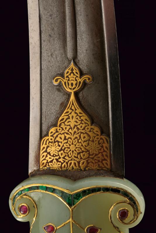 Bellissimo kandshar con impugnatura in fine giada decorato con pietre preziose e oro