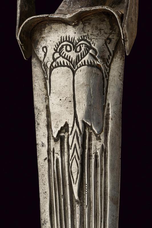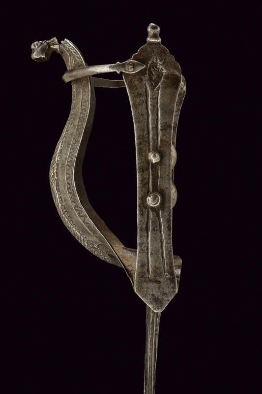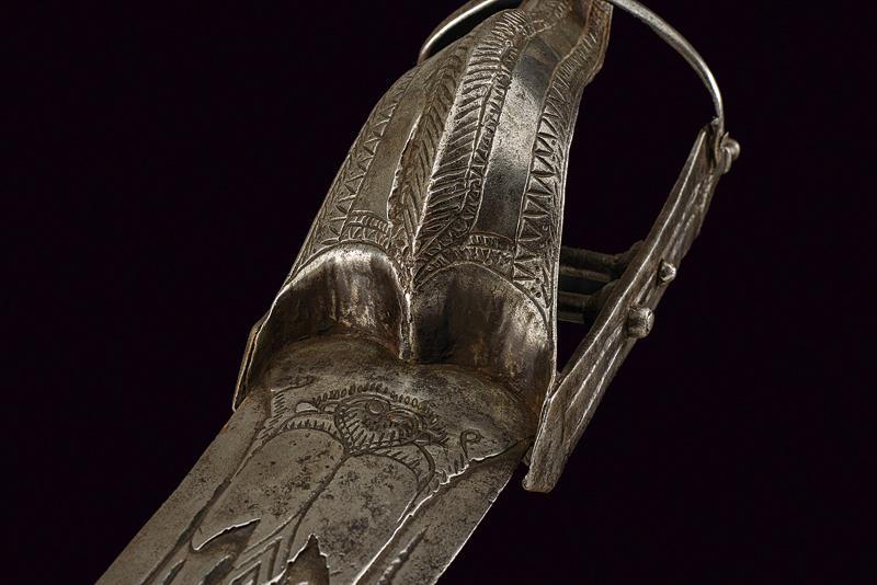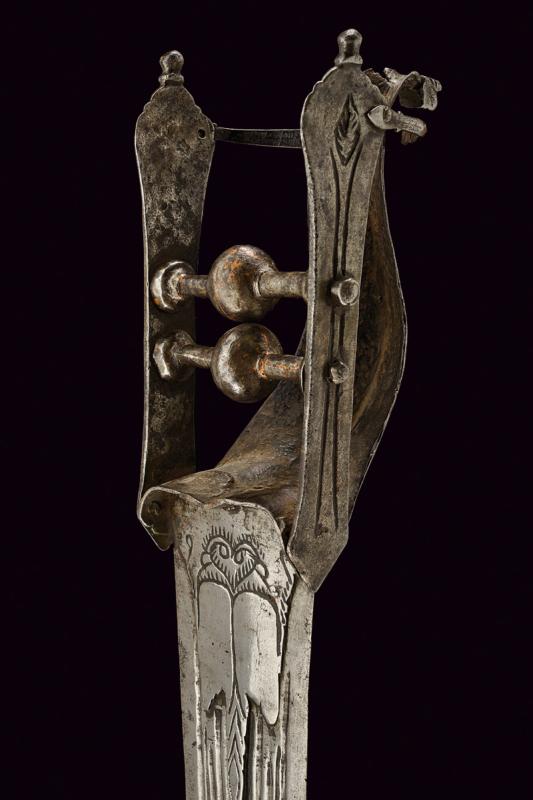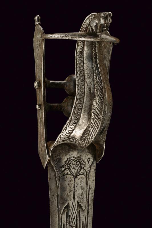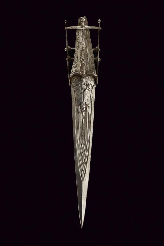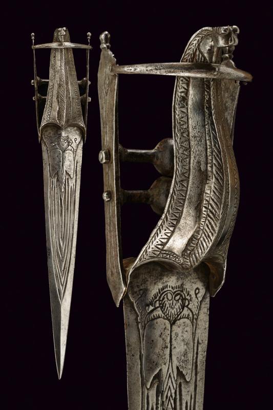 Vijayangara Tanjore katar, datazione: XVII Secolo provenienza: India, Lama triangolare con scanalature, la punta rinforzata e costolata; la base incisa; tipica impugnatura in ferro con vela incisa e doppia traversa. lunghezza 51.5 cm.