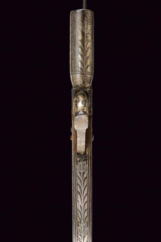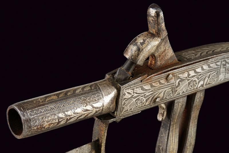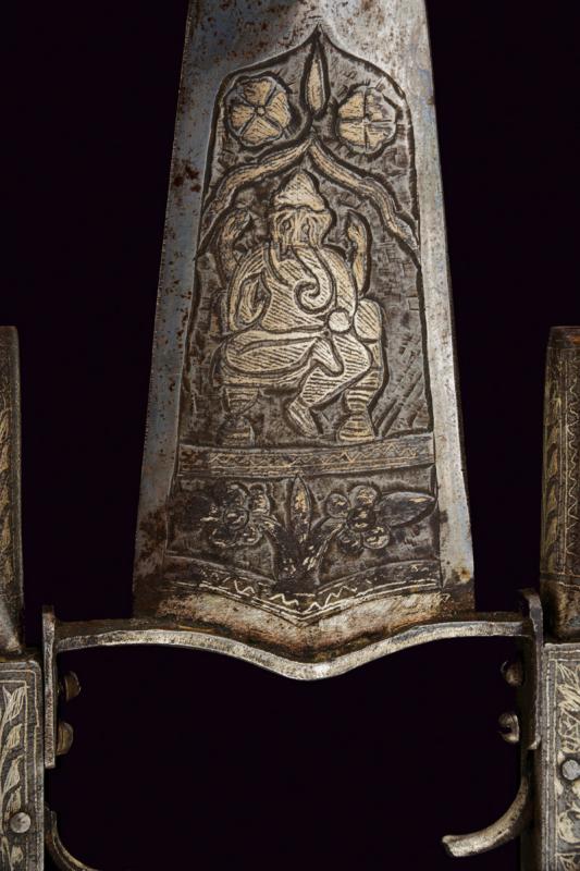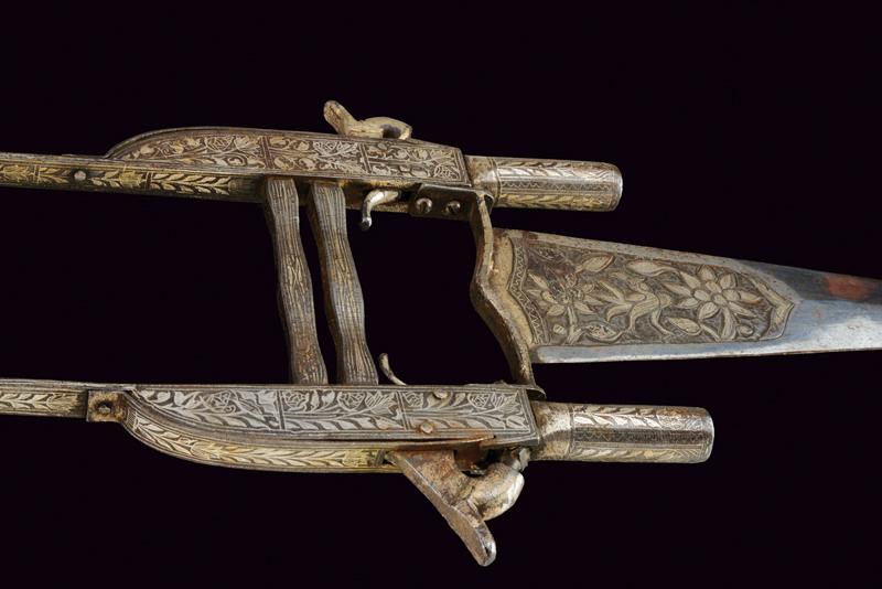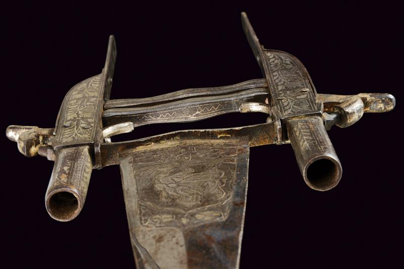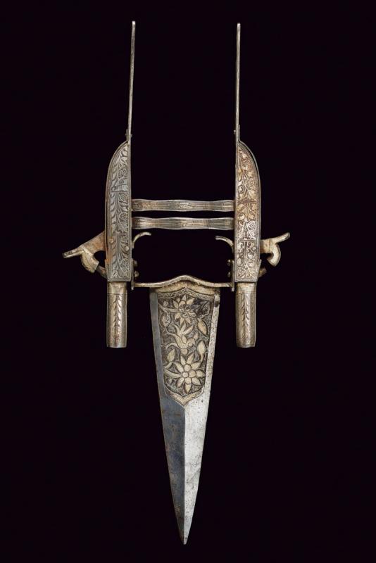 Katar munito di due pistole a luminello, datazione: Fine del XIX Secolo provenienza: India, Lama di forma tipica a due fili con punta rinforzata e base intagliata con un elefante, un volatile e motivi floreali. Impugnatura con due traversi, i lati muniti di semplici pistole a luminello. Pistole e impugnatura decorato in argento a motivi floreali e geometrici. Interessante. lunghezza 48.5 cm.